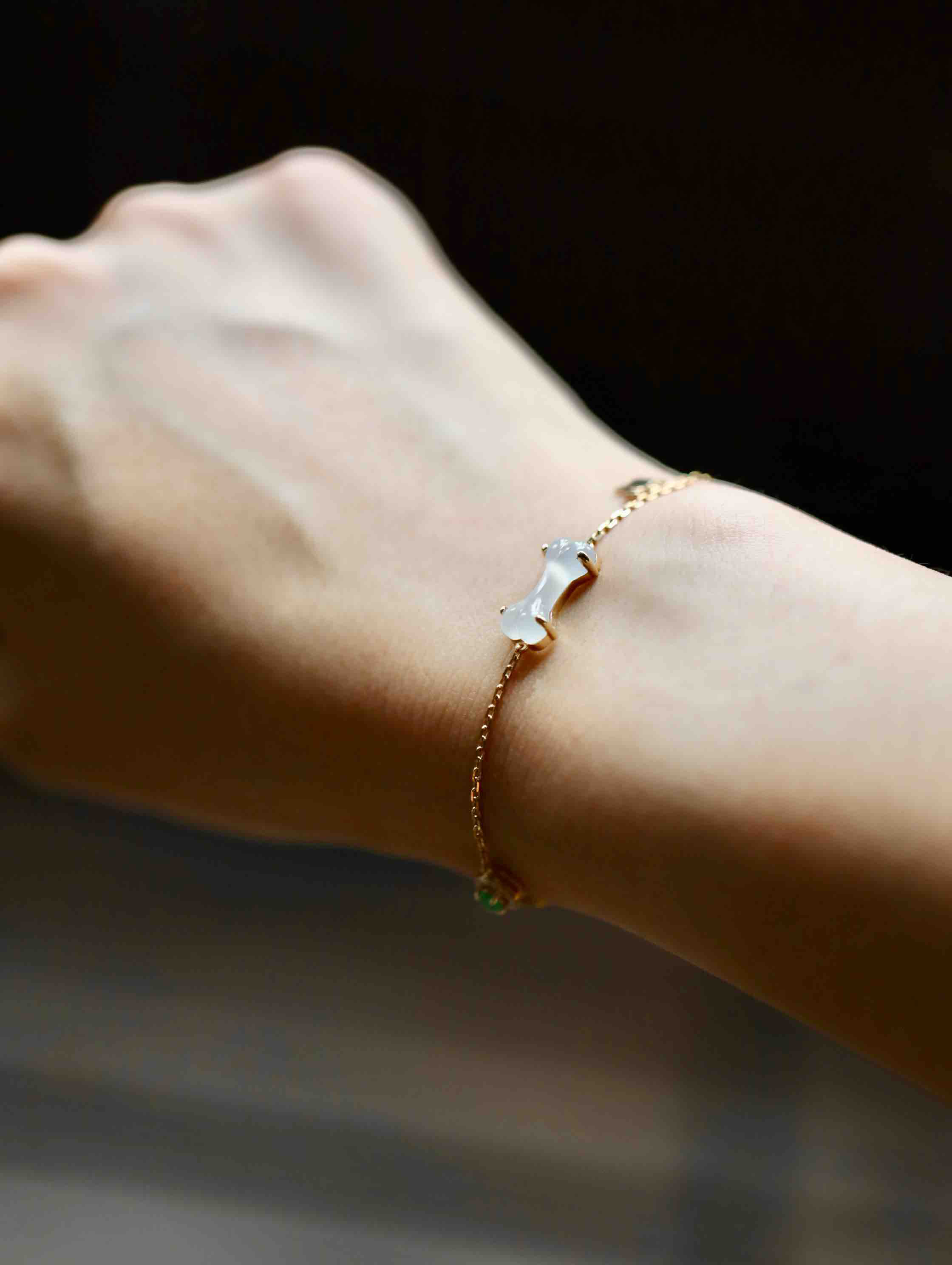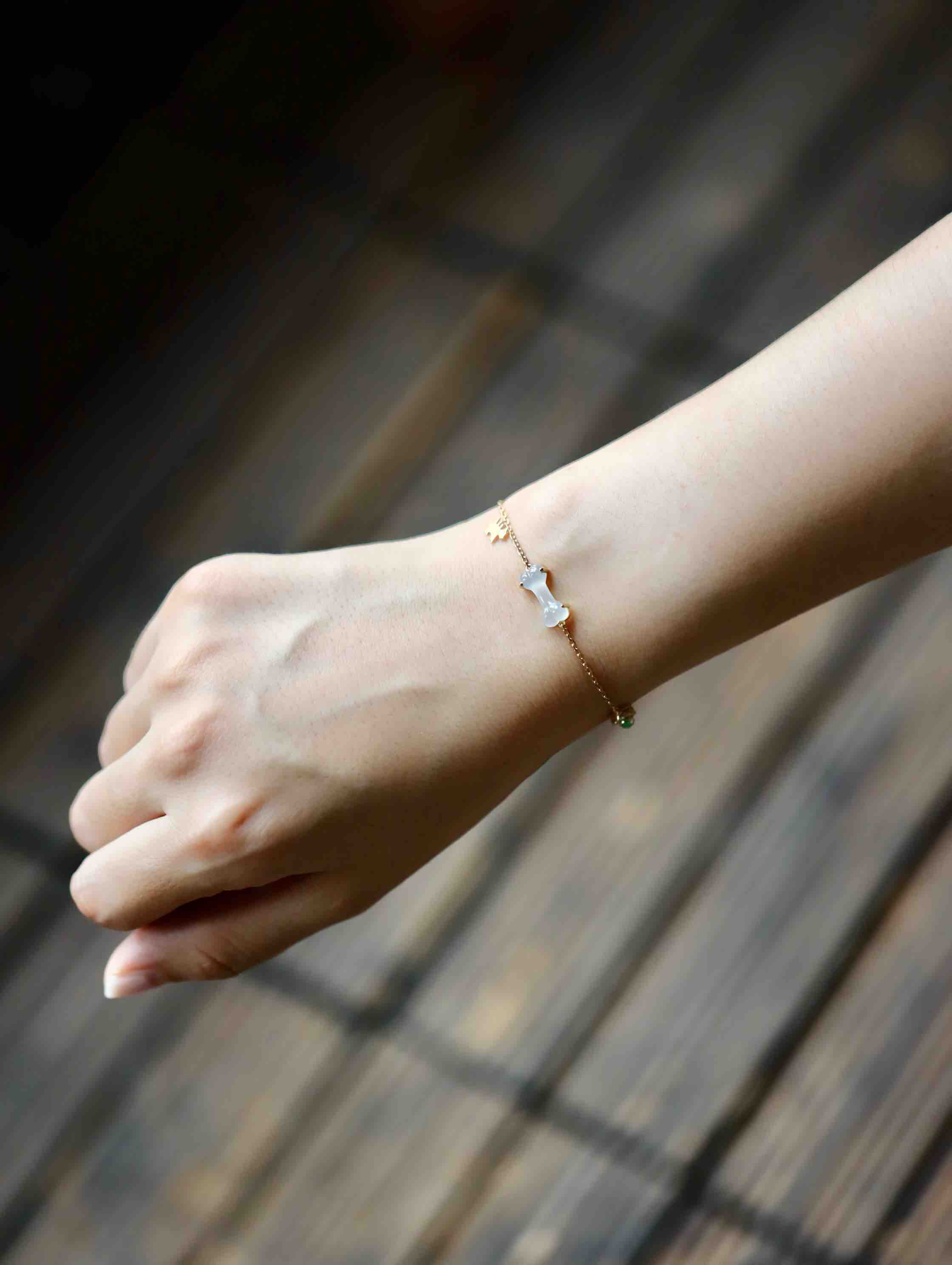 狗狗题材的作品,不多见,为属狗和爱狗人士准备,冰种翡翠手工精雕的骨头棒实在太萌了,种水晶莹剔透,尺寸厚实立体,18k黄金钻石镶嵌,一个狗狗小牌,和骨头棒交相呼应,搭配阳绿翡翠蛋面和大颗钻石画龙点睛,翡翠14.4×7.3×3.5mm,链长15cm加2.5cm,不同手腕尺寸都可以戴