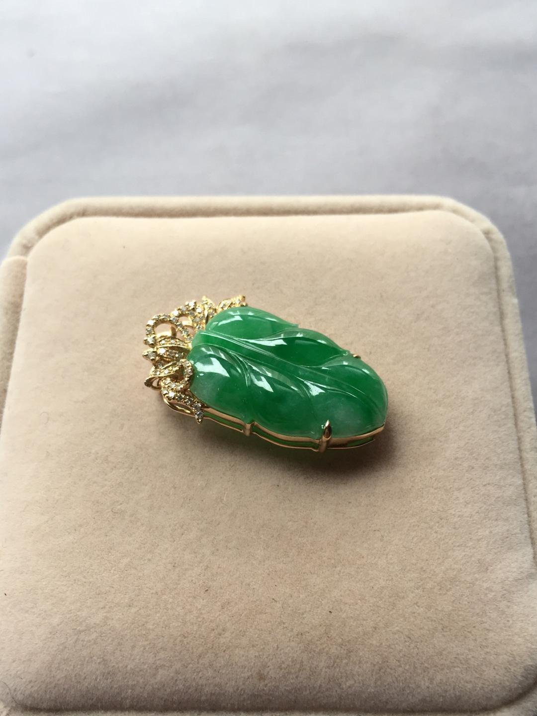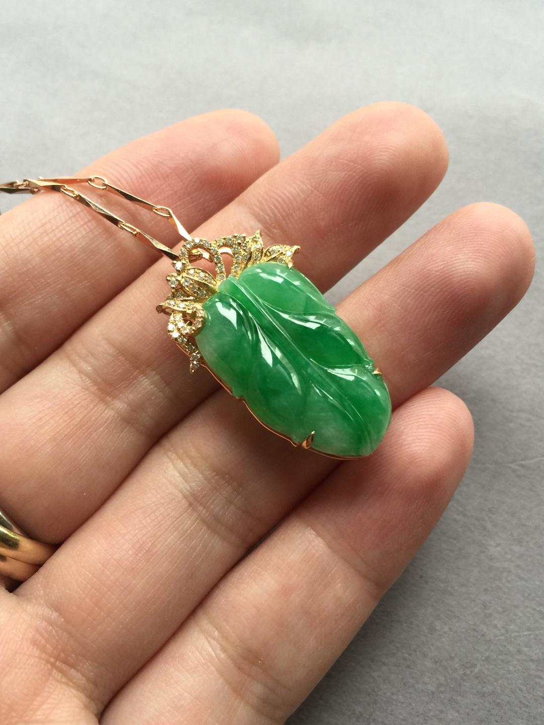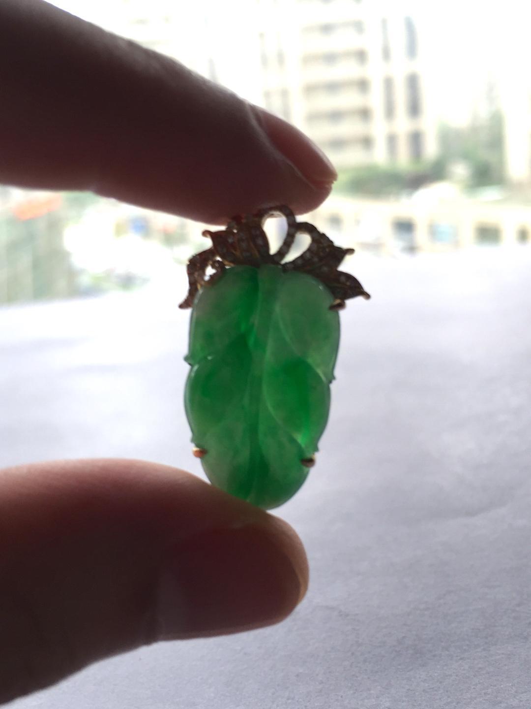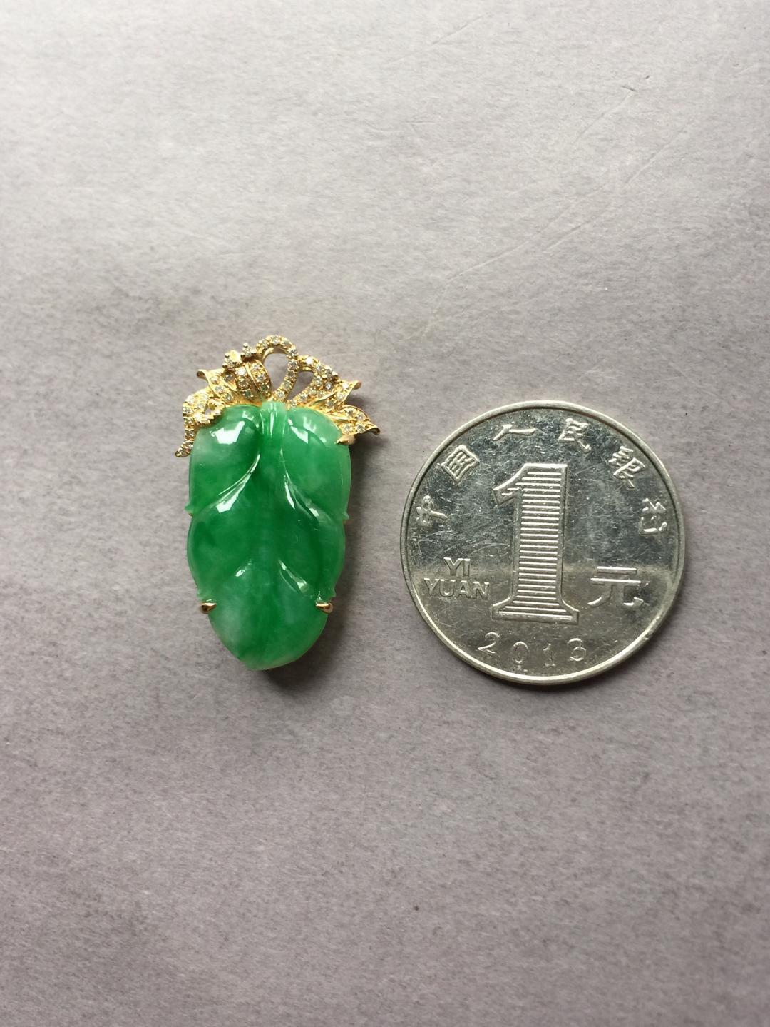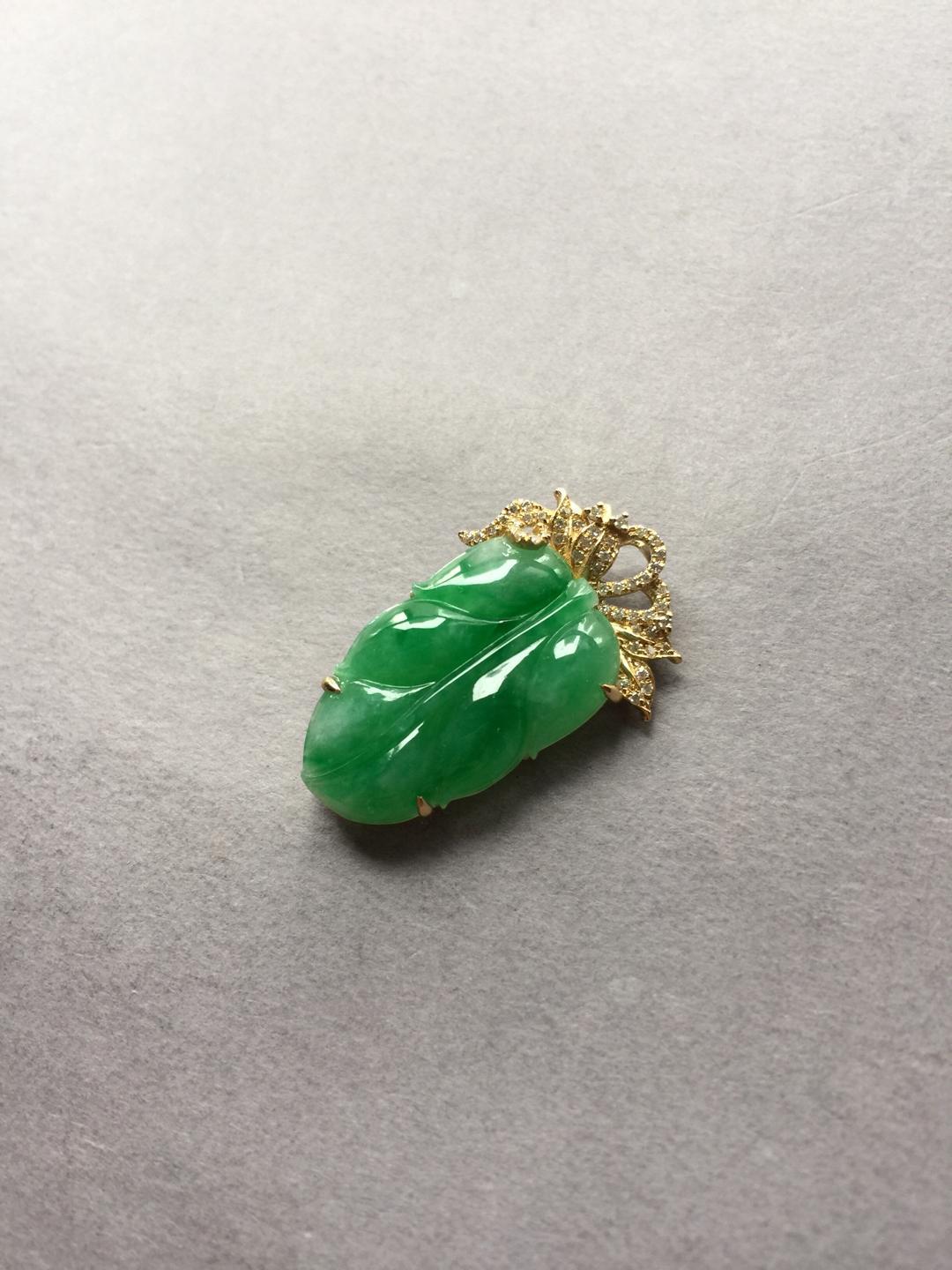 翡翠冰种阳绿叶子吊坠胸针两用款,24.2*14.8*4mm,镶嵌后30.4*19*8.2mm。是吊坠也是胸针,这样的颜色和种水,不容错过,18k黄金钻石镶嵌,款式别致靓丽,阳绿艳丽抓人眼球,叶子造型饱满,有点不明显的石纹,重要的是这阳绿真太给力了,特艳丽,在如今这样的行情下,没个五位数根本下不来,我们的价格简直惊喜