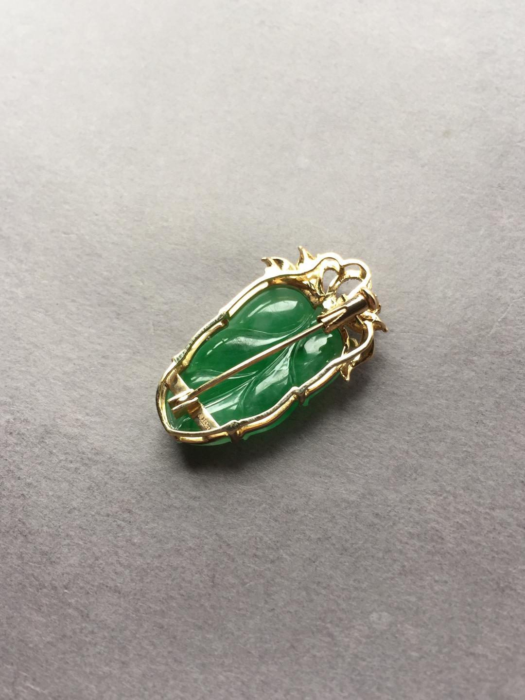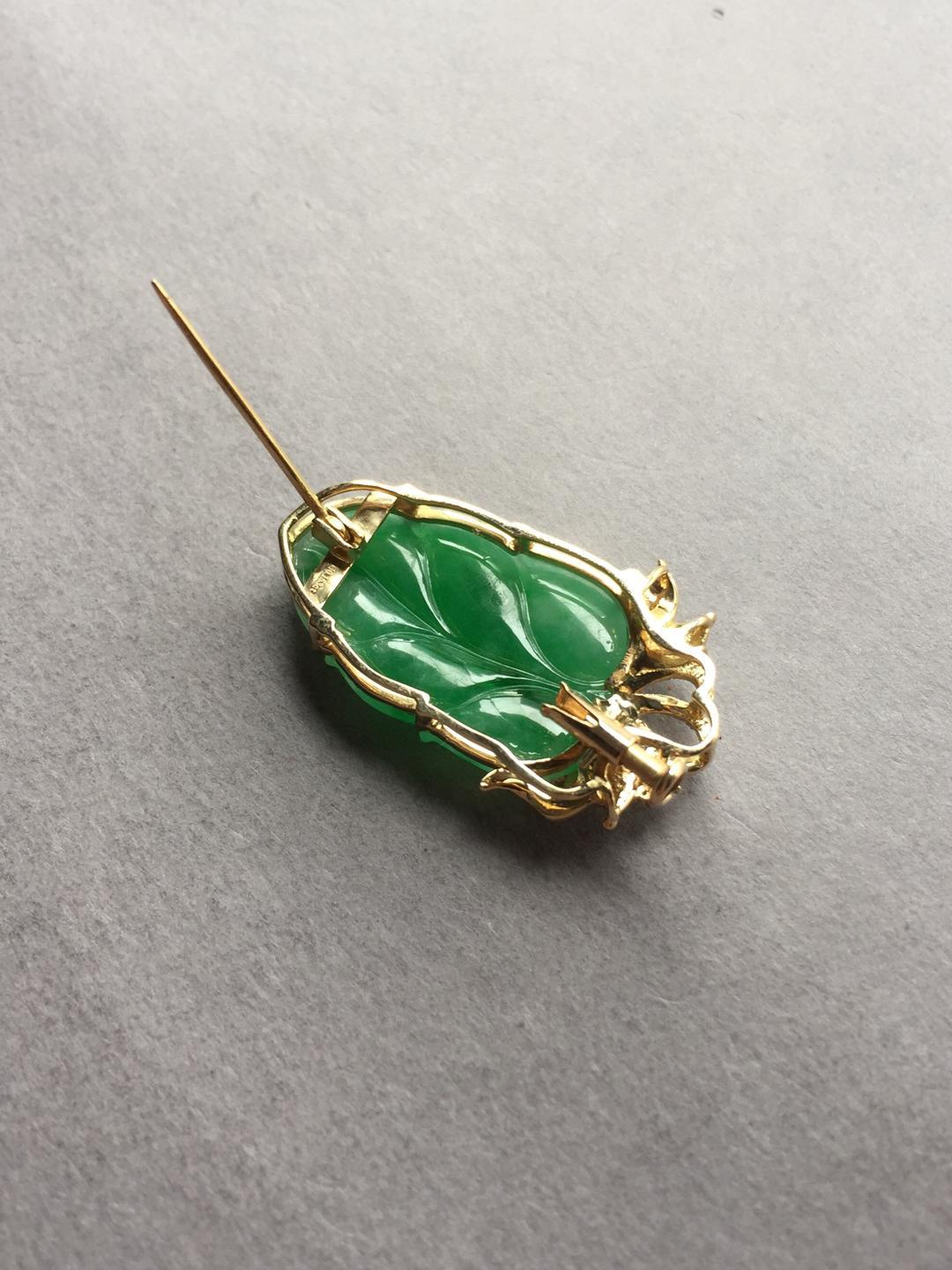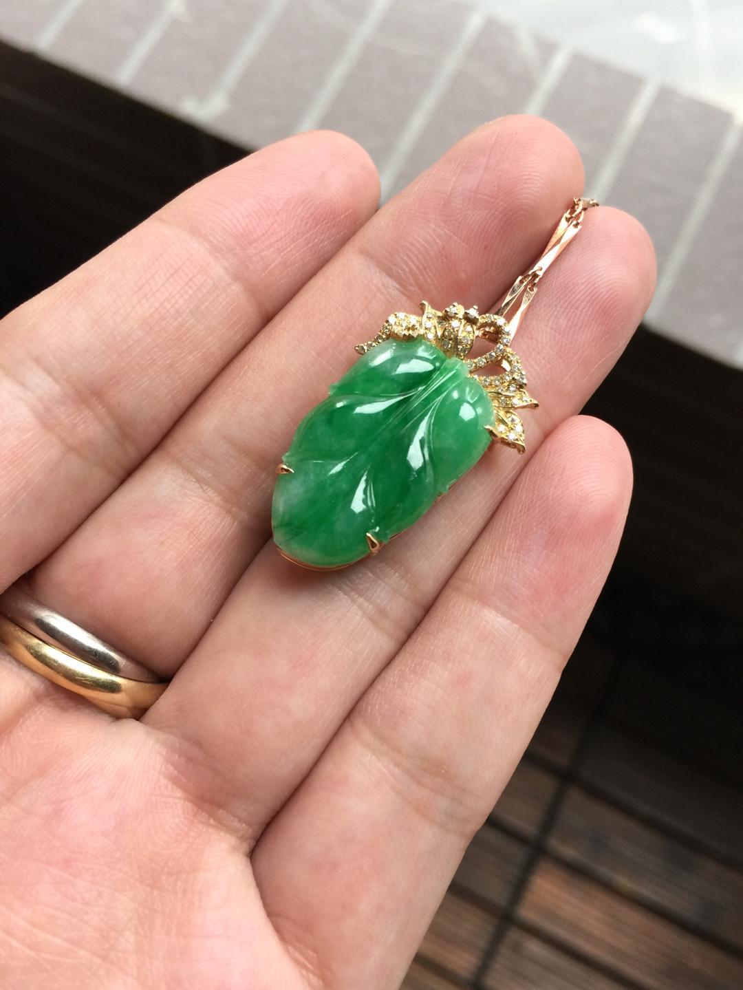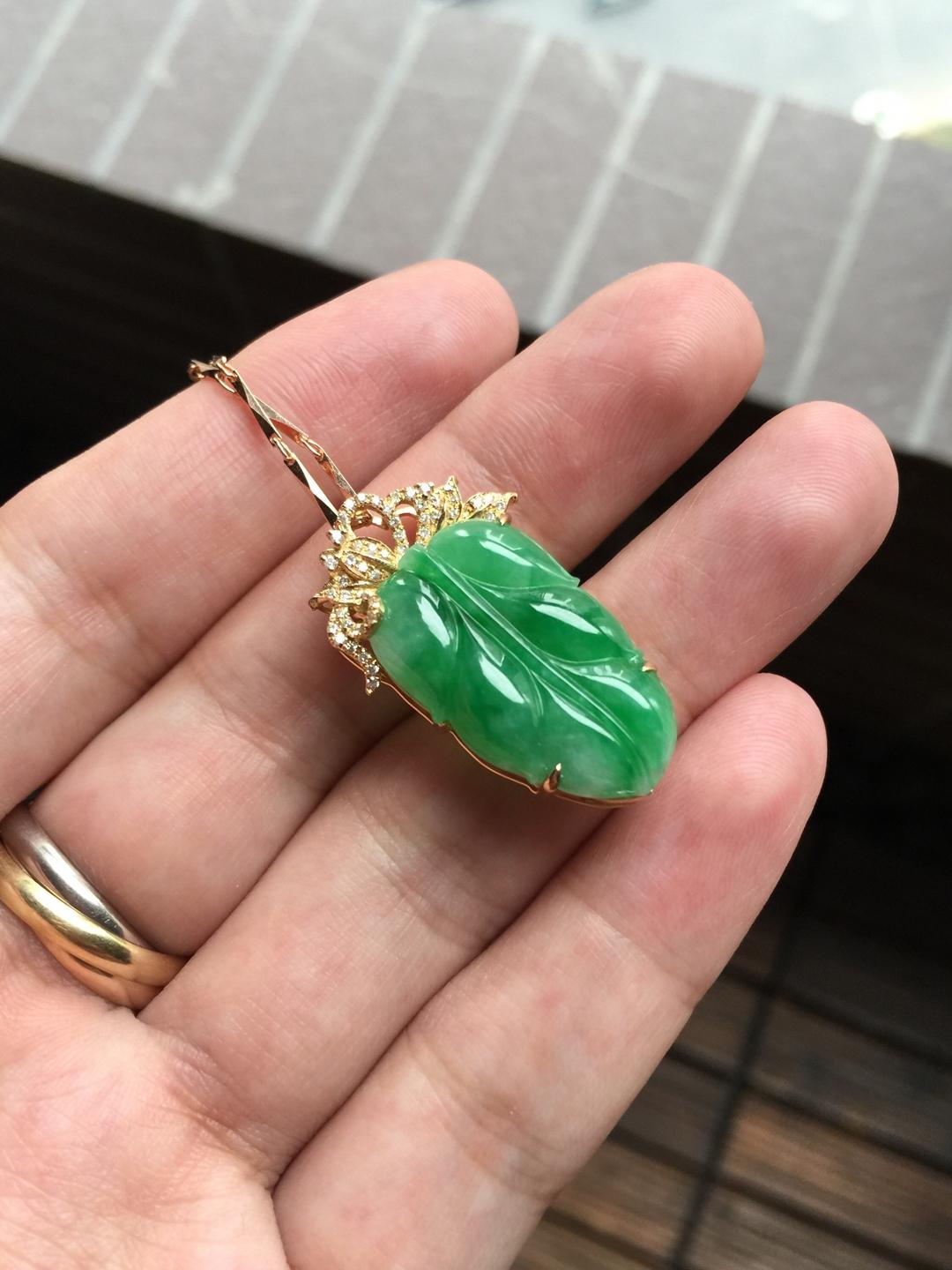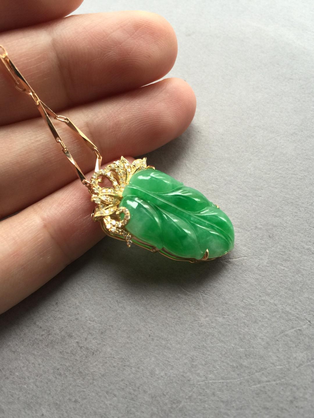 翡翠冰种阳绿叶子吊坠胸针两用款,24.2*14.8*4mm,镶嵌后30.4*19*8.2mm。是吊坠也是胸针,这样的颜色和种水,不容错过,18k黄金钻石镶嵌,款式别致靓丽,阳绿艳丽抓人眼球,叶子造型饱满,有点不明显的石纹,重要的是这阳绿真太给力了,特艳丽,在如今这样的行情下,没个五位数根本下不来,我们的价格简直惊喜