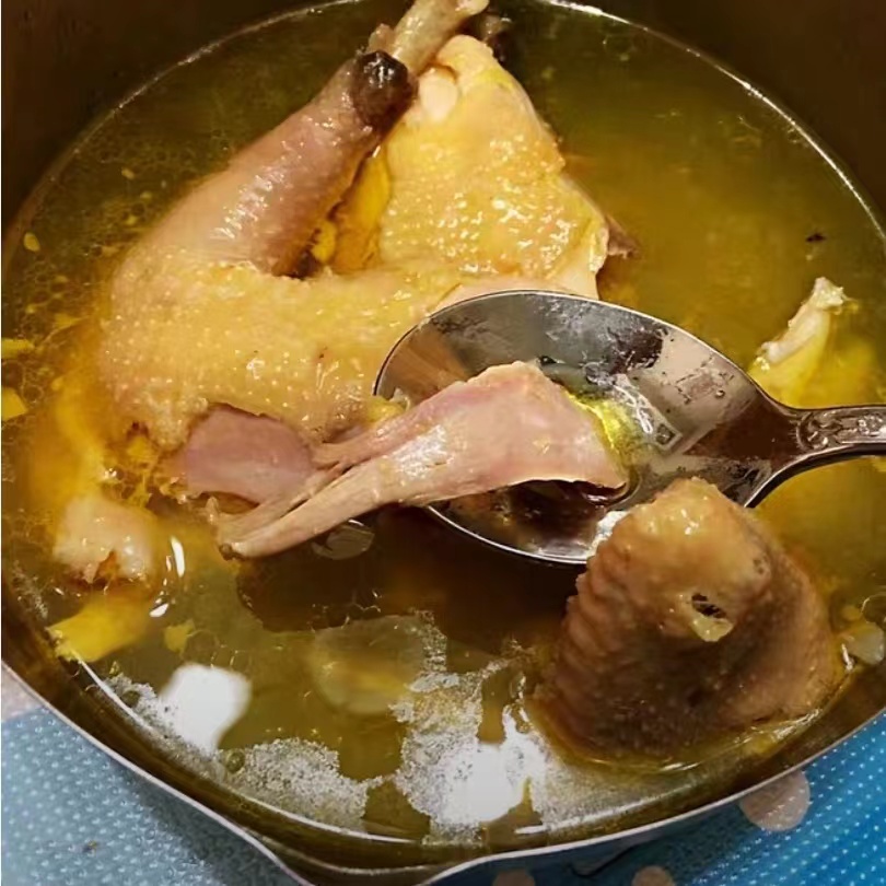 无需特别的烹调技术或添加什么材料,鸡肉清水下锅,只需姜和食盐,大火烧到沸腾再转小火,炖个三小时出锅,香浓鲜美,没有一丁点土腥气。