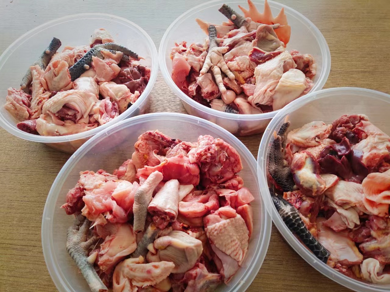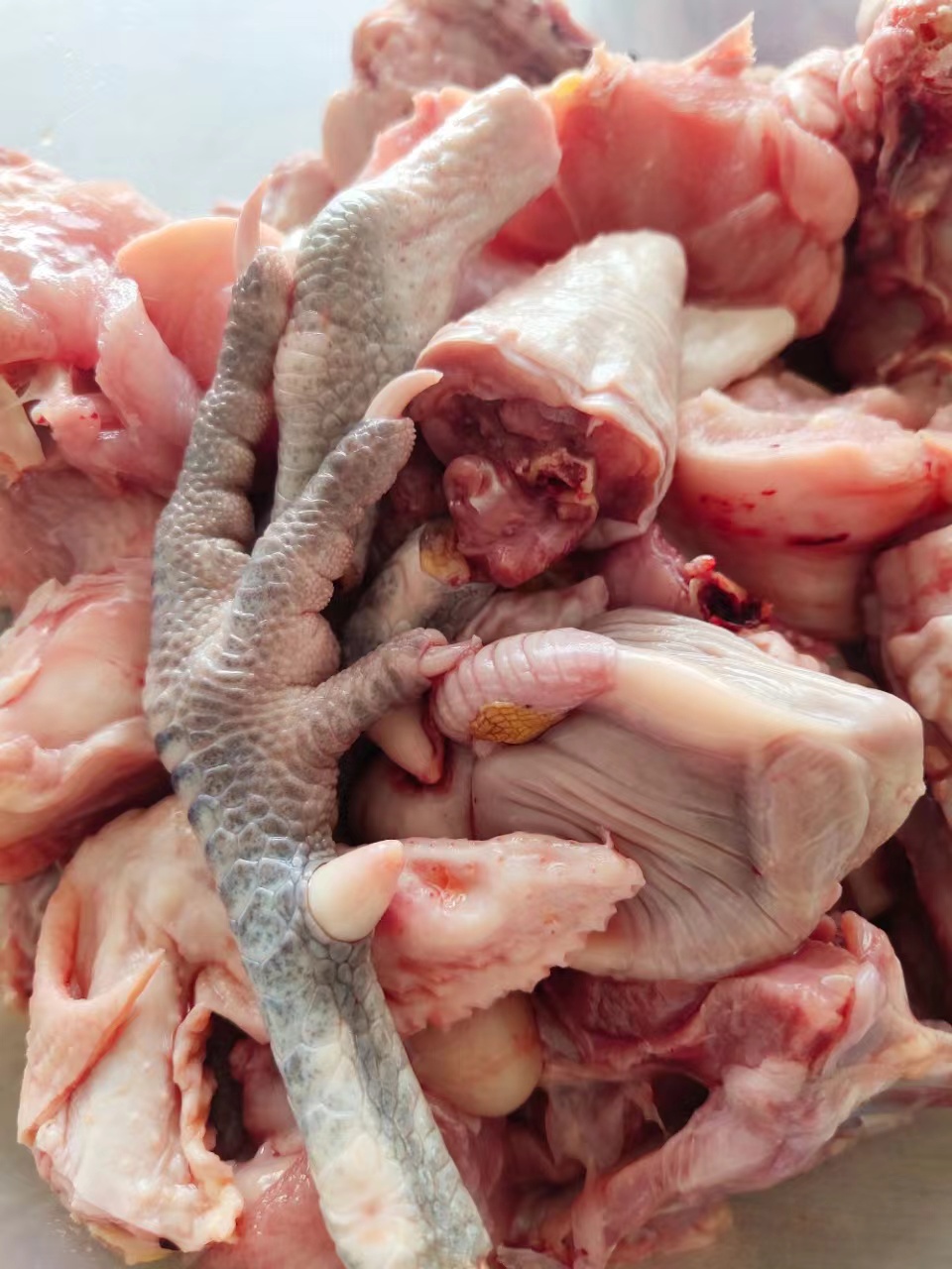 公鸡的鸡冠很大且红亮,鸡脚杆子上的飞爪很长,而母鸡则体型优美紧实(脂肪含量恰当,多一分嫌肥,少一分嫌瘦);不管是公鸡还是母鸡,鸡肉的肉质都是比较红润的,皮肉相连且很饱满,肌肉纹路很明显,这与普通市售肉鸡偏白色且松散的肉质有很大区别。