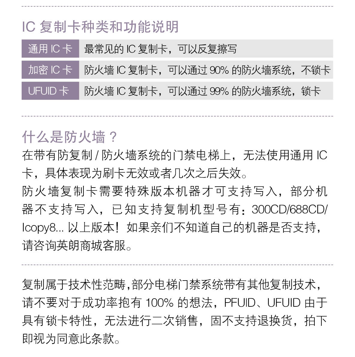 PFUlD卡扣属于高版lC卡,用于普通或者加密lC卡复制不成功的,或者复制成功后开不了门的现象,成功率相对更高一些。但是复制属于技术性范畴,部分电梯门禁系统带有其他复制技术,请不要对于成功率抱有100%的想法,PFUID具有锁卡特性,无法进行二次销售,固不支持退换货,拍下即视为同意此条款。请慎用!!