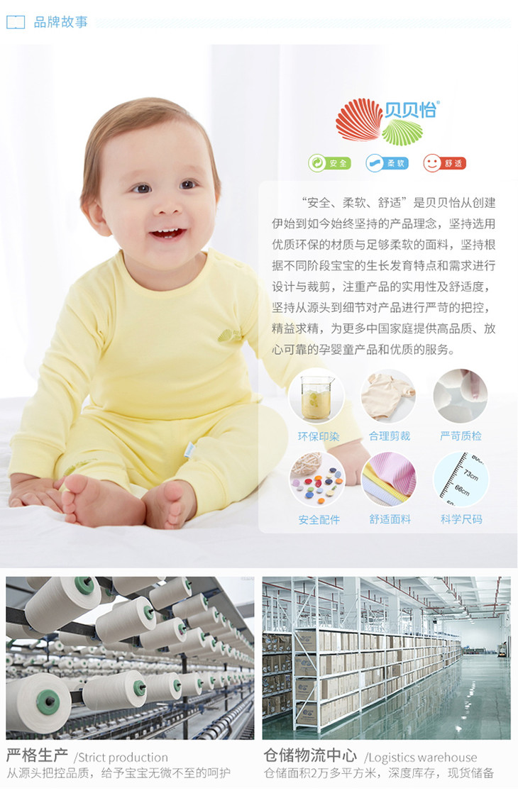 - 贝贝怡专注0-6岁婴幼儿服饰,坚持安全、柔软、舒适的产品理念,为千万中国家庭提供超高品质、安全可靠的婴幼儿服饰产品,妈妈放心,宝宝开心!