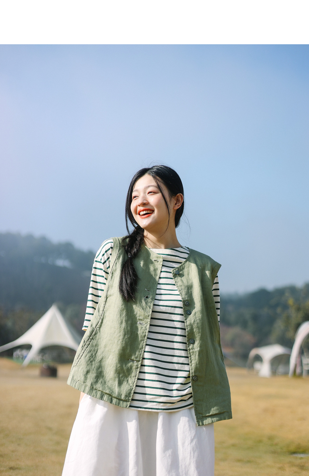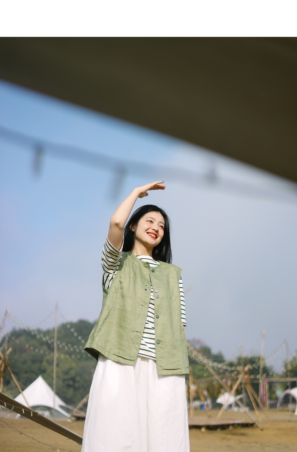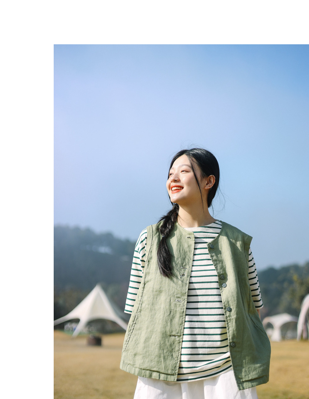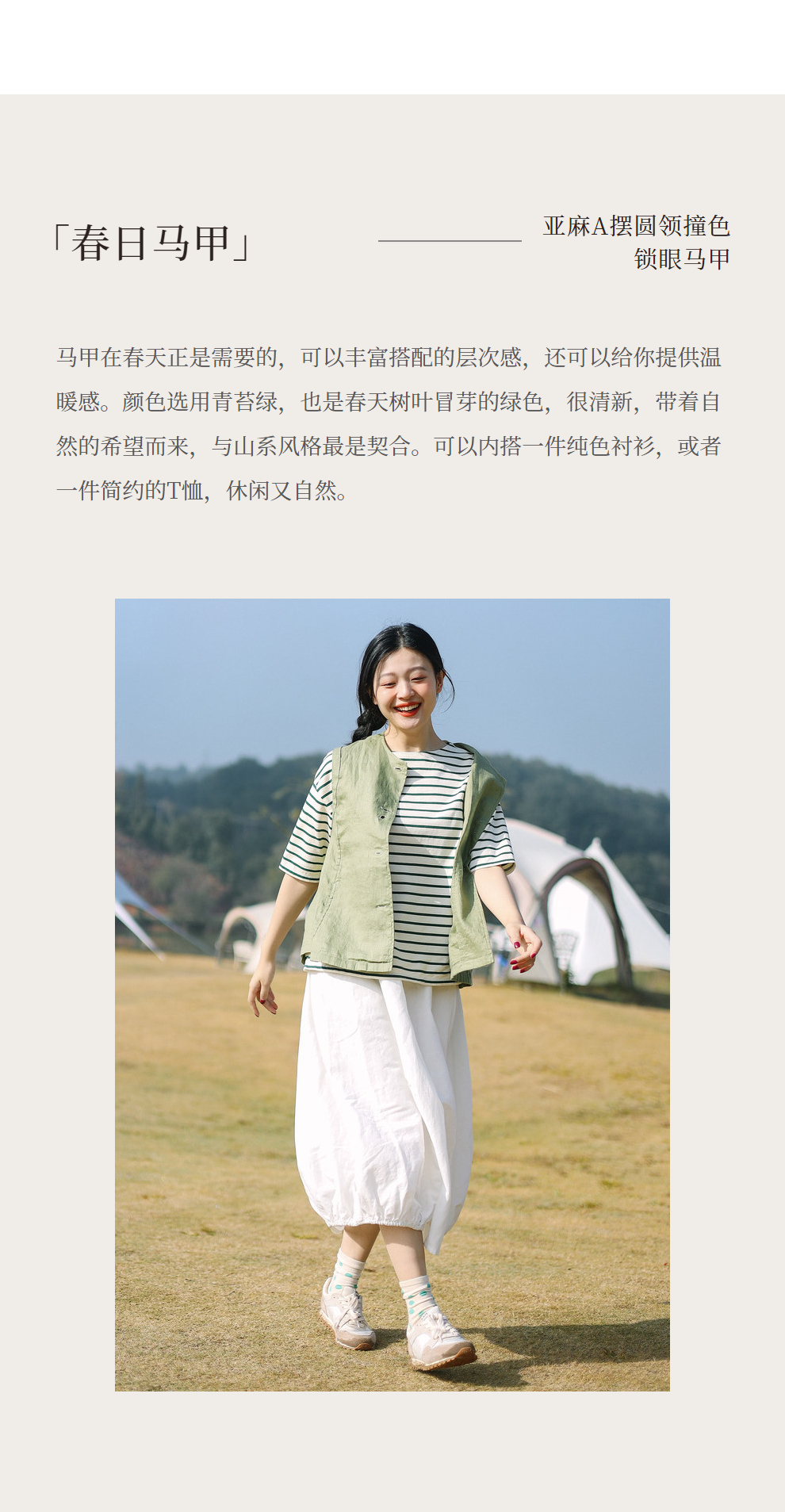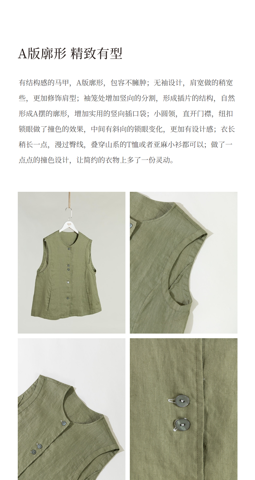 绽放145朵/青苔绿色A版廓形圆领无袖撞色锁眼原创设计感百搭马甲