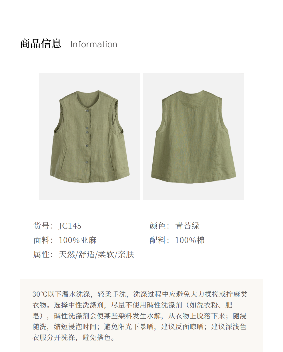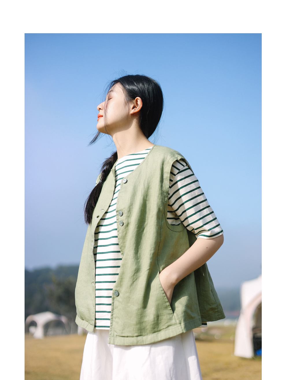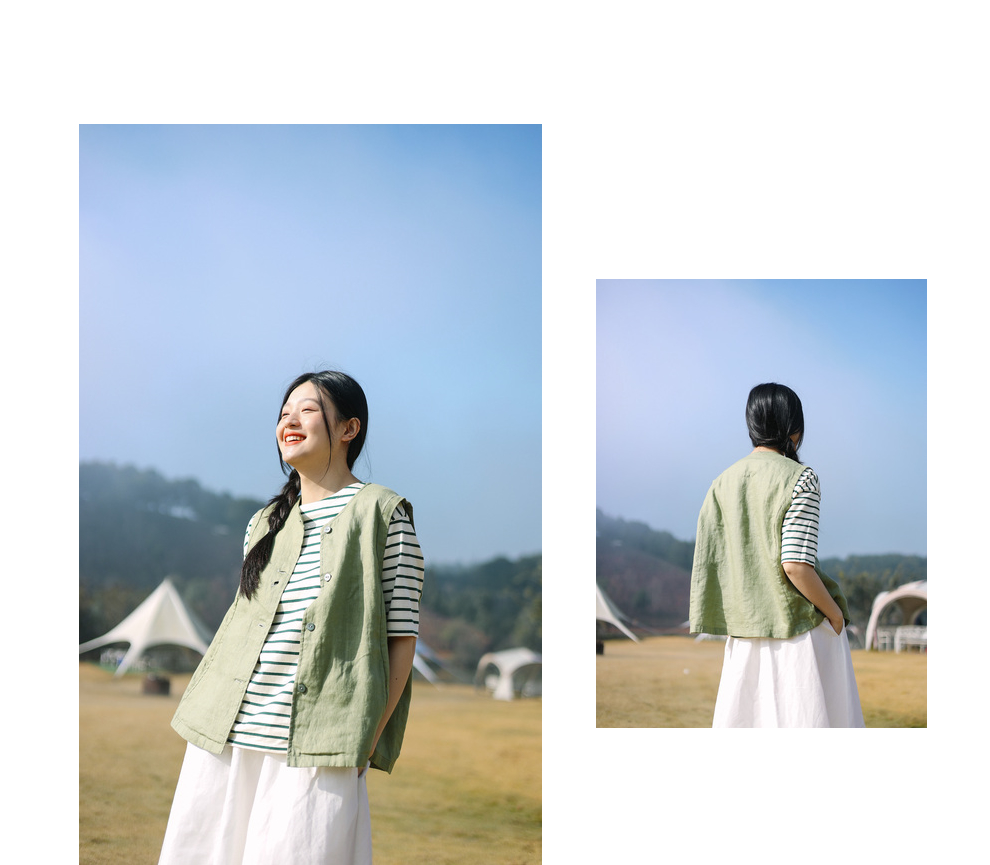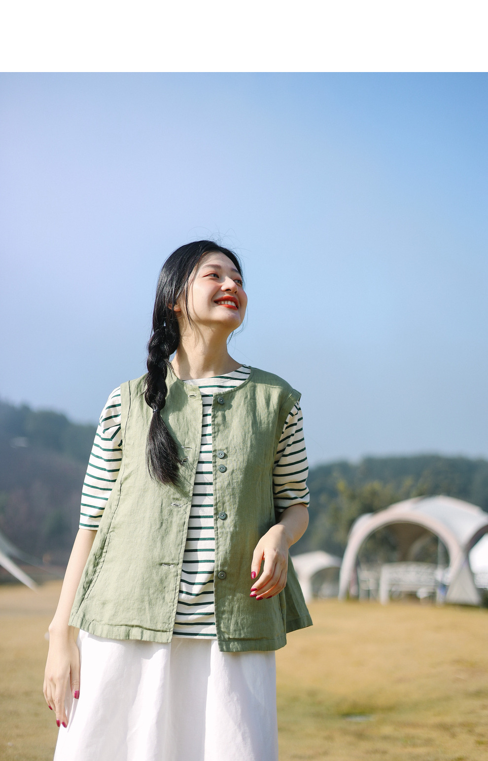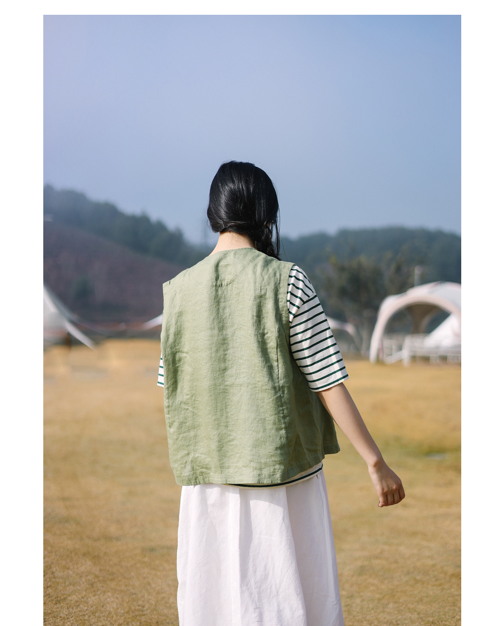 绽放145朵/青苔绿色A版廓形圆领无袖撞色锁眼原创设计感百搭马甲