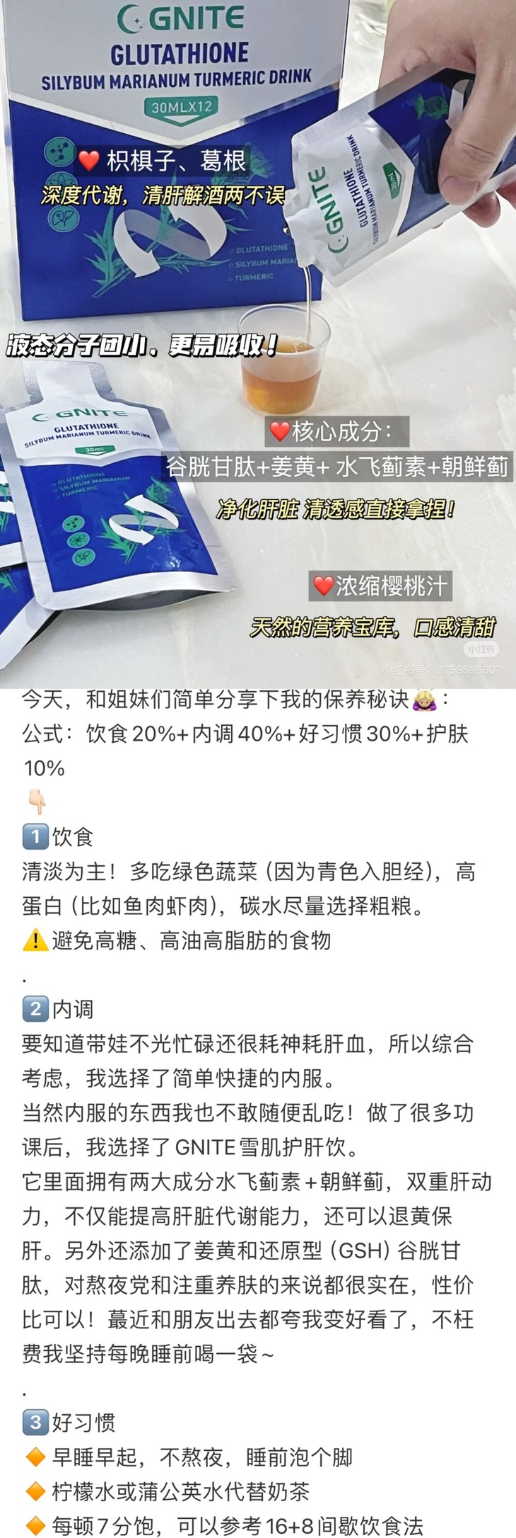 小小一袋,还蛮好喝的呢!因为有添加原生樱桃汁,是酸甜果汁口感,很好坚持!GNITE净肝饮还获得多项国际权威机构认证,包括FDA,品质和功效有充分认可。熬夜加班、应酬喝酒,是真的很需要,日常养生保健,也是很不错的选择。当然护肝我最推荐还是Ayu的水飞蓟油早起一口闷,加玫瑰精油重整内分泌,或加柠檬精油美白,加马鞭草酮迷迭香精油更是护肝加倍是真的特别好,只是很多人确实喝不了油,就退而求其次一下!肝好了,暗沉斑点也能白白净净!