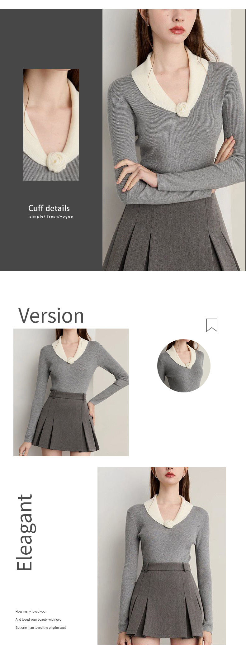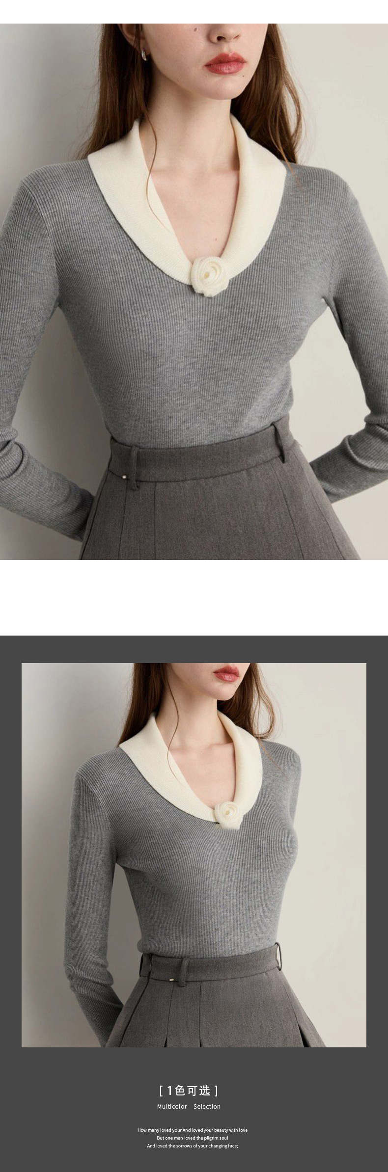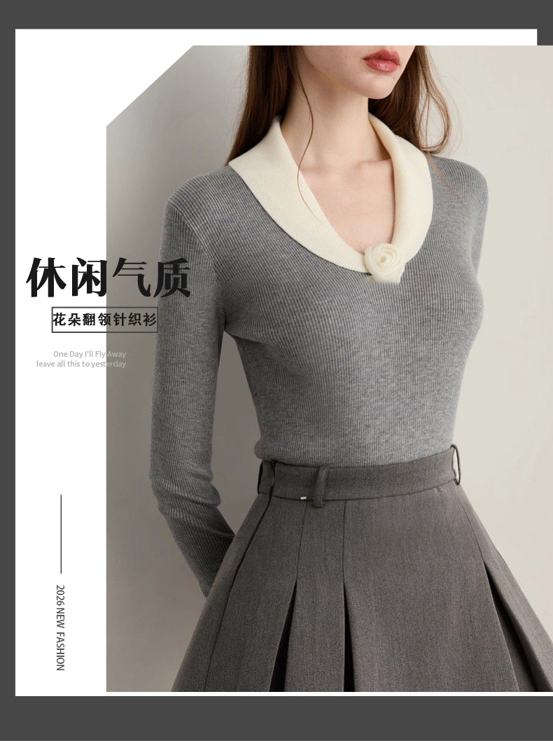 馥迦法式灰色花朵翻领针织衫