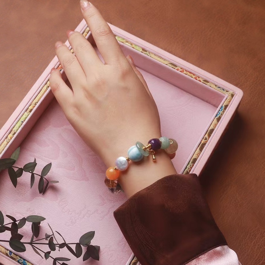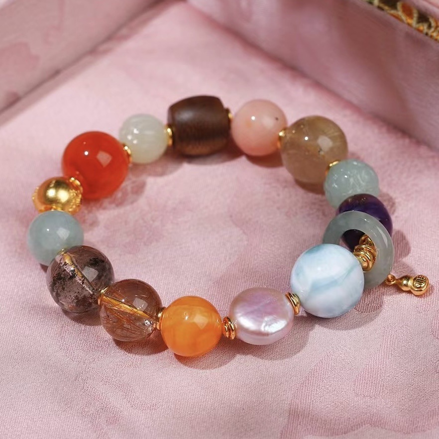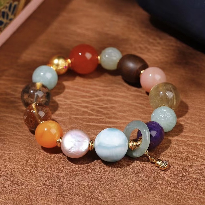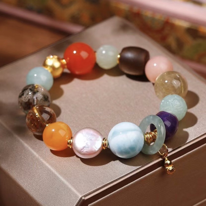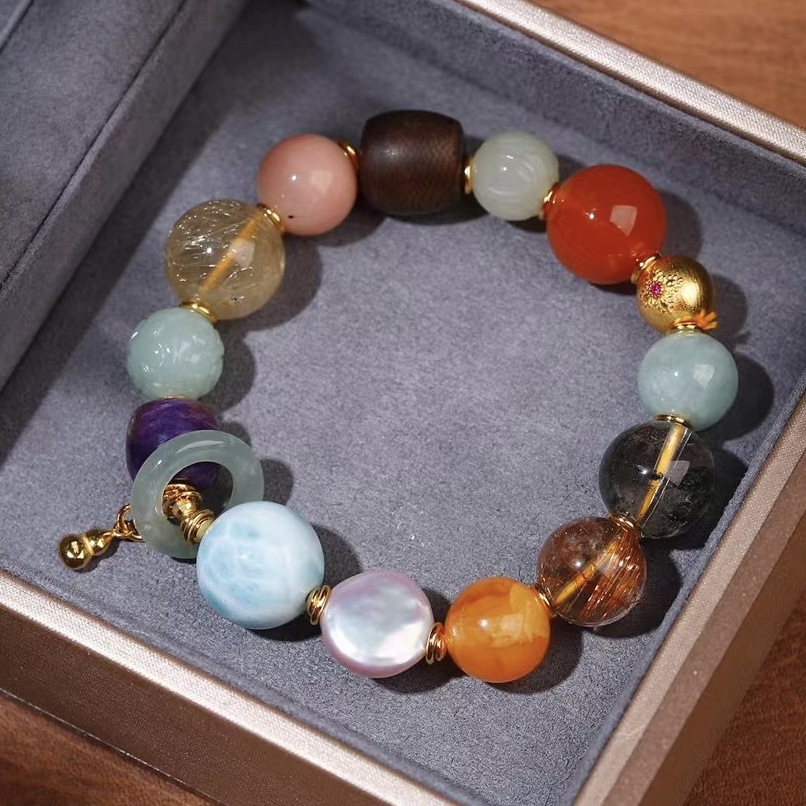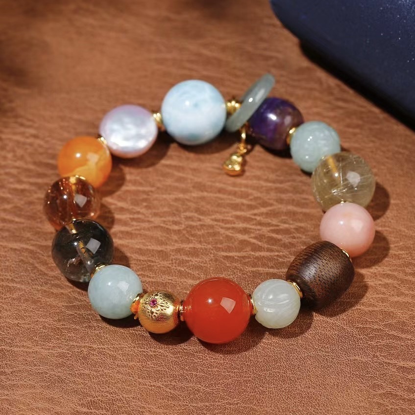 【材质】天然多米尼加海纹石珠14.5mm左右,天然淡水巴洛克珍珠13.9mmX6.2mm左右,天然俄料蜜蜡12mm左右,天然铜发晶13.5mm左右,天然绿幽灵水晶14.mm左右,天然A货翡翠珠12mm左右,925银镀金转运珠雕刻十字金刚杵,天然红兔毛14mm左右,天然和田玉莲花珠11.6mm左右,天然奇楠沉香桶珠13.3mmx12.4mm左右,天然粉澳宝12mm左右,天然金发晶13.4mm左右,天然A货翡翠雕刻回纹珠12.3mm左右,天然紫龙晶桶珠11.5mmx11.2左右,天然A货翡翠跑环