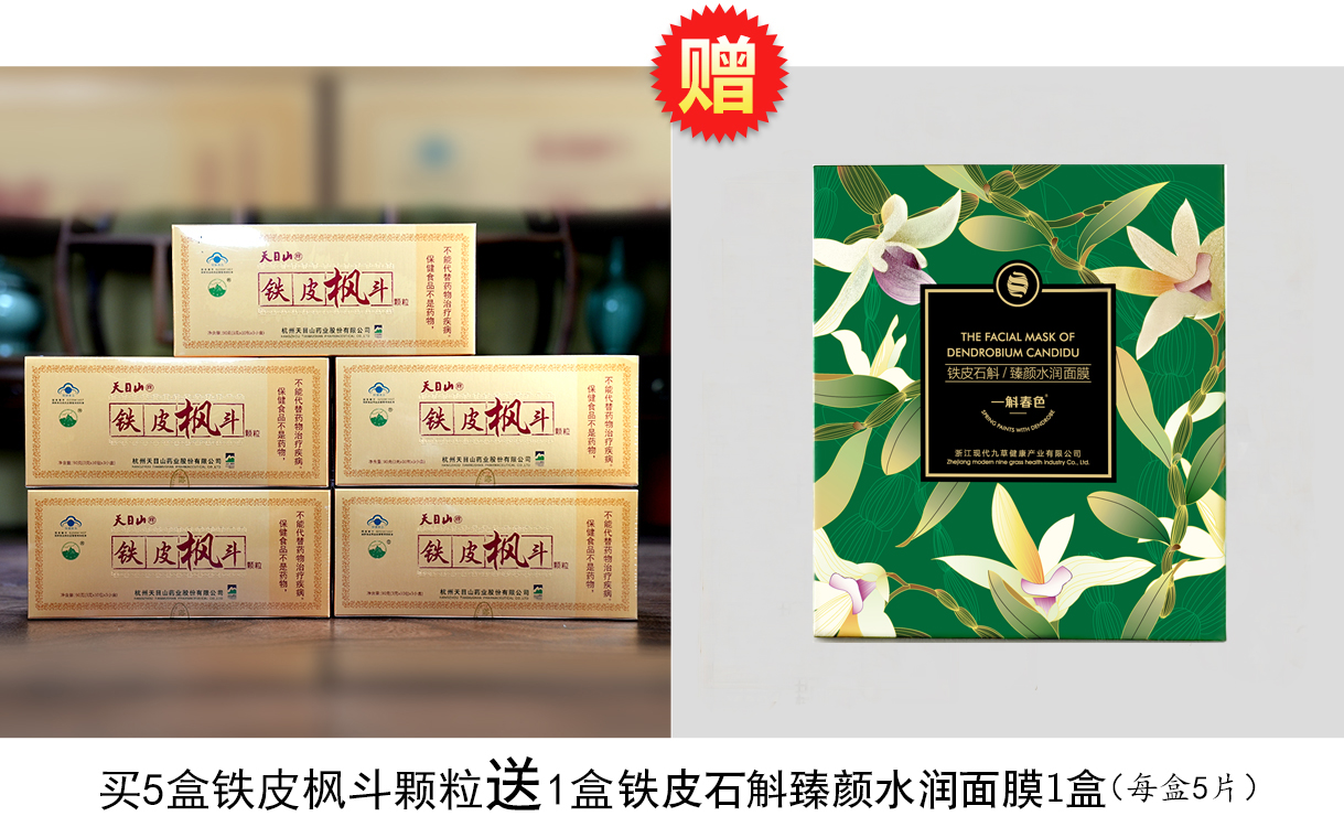 活动套餐二:买5盒天目山铁皮枫斗颗粒(3g*30包/盒), 送铁皮石斛臻颜水润面膜1盒(每盒5片)。零售价2638元/组,活动价1088元/组。