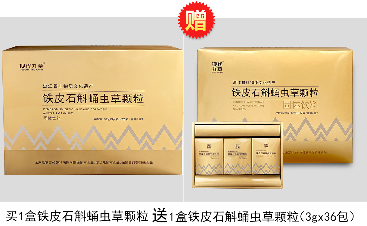 活动套餐三:买1盒现代九草铁皮石斛蛹虫草颗粒礼盒(3g*36包/盒), 送1盒现代九草铁皮石斛蛹虫草颗粒礼盒(3g*36包/盒)。零售价576元/组,活动价288元/组。