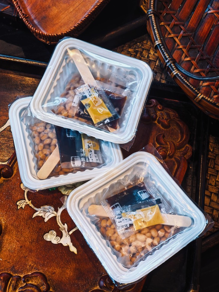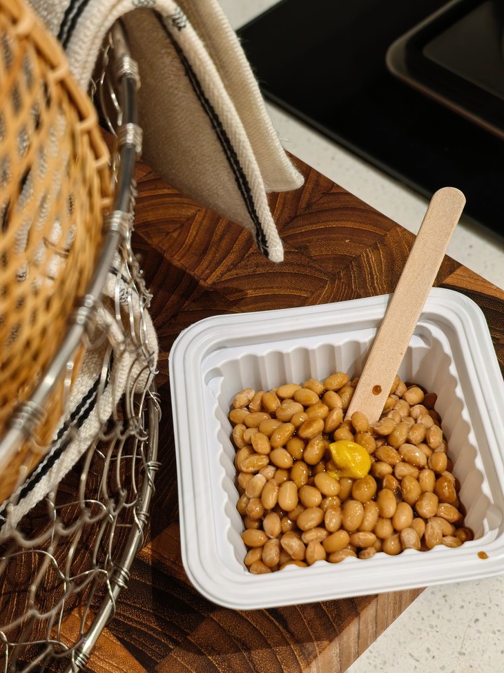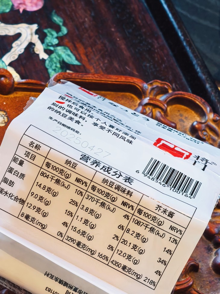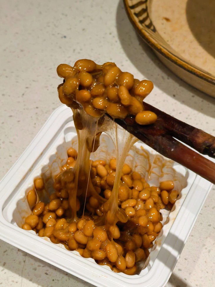 说实话,纳豆的味道确实是很有个性,刚打开时会有股类似氨水的气味,还有黏糊糊的拉丝,算得上是"甲之蜜糖,乙之砒霜"。我以前吃过,印象非常差,但这次硬着头皮吃了一些后,反倒有点上头,臭中带香,运动完来一盒,搭配着姜黄奶,还蛮不错的!而且,营养多多,我很愿意每天来一盒!