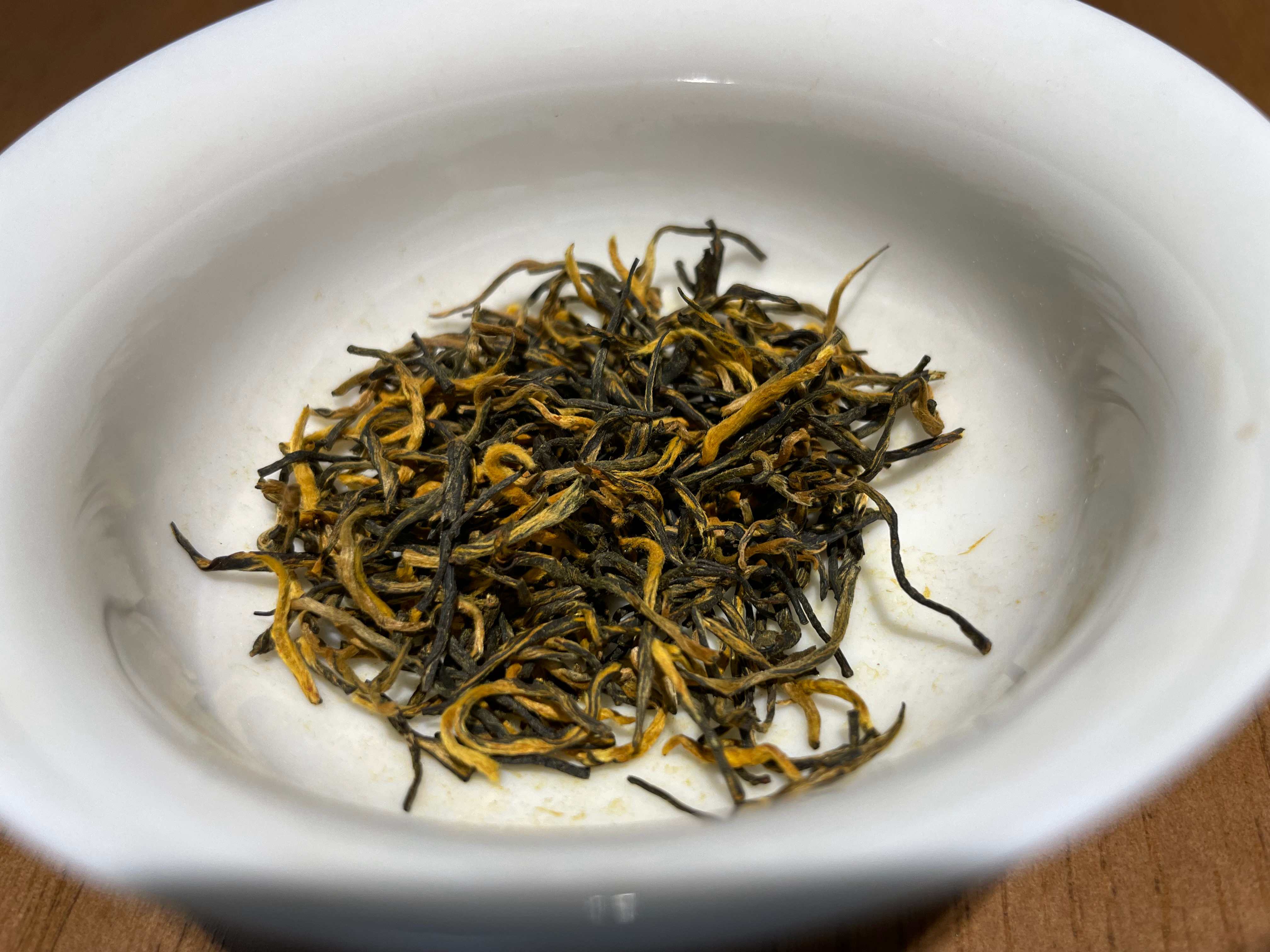 这款金骏眉,采武夷山上好春茶料,条索细,金毫显;香味尤其清扬,带浓郁的黄桂花香及蜜薯香,香落水;口感甜,入口润滑。