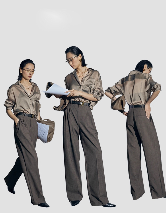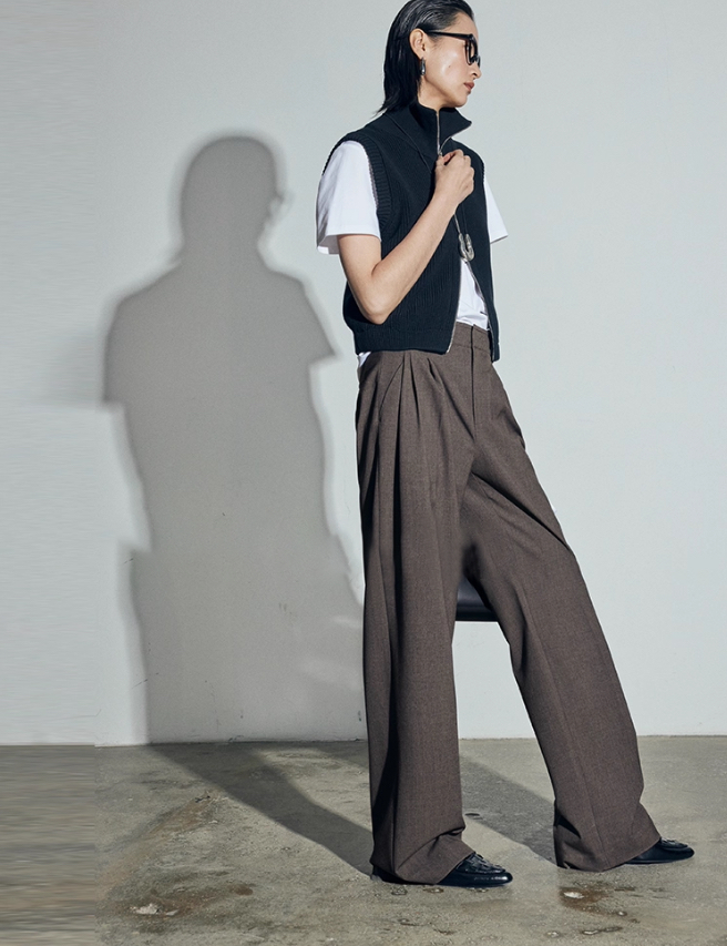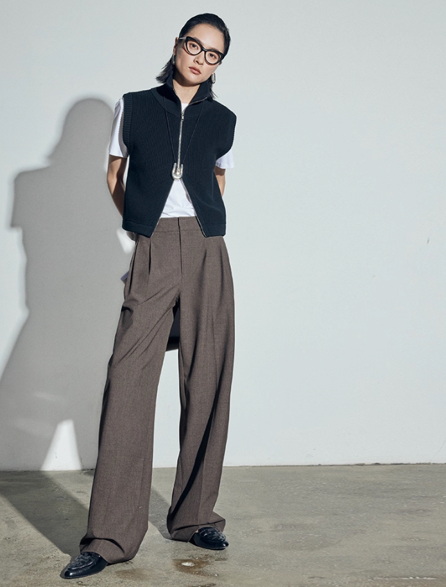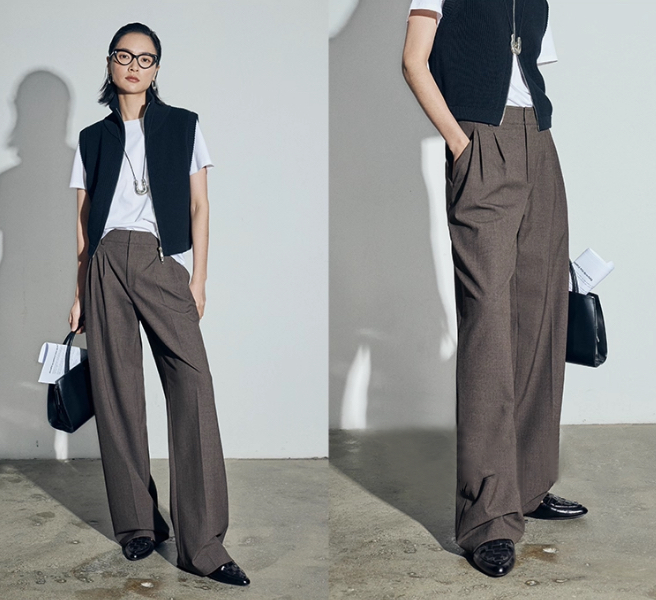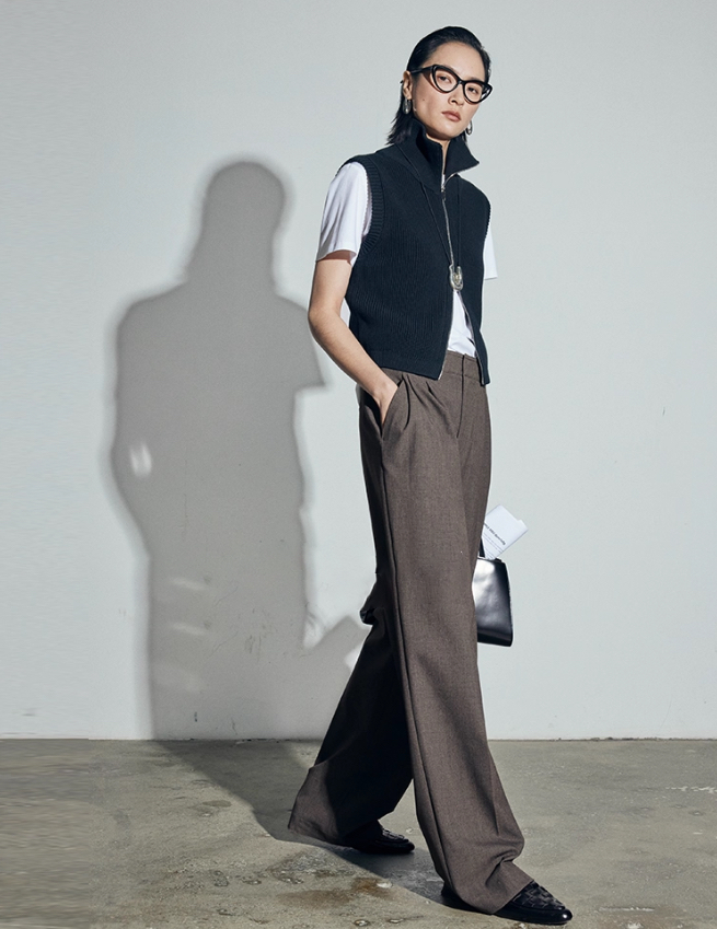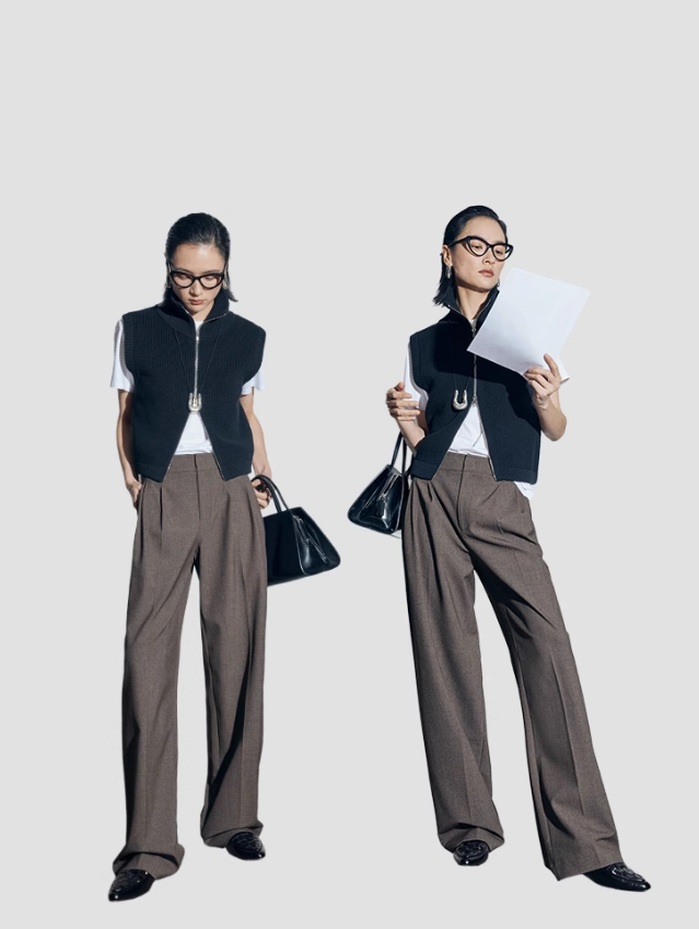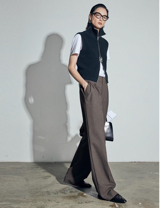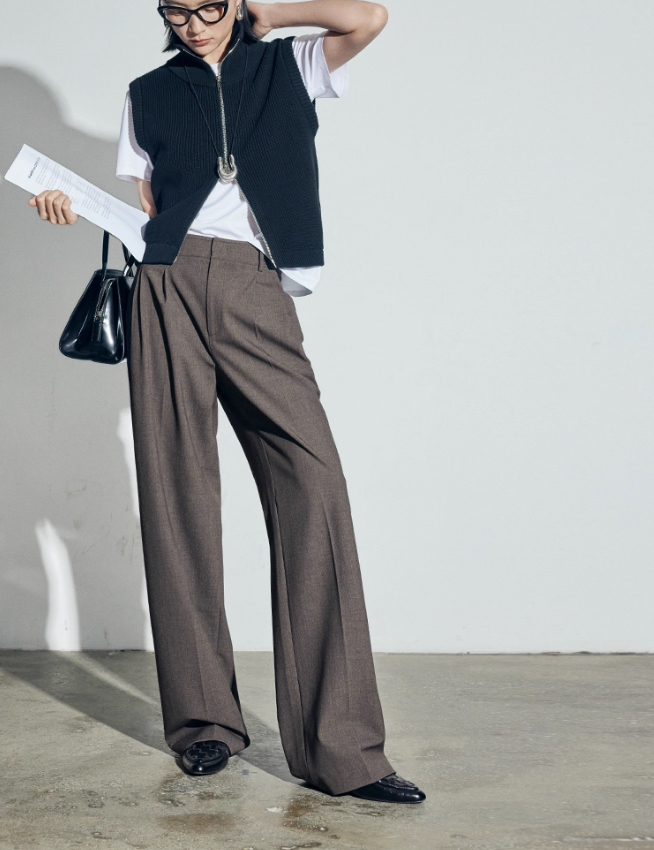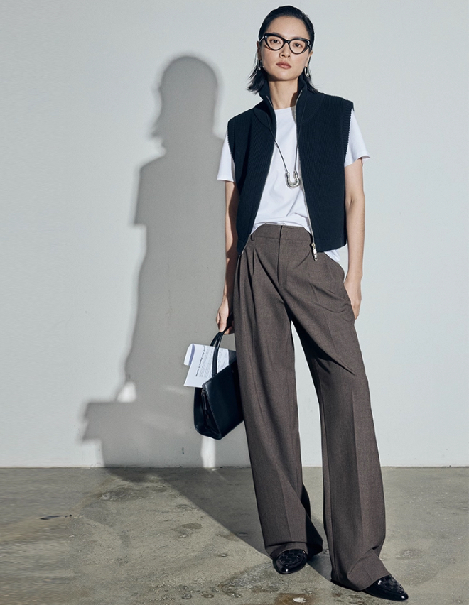 松露灰棕三道褶阔腿西裤自带复古书卷气,搭配黑框眼镜、极简银饰项链,清冷克制的知性格调拉满,“白 T + 西裤” 的组合弱化了职场的锋利感,完美契合 “Brainy”(智慧感)的风格标签。