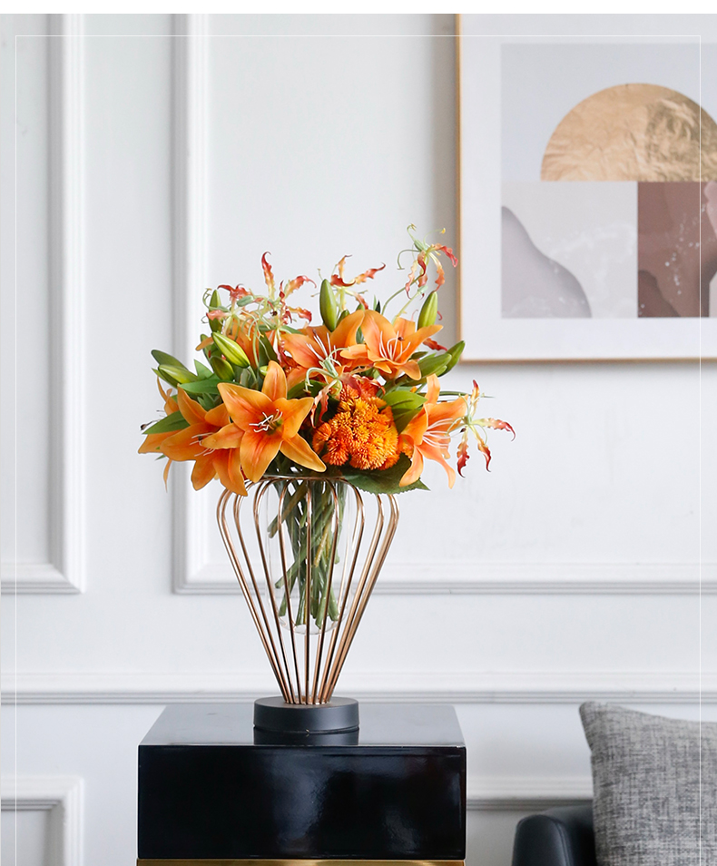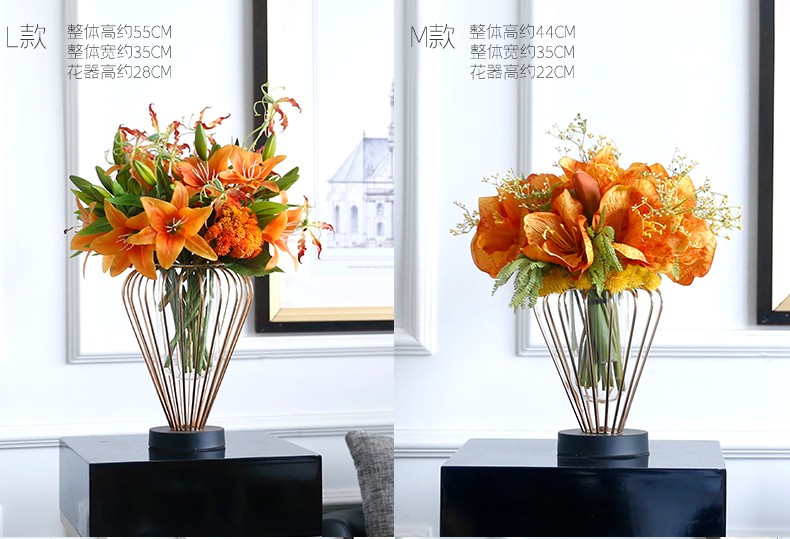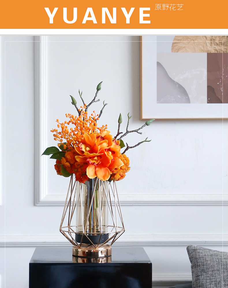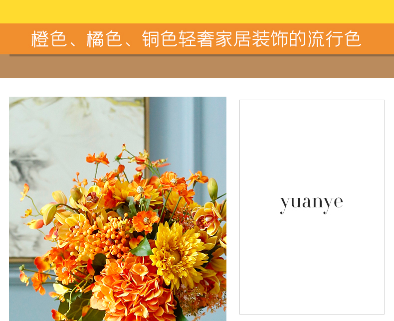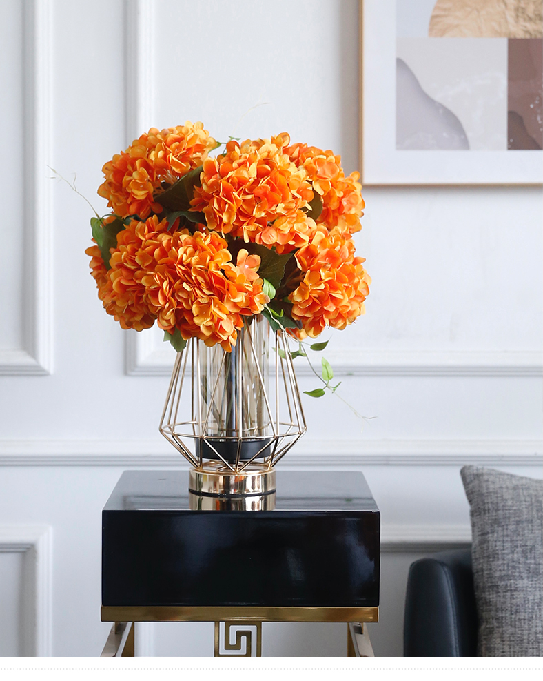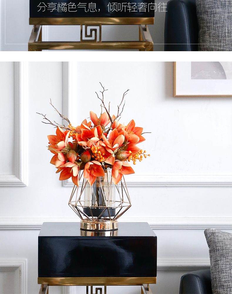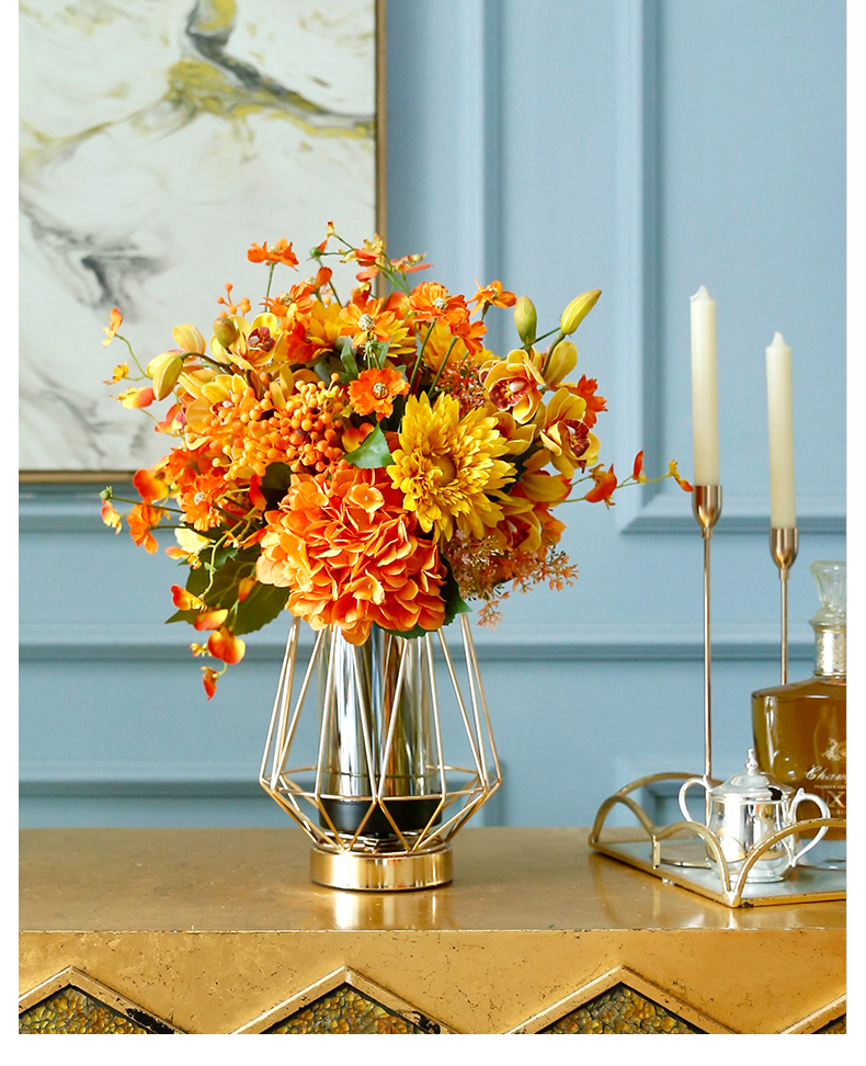 高档轻奢仿真花绢花玄关酒店前吧台茶几橘橙金铜色花器瓶样板间房