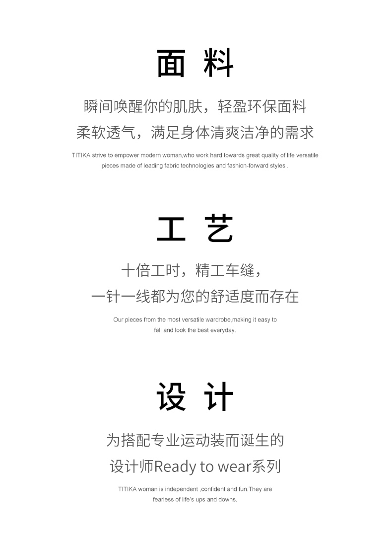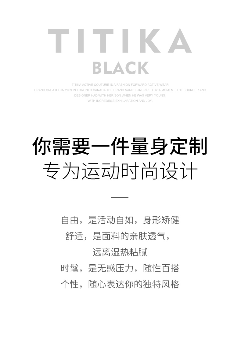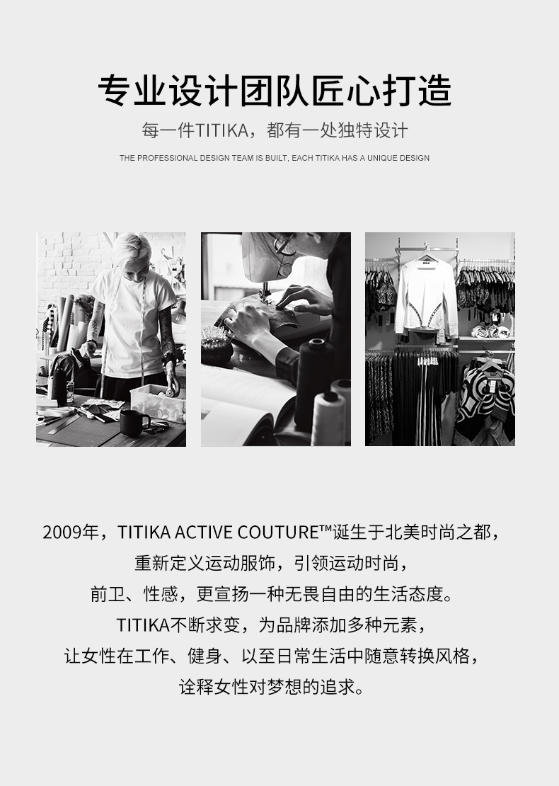 2009年,Titika Active Couture诞生于北美时尚之都,重新定义运动服饰,让运动时尚,前卫、性感,更宣扬一种无畏自由的生活态度。TITIKA缇缇卡不断求变,为品牌添加多种元素