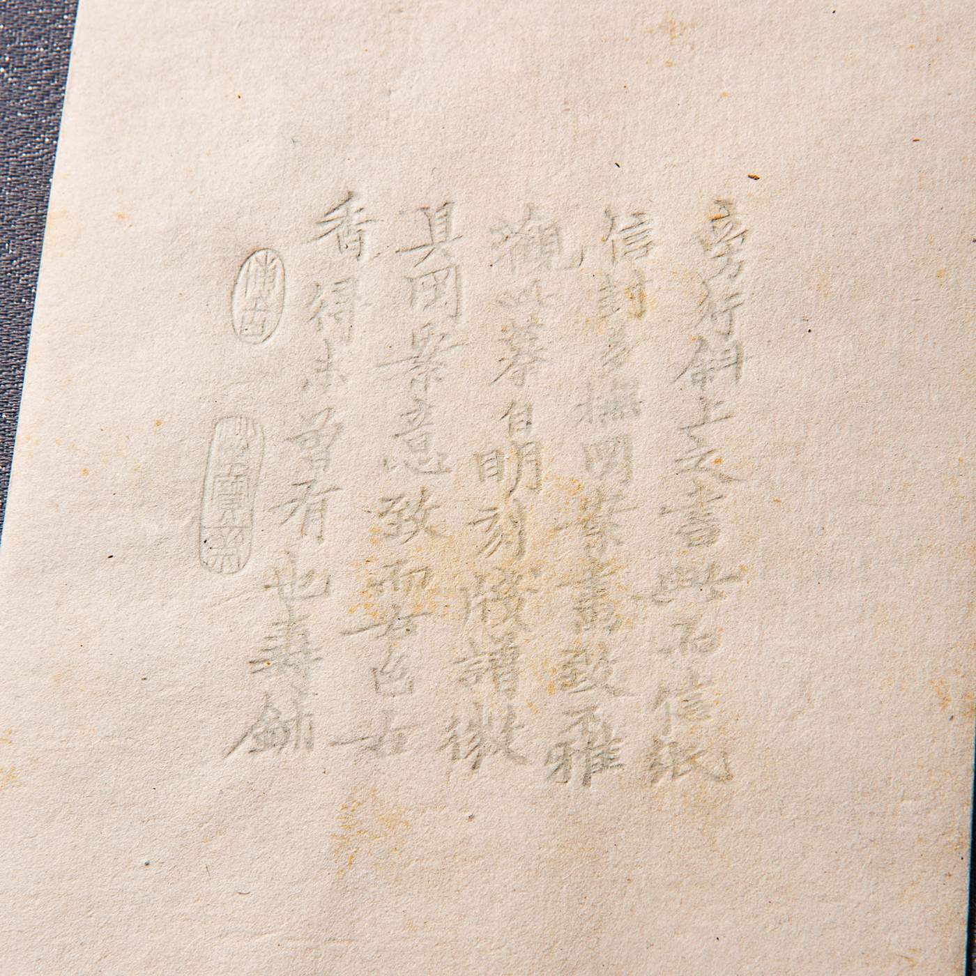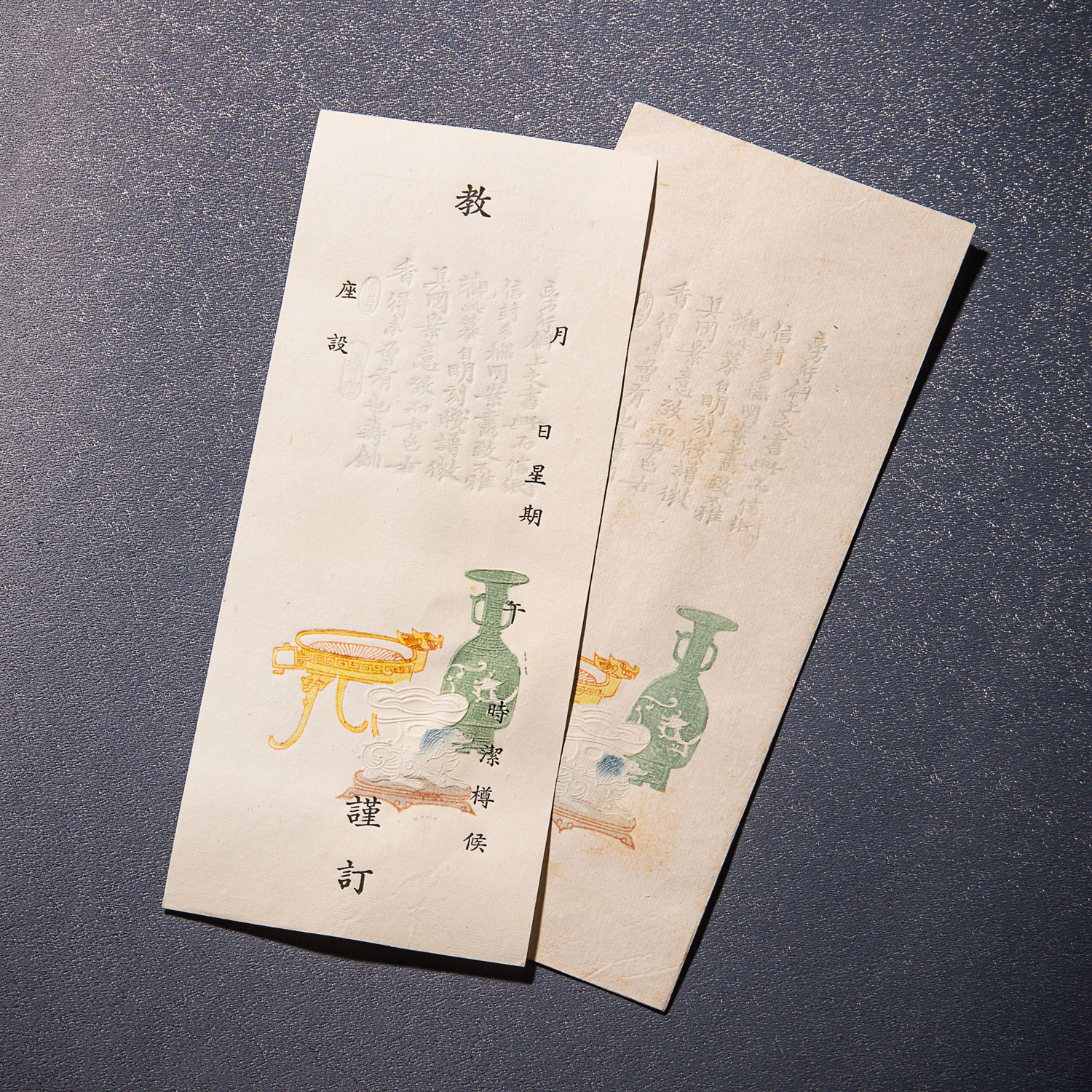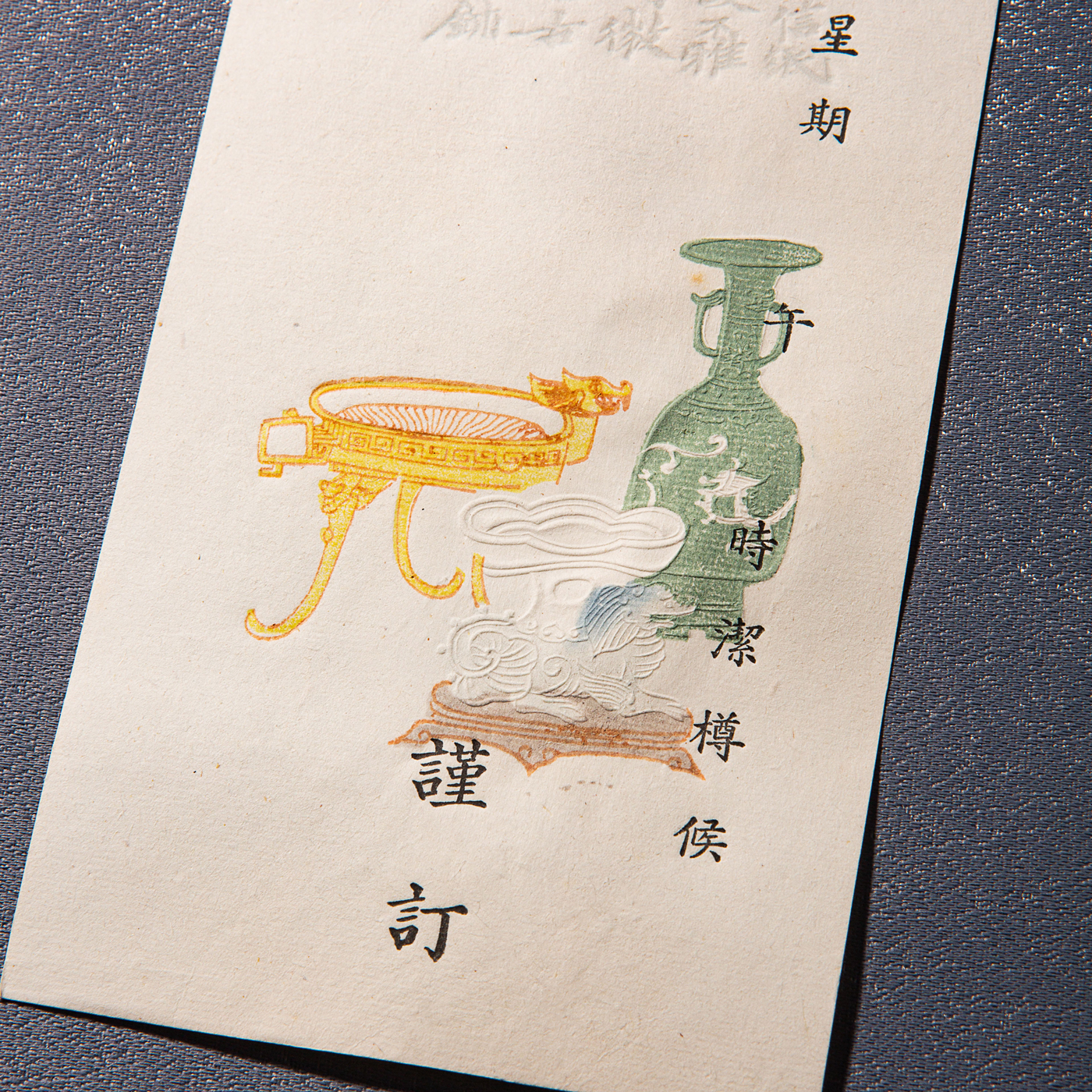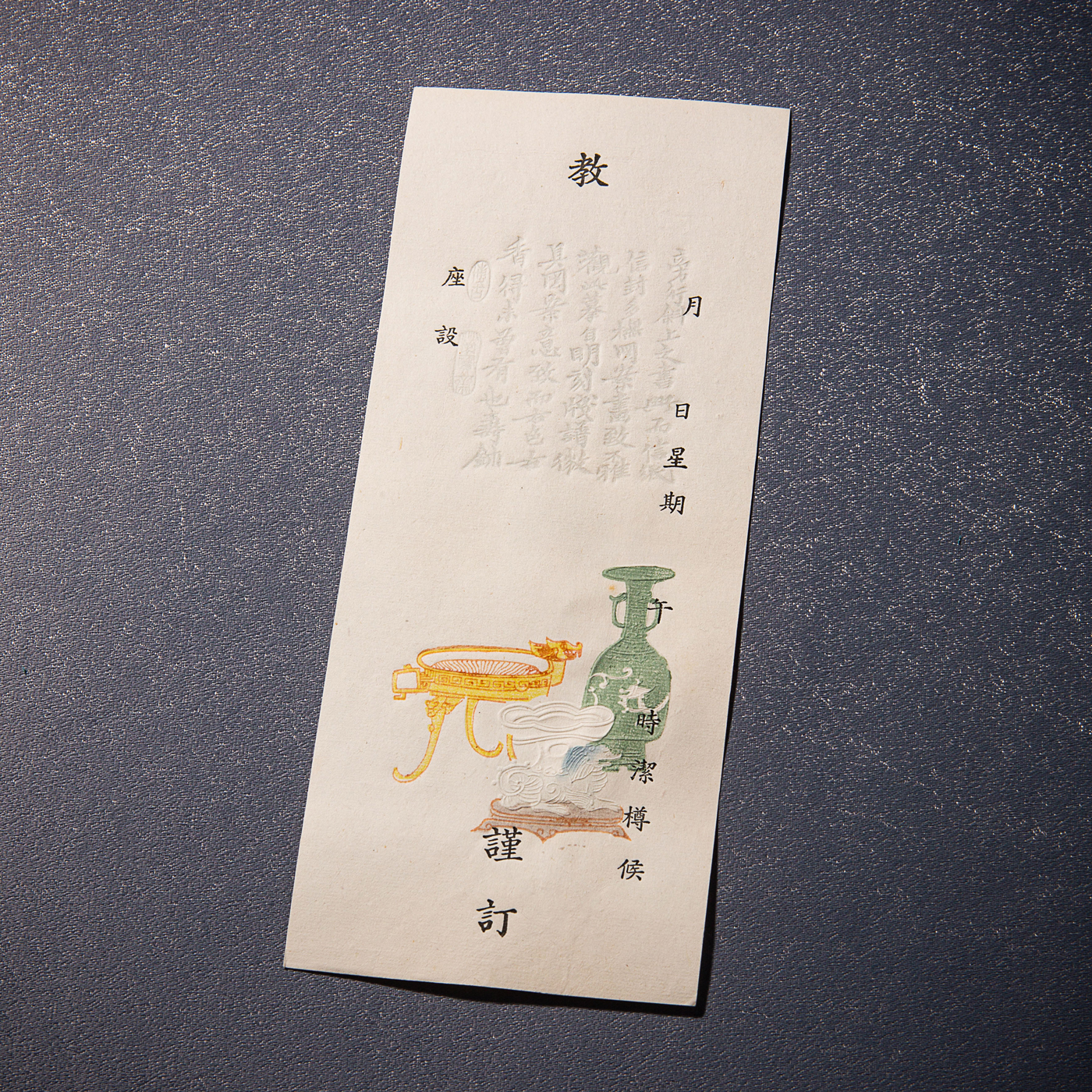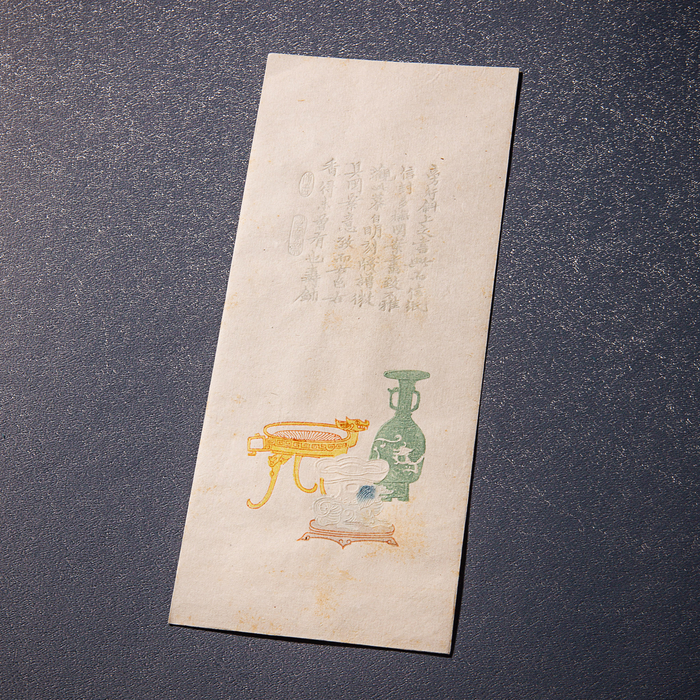 民国荣宝斋制“饾版拱花十竹斋博古图请柬及信封”一套。其雕版精美,用色鲜艳而又沉稳,品相完美,存世稀少,极为难得。