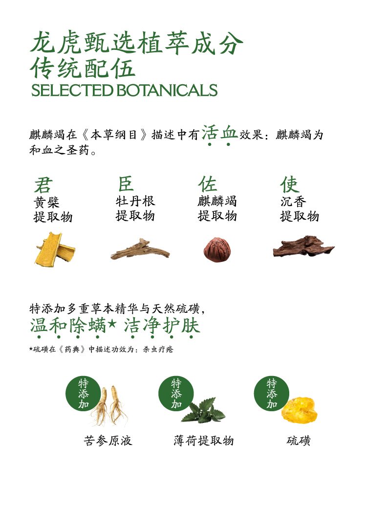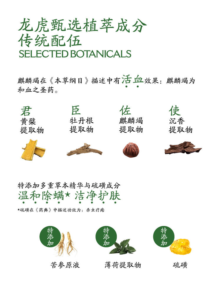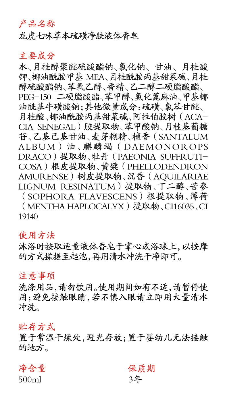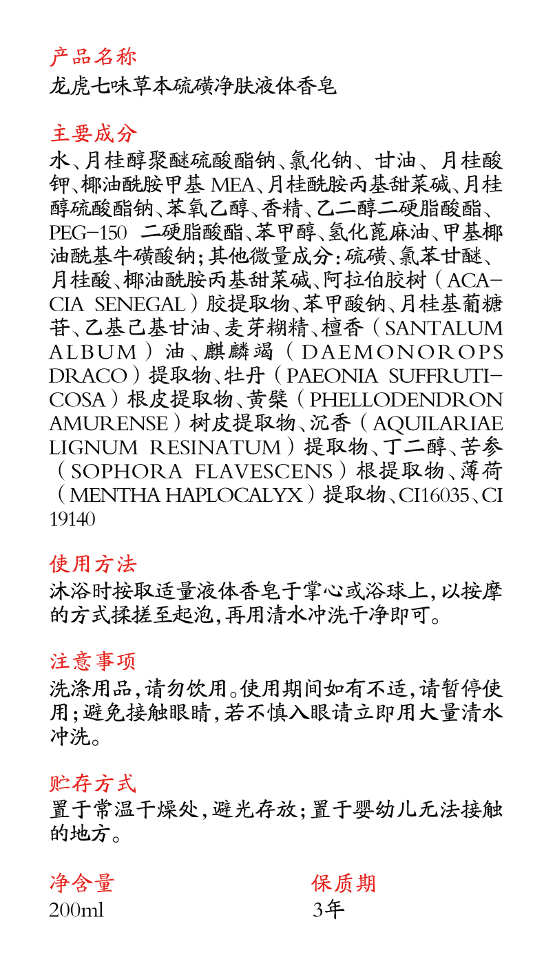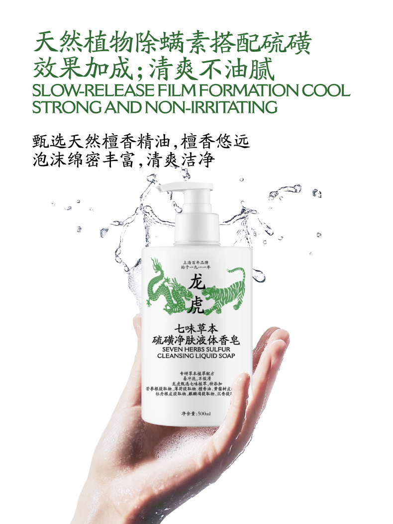 龙虎 七味草本硫磺净肤液体香皂 200ml/瓶 500ml/瓶 净螨清肤,深层清洁,除man抑jun率>99%;萃取7种植物成分,温和修护,清爽不油腻;调节水油平衡,泡沫绵密丰富