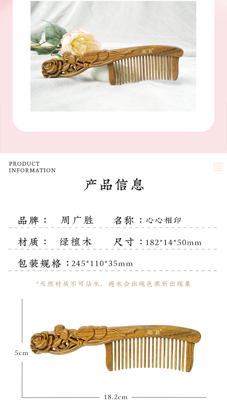 周广胜绿檀木心心相印镶齿梳礼盒女士长发专用蓬松护发按摩梳送礼
