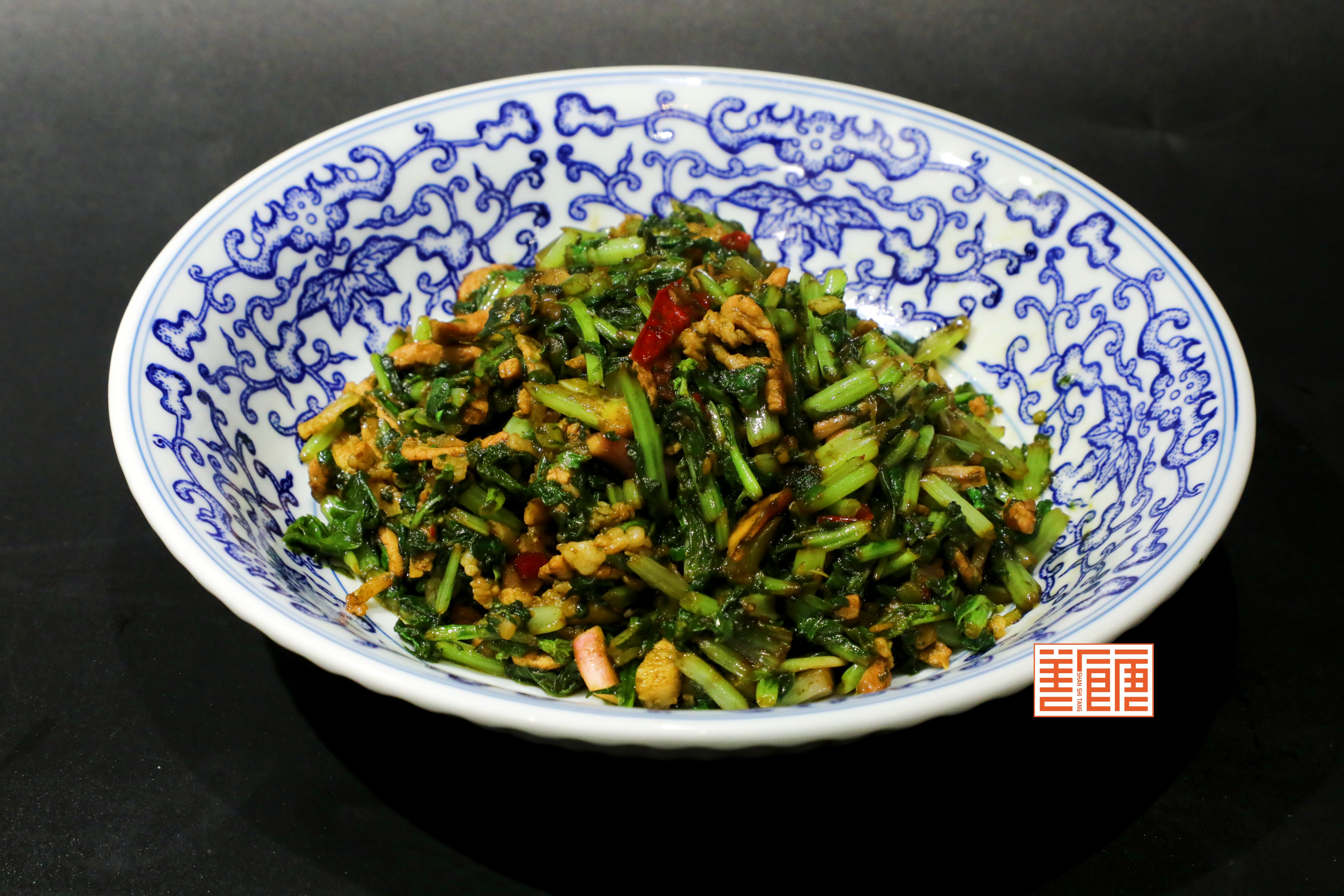 萝卜缨毛豆炒肉丝/例