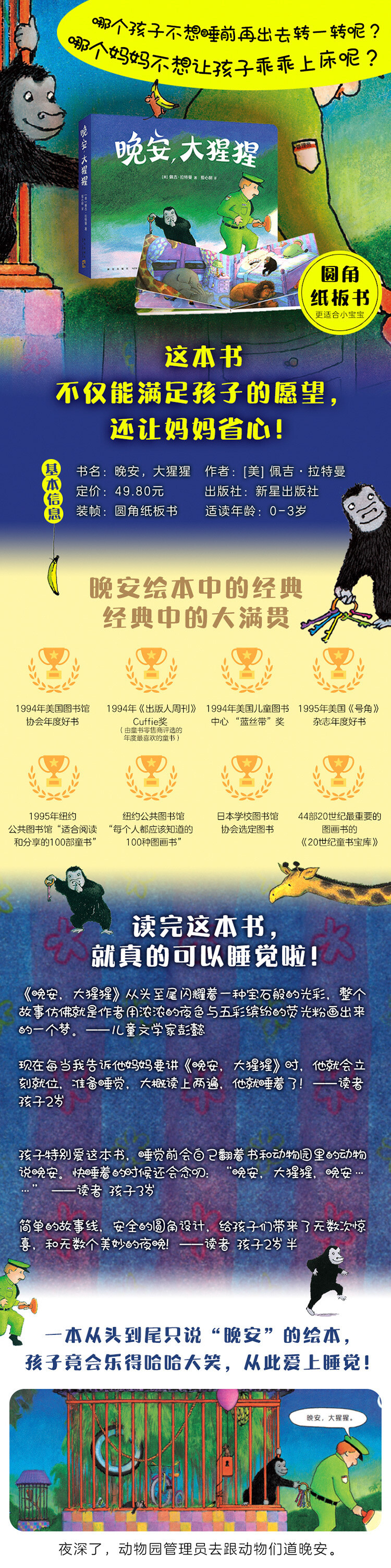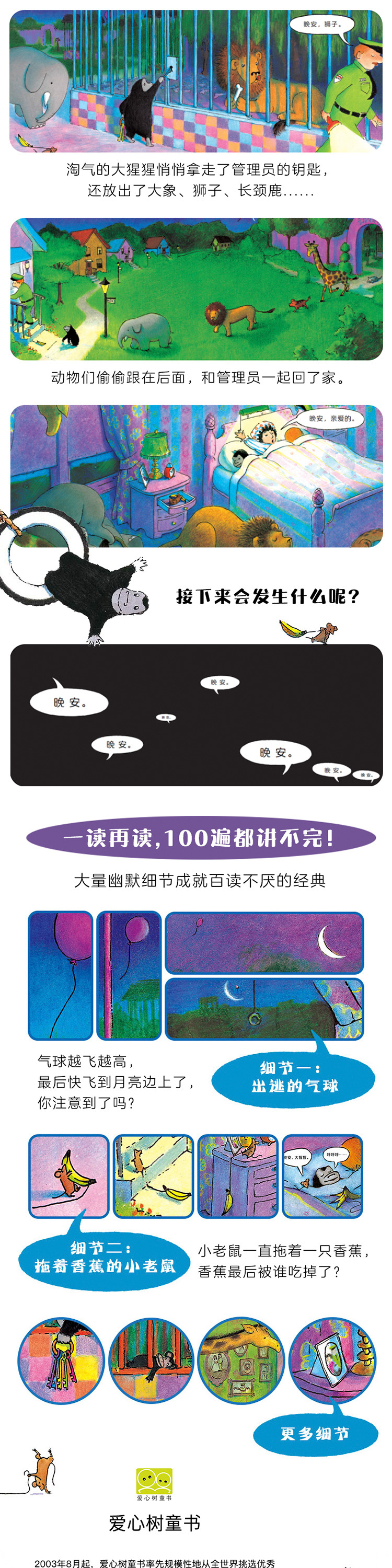 这是因为书中的画面会讲故事。而这个故事,爱调皮捣蛋的孩子们***熟悉,也***有默契:夜深了,要睡觉了,动物管理员和动物们一一说晚安,却不料被大猩猩偷走了钥匙,还把其他动物也放出来,大家偷偷跟随者管理员来到他的家里睡觉的故事。