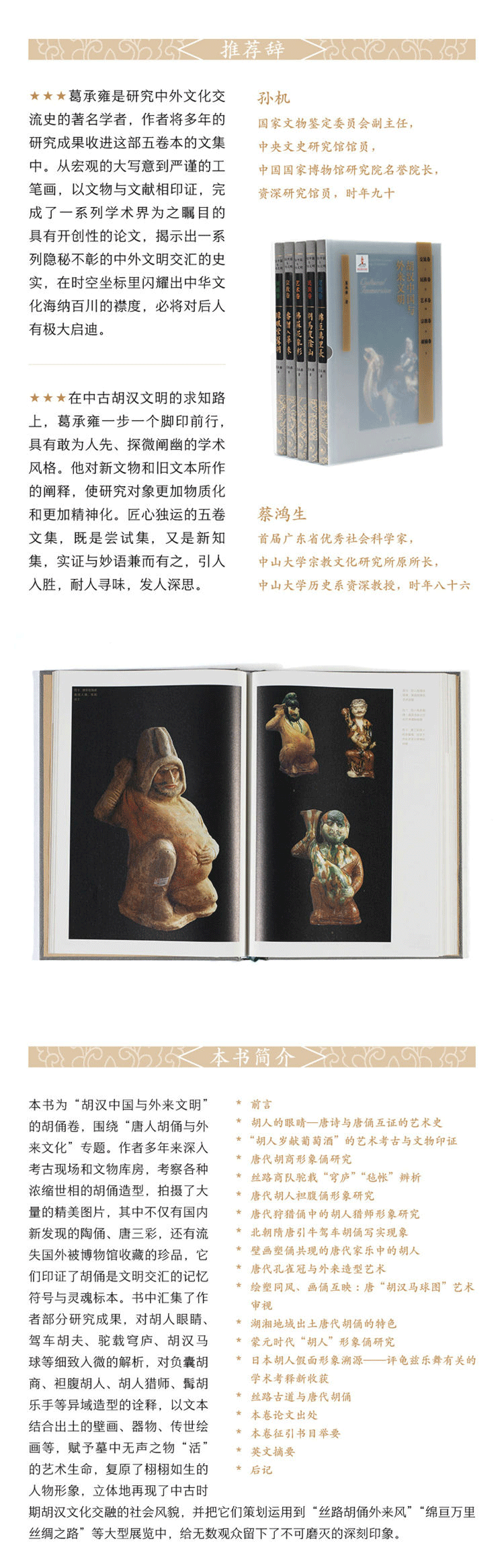 全书总书名为《胡汉中国与外来文明》,分为五卷,即《交流卷:绵亘万里长》《民族卷:胡马度阴山》《艺术卷:拂菻花乱彩》《宗教卷:番僧入华来》《胡俑卷:绿眼紫髯胡》。在书中,作者纵论胡汉文化如何在汉唐时期进行深入交流互动,具体考察了入华胡人的生活状况,探讨外来文明对中原建筑、书法、绘画、雕塑以及生活习俗等方面的影响,挖掘祆教、摩尼教、景教等在中原地区的传播。作者长期工作于考古文博的一线,亲身接触大量新出土但尚未刊布的考古文物及文献成果,在此基础上,作者撰写多篇文章并配以重要的图片,这些研究文章对于推动历史学、考古学的研究,对于建立中国学者与国际学术界的交流有着极其重要的意义。同时,作者关注的地域空间大多与汉唐以来丝路沿线的族群、政权相关联,对于这些地区的历史、文化、宗教、艺术的基础性研究,对于扎实推进“一带一路”构想有着积极作用。