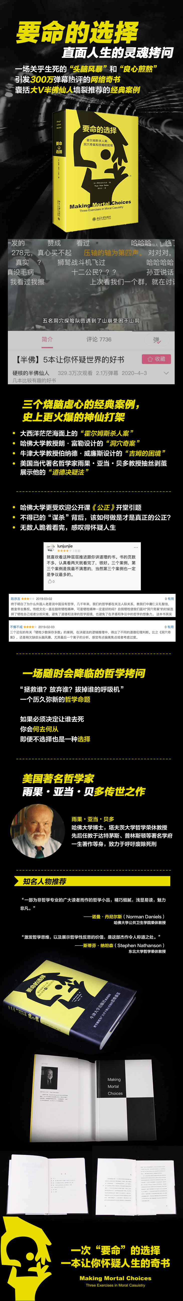 本书源自美国当代著名哲学家雨果•亚当•贝多教授1995年春在塔夫茨大学开设的一系列讲座。贝多教授在讲座中选取了三个著名的案例——既有真实发生的“美国诉霍尔姆斯案”,也有经典的虚构案例“洞穴奇案”和“吉姆的困境”——试图让听众(以及读者)共同思考:当遭遇特殊情形,无论怎样选择都会导致有人丧生,这个时候,我们该如何做出“要命的选择”?通过这样的“头脑风暴”和“良心煎熬”,贝多教授展示了“道德决疑法”这种已有千年历史的伦理分析方法在当代依然旺盛的生命力。