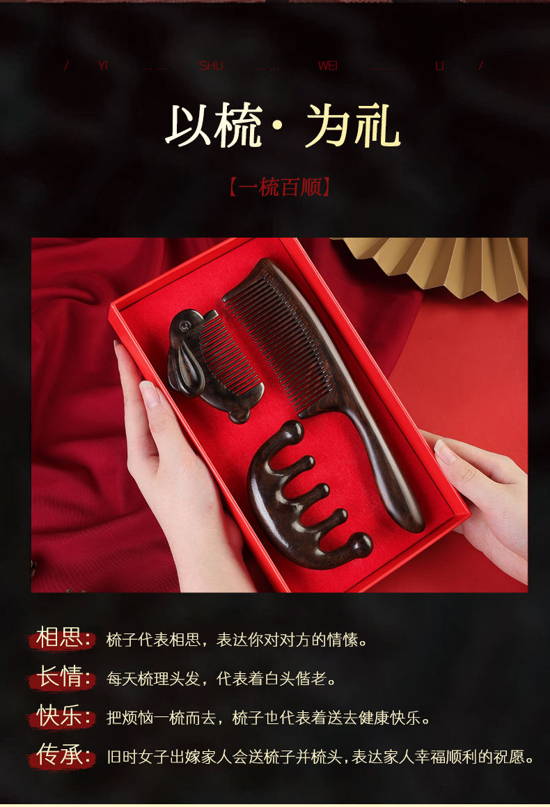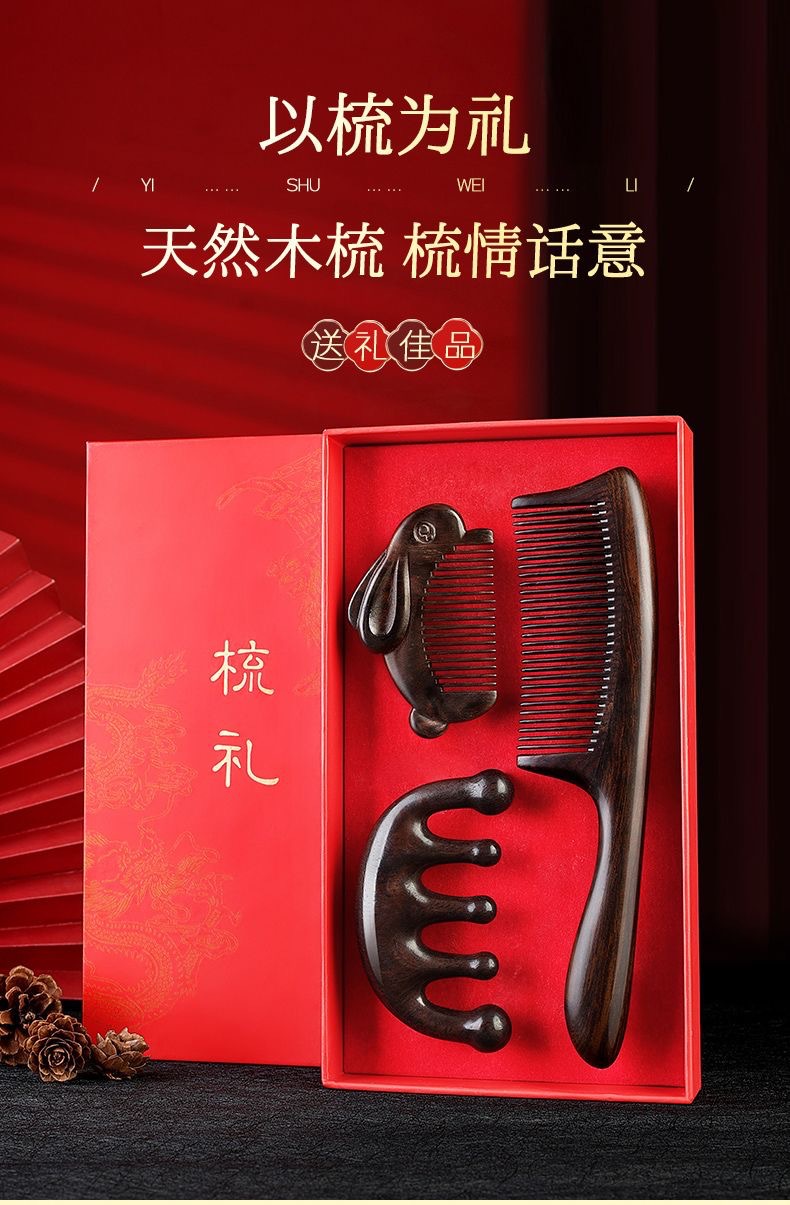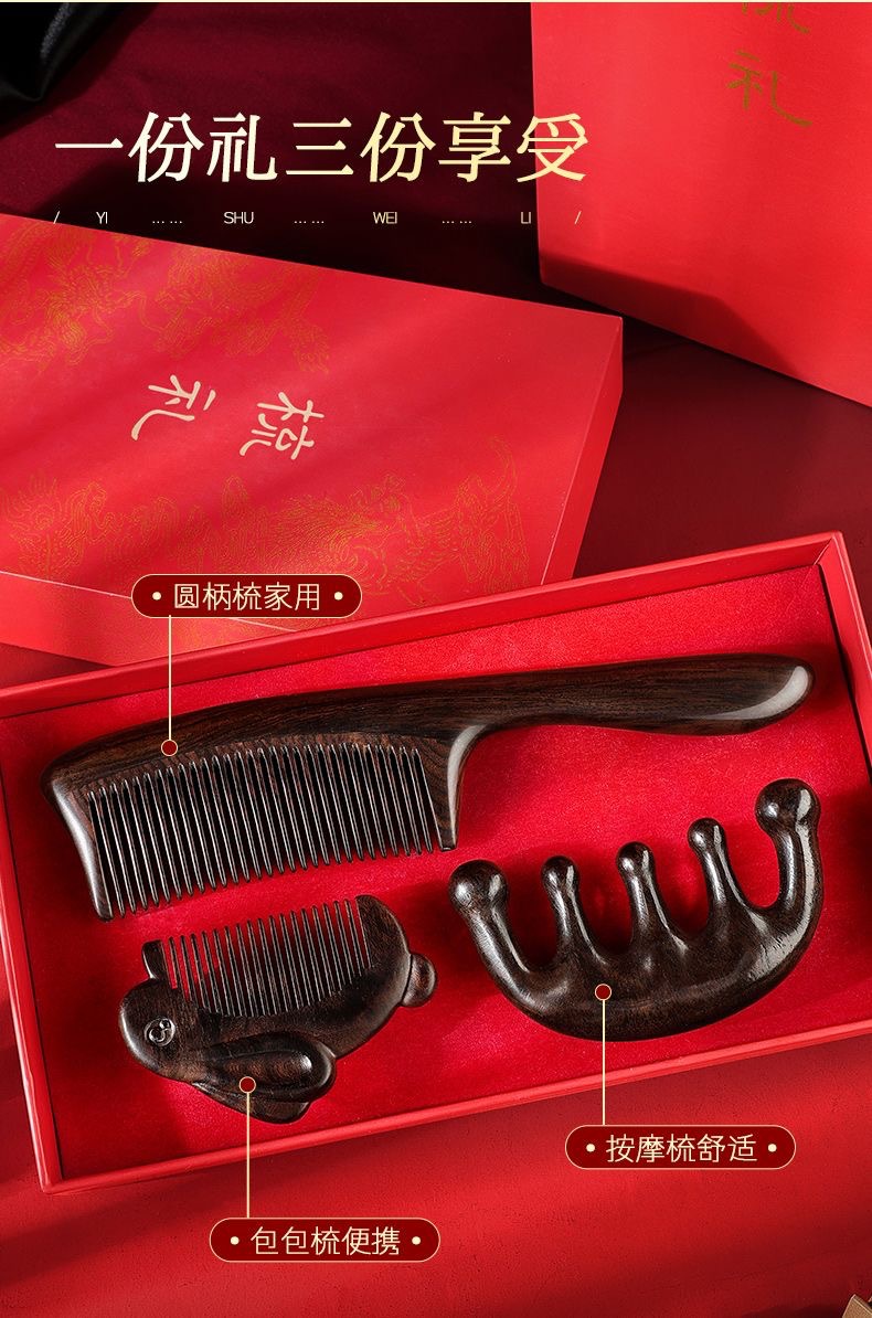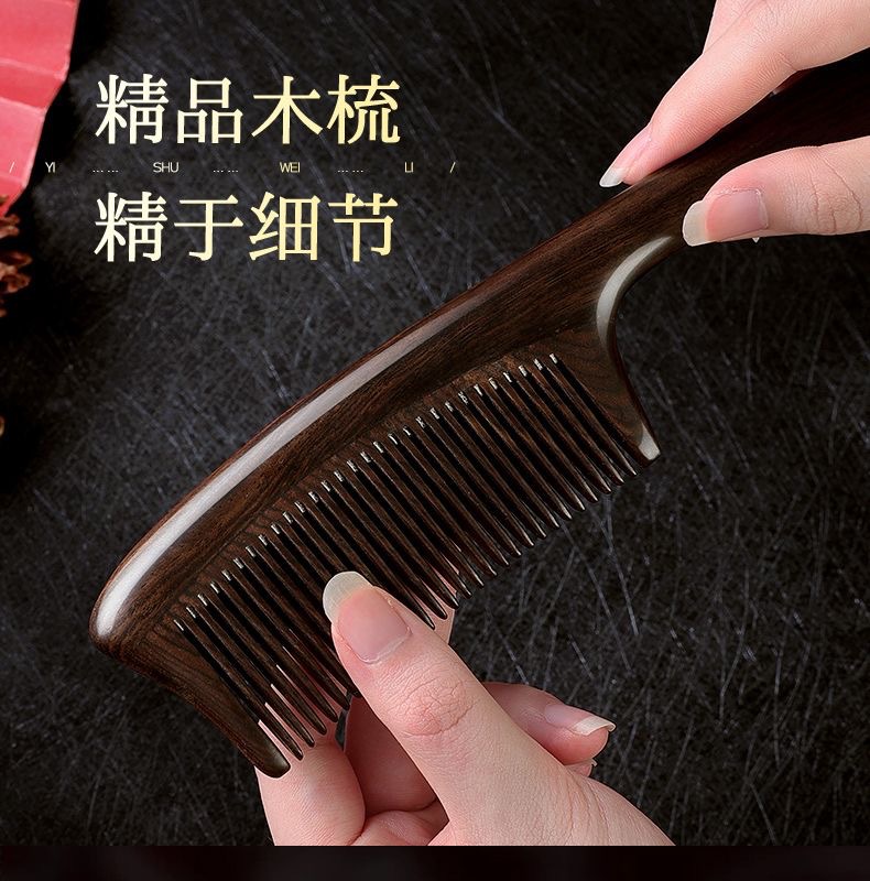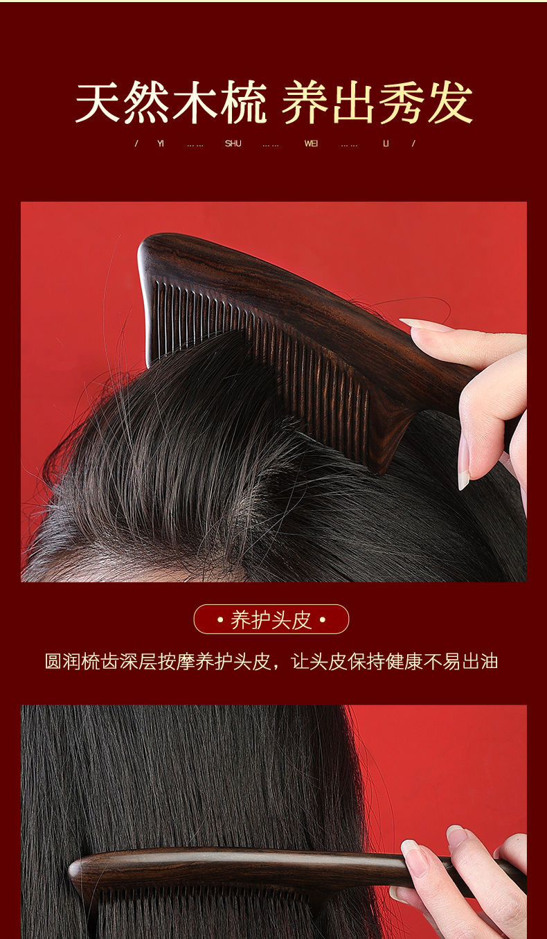 【以梳为礼!天然木梳】三八妇女节黑檀木梳子圆柄细齿梳经络梳直发木梳多功能礼品装节日礼品梳子。ry