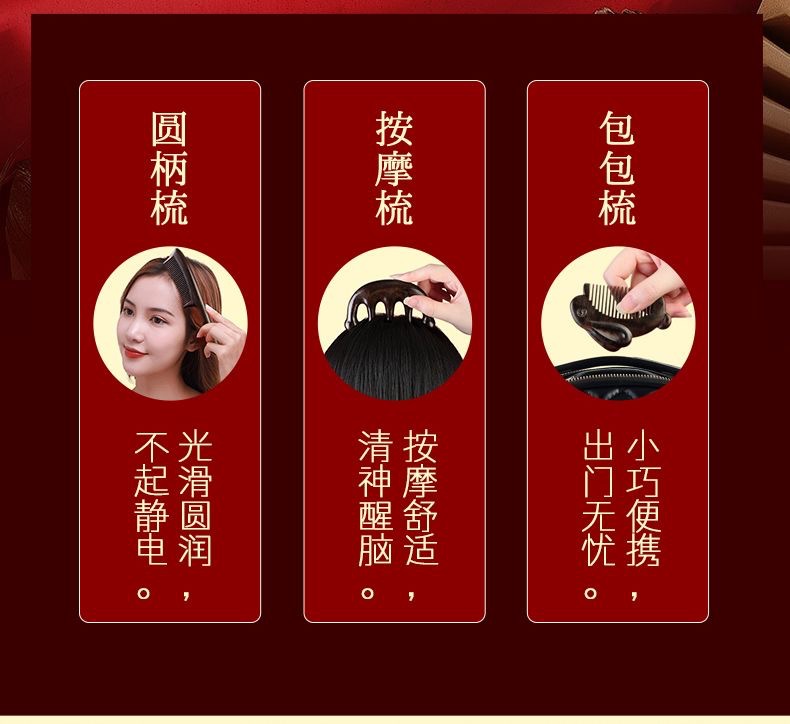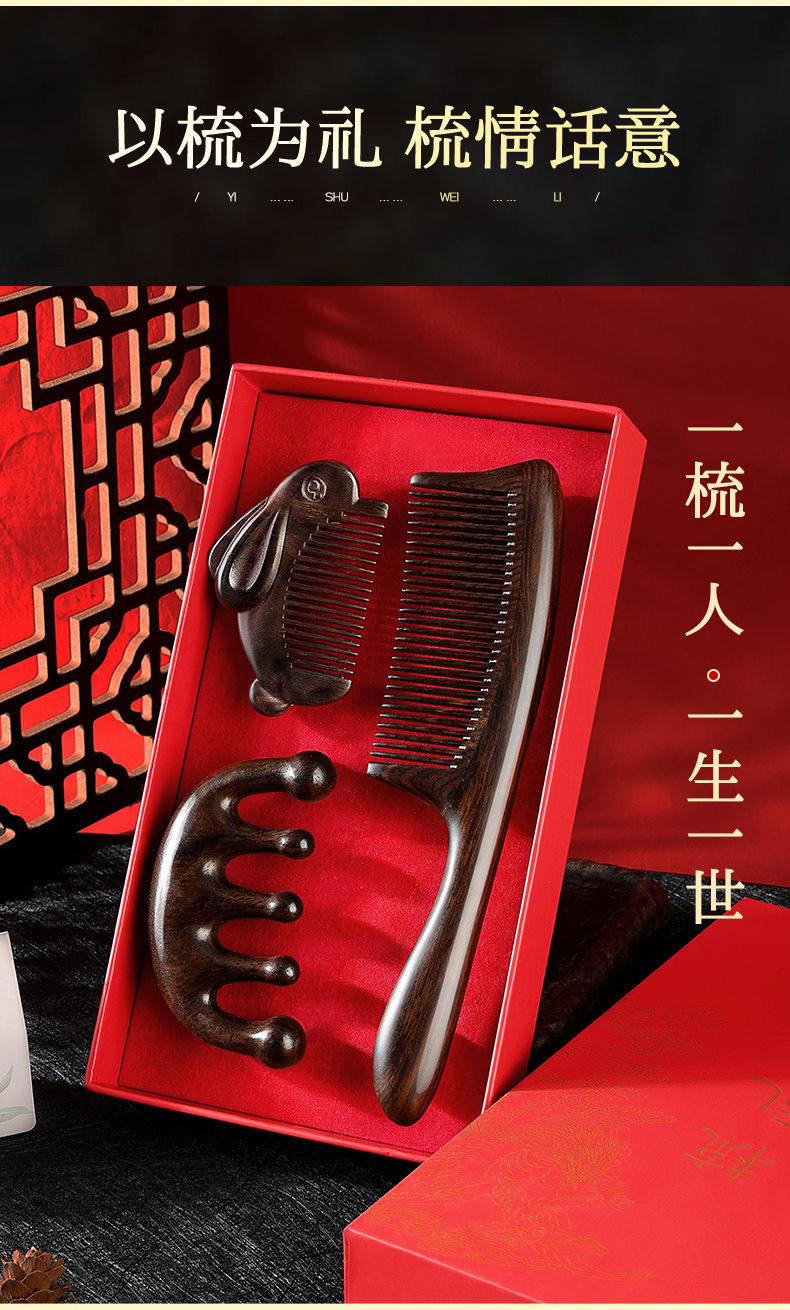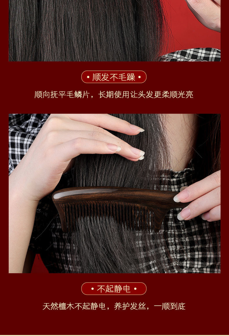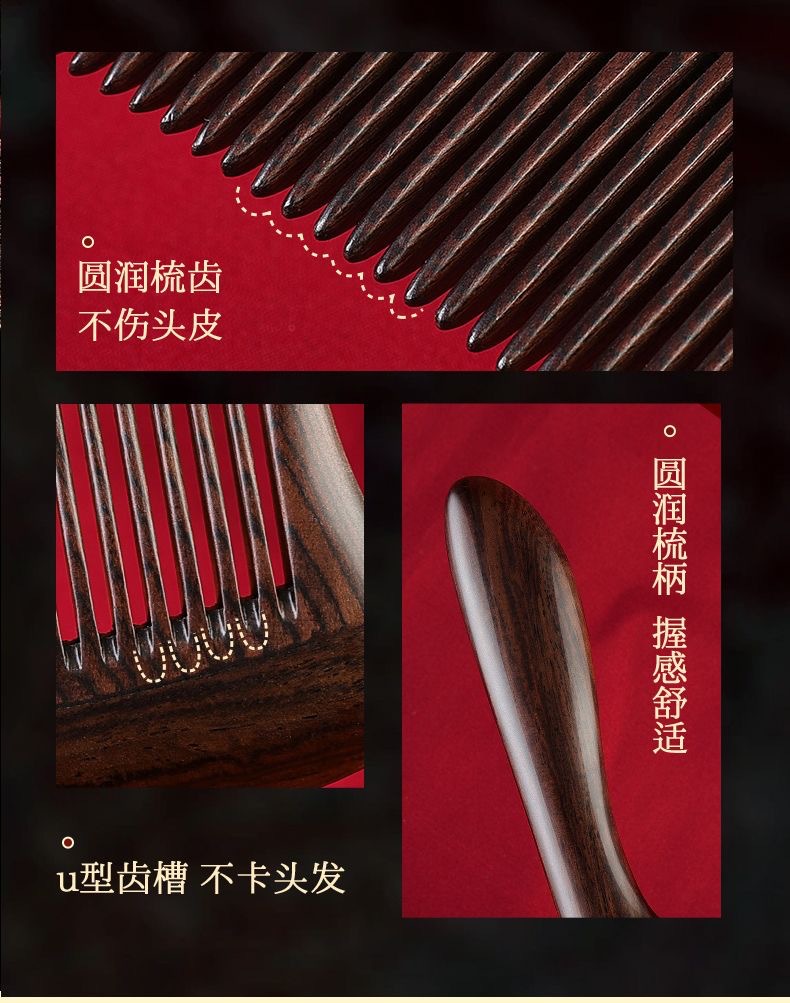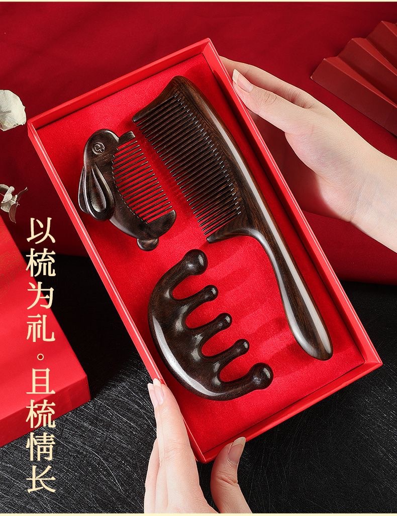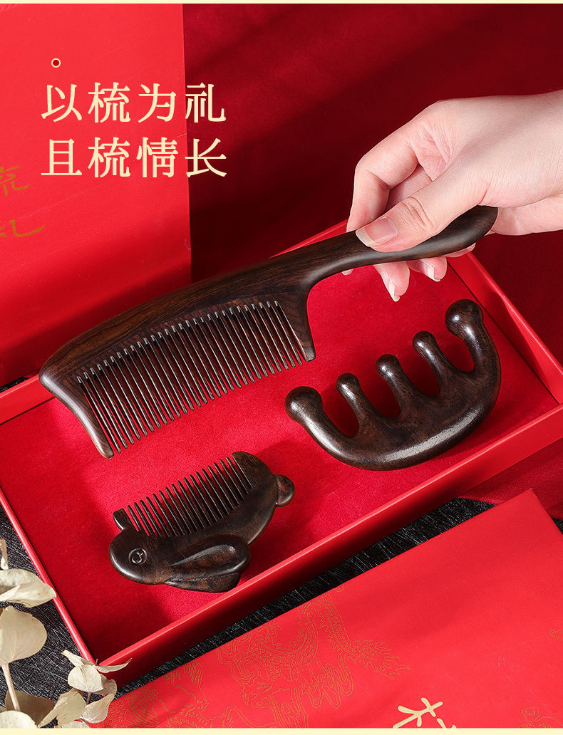 【以梳为礼!天然木梳】三八妇女节黑檀木梳子圆柄细齿梳经络梳直发木梳多功能礼品装节日礼品梳子。ry