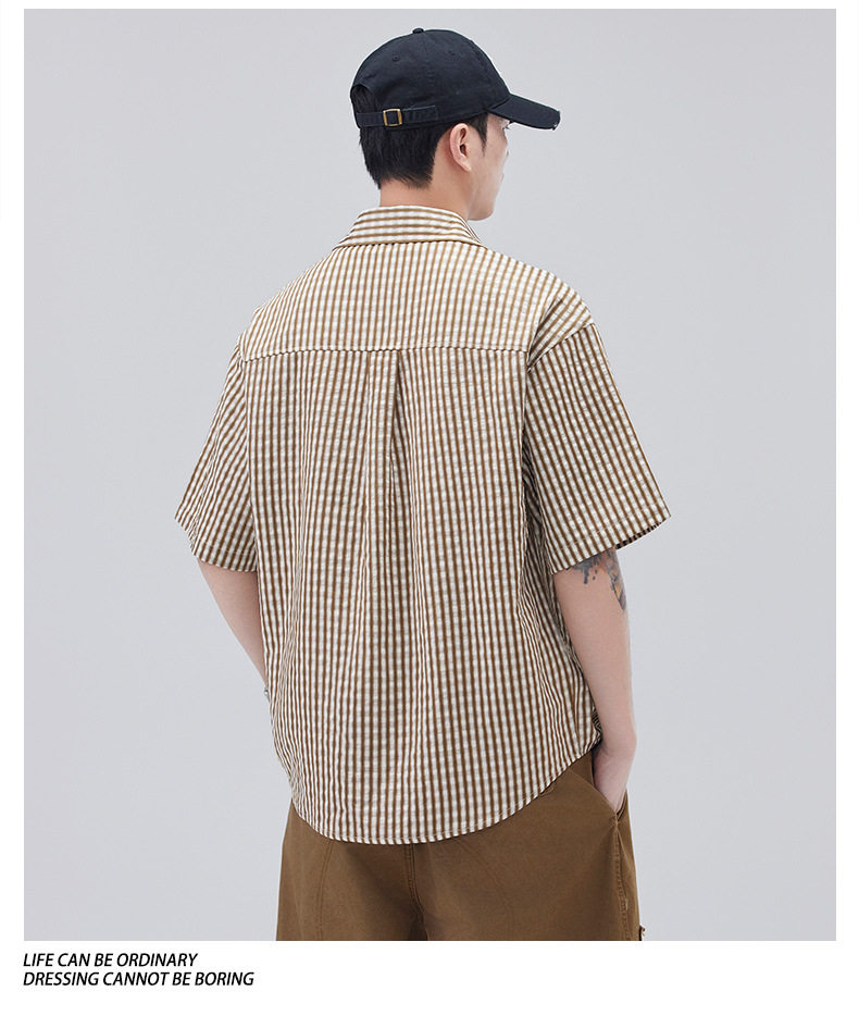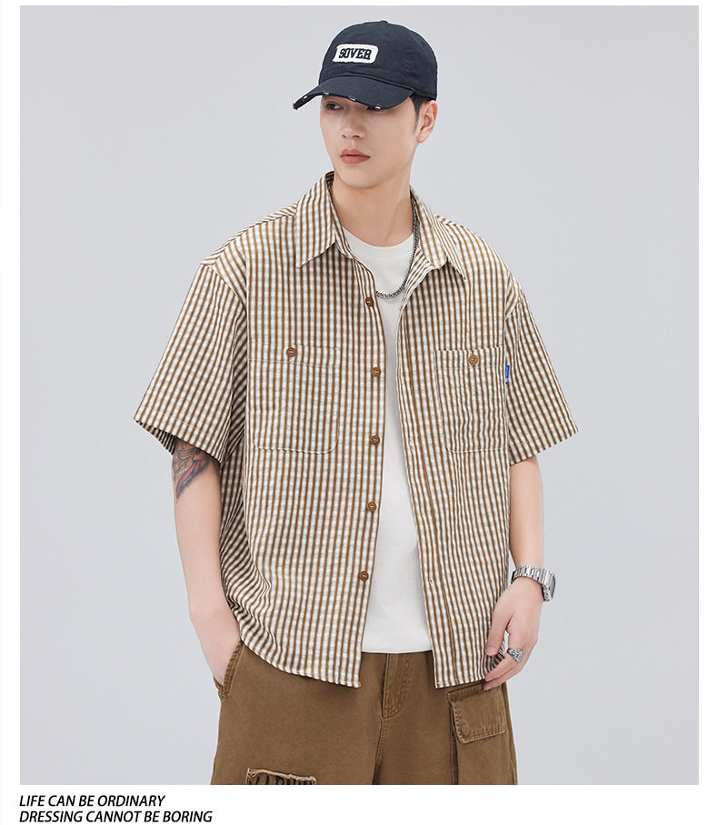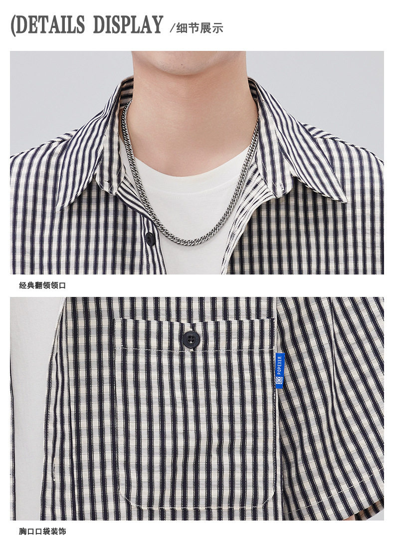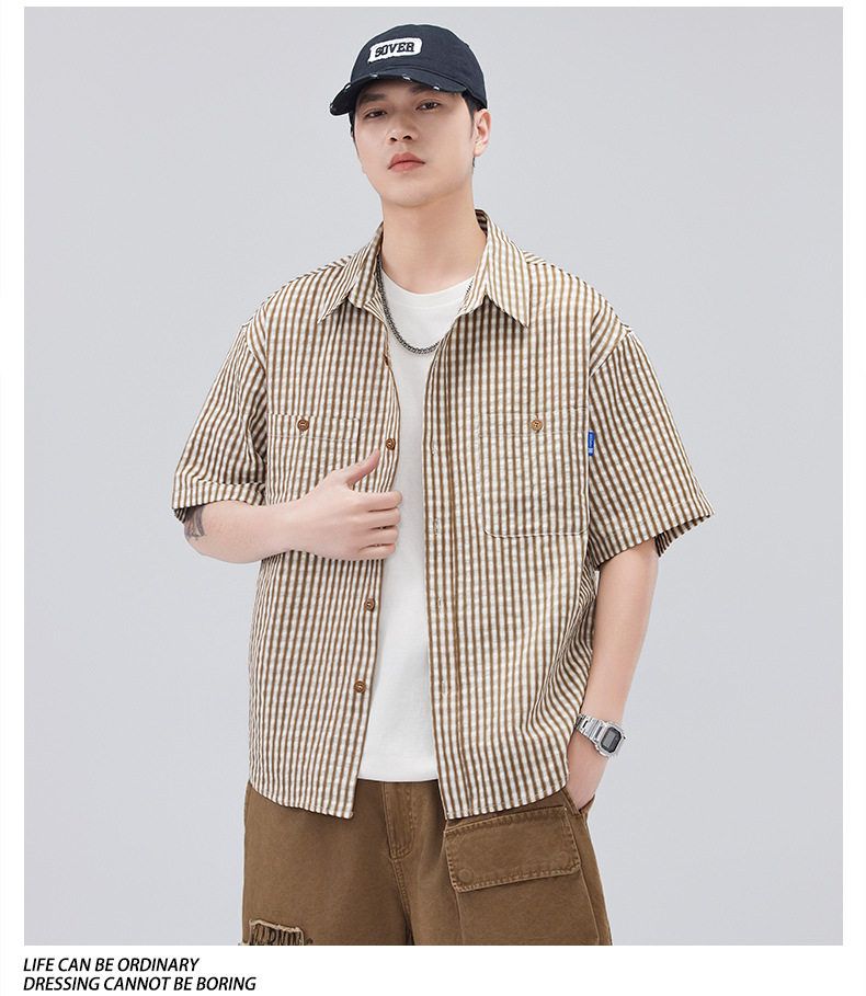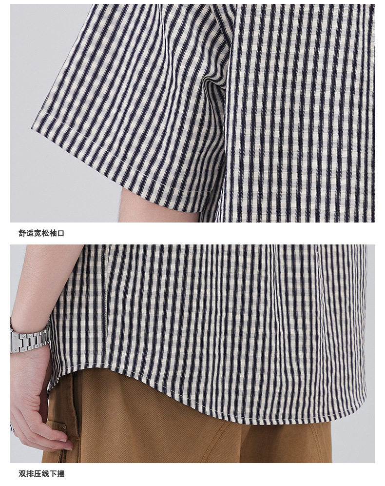新品港风复古条纹衬衫夏季男款潮牌短袖衬衣宽松休闲上衣 AY-D1318【AY-1318】