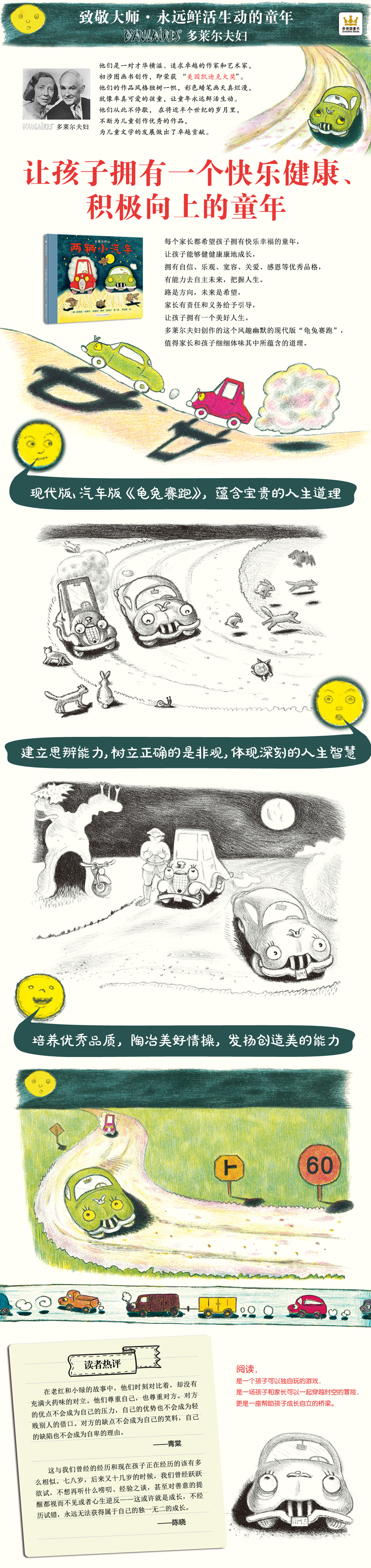 【2-5 岁】两辆小汽车:美国著名童书作家、凯迪克奖获得者—多莱尔夫妇的经典作品,被誉为现代版、汽车版的的《龟兔赛跑》,它让孩子明白怎么样做才是“ZUI棒的”