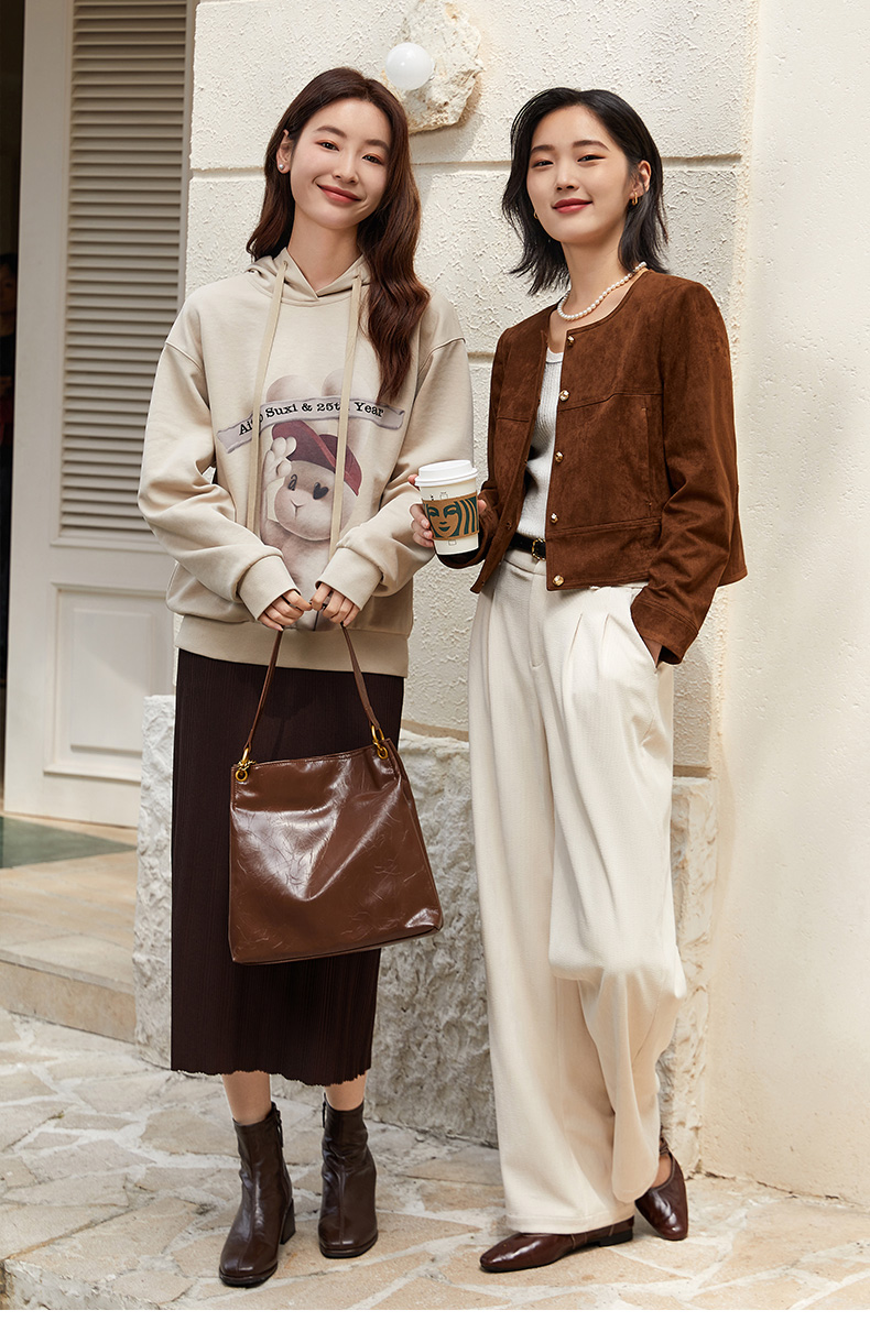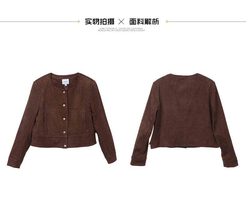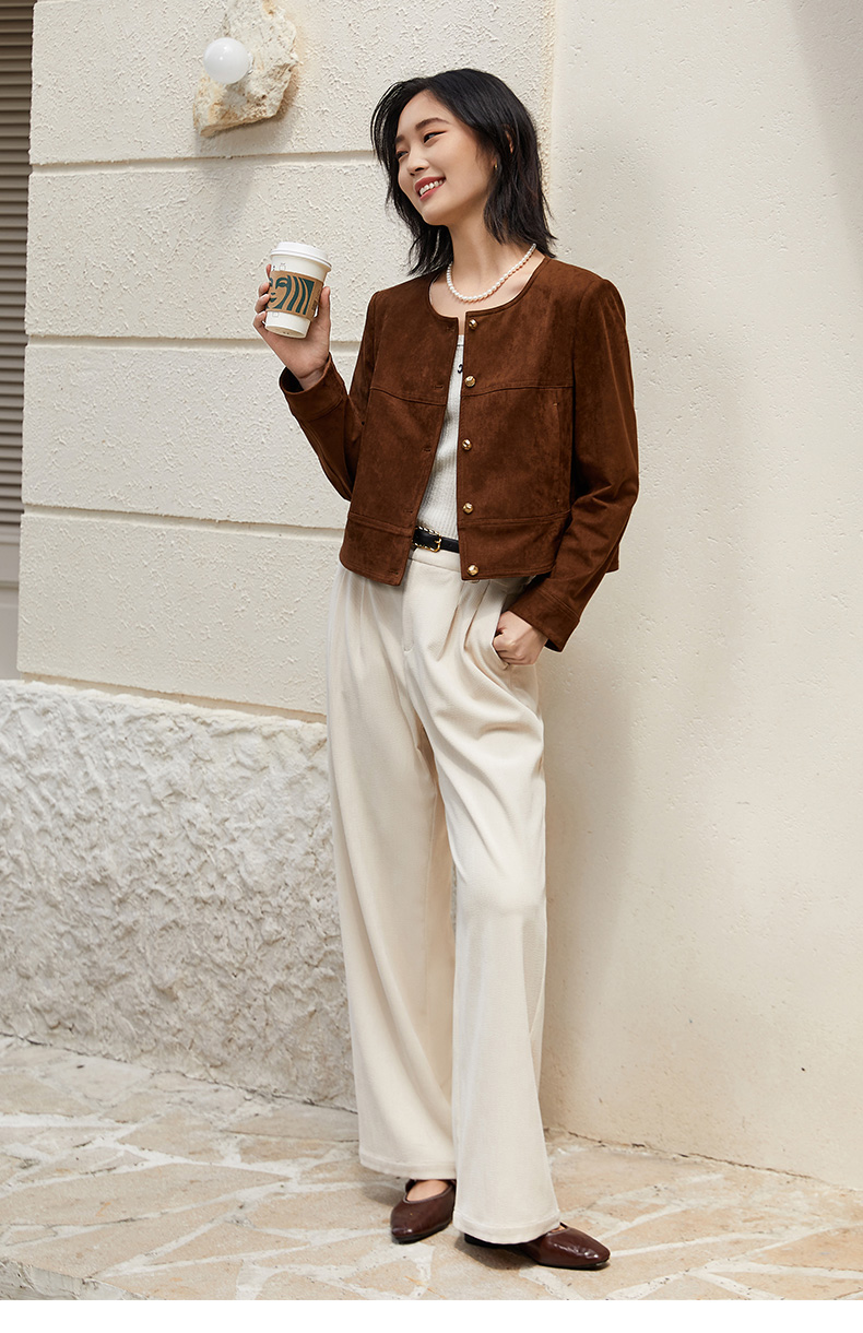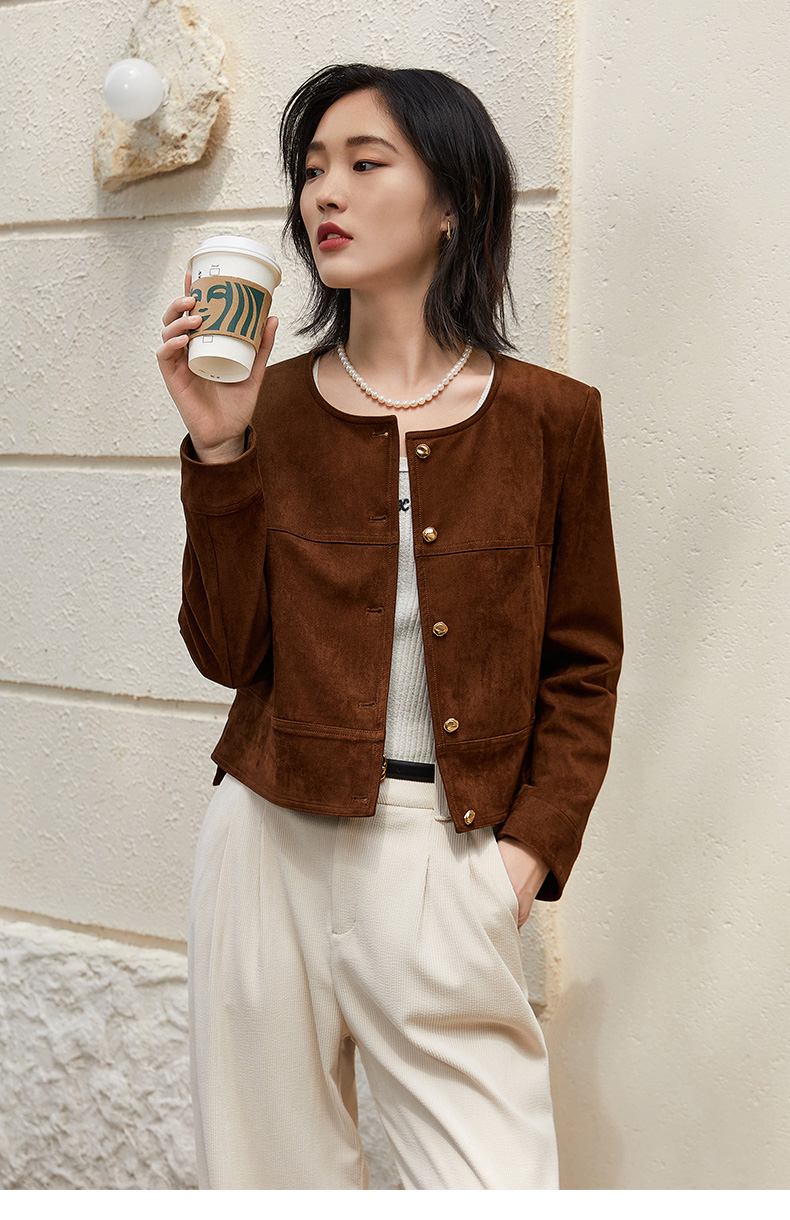 复古腔调拉满!棕色麂皮圆领短外套,打造优雅精致感