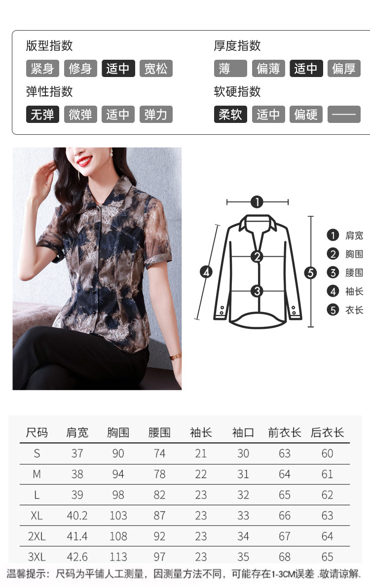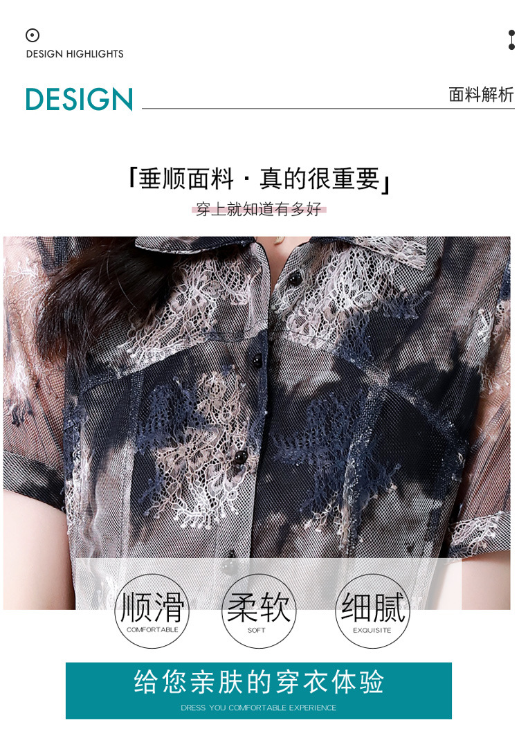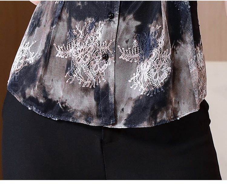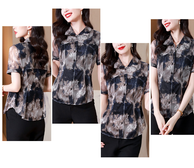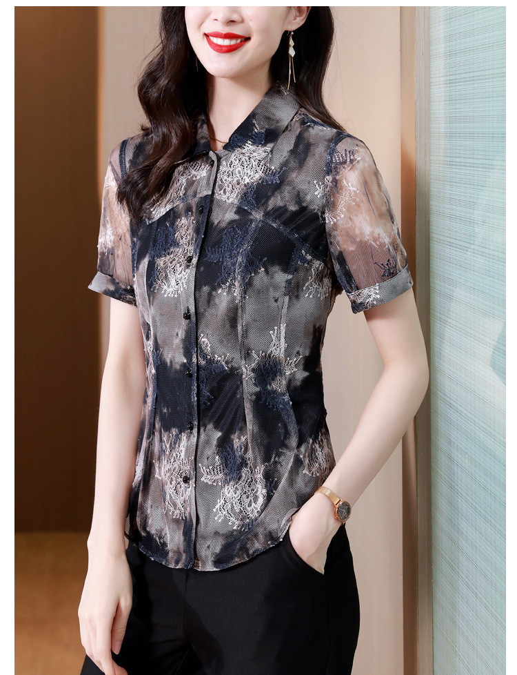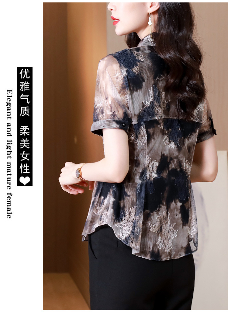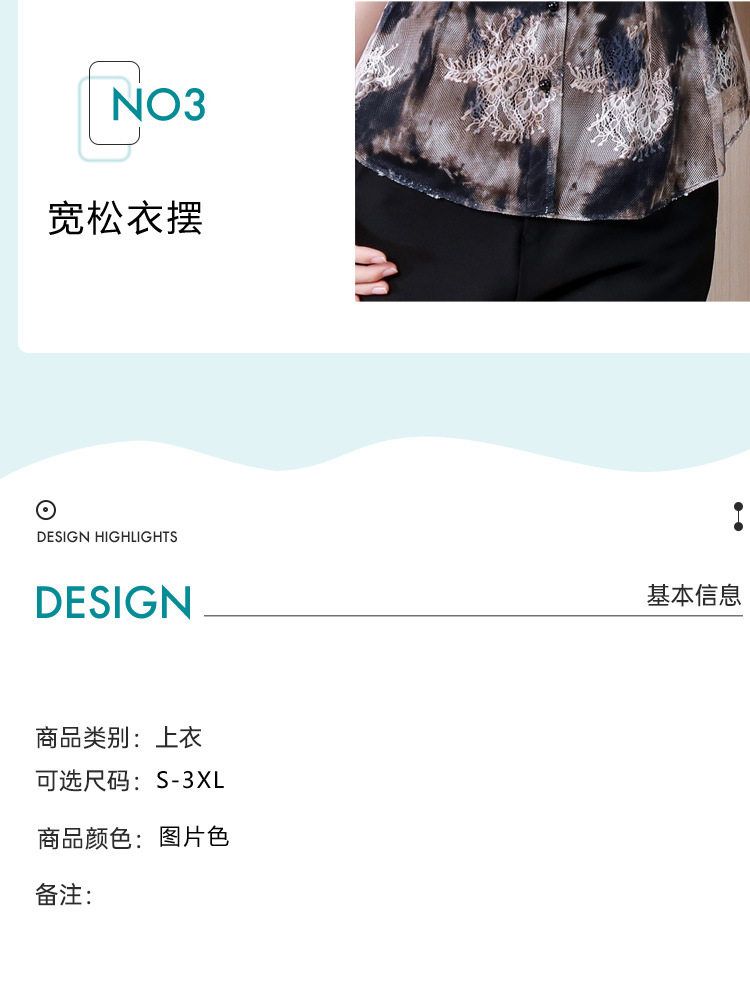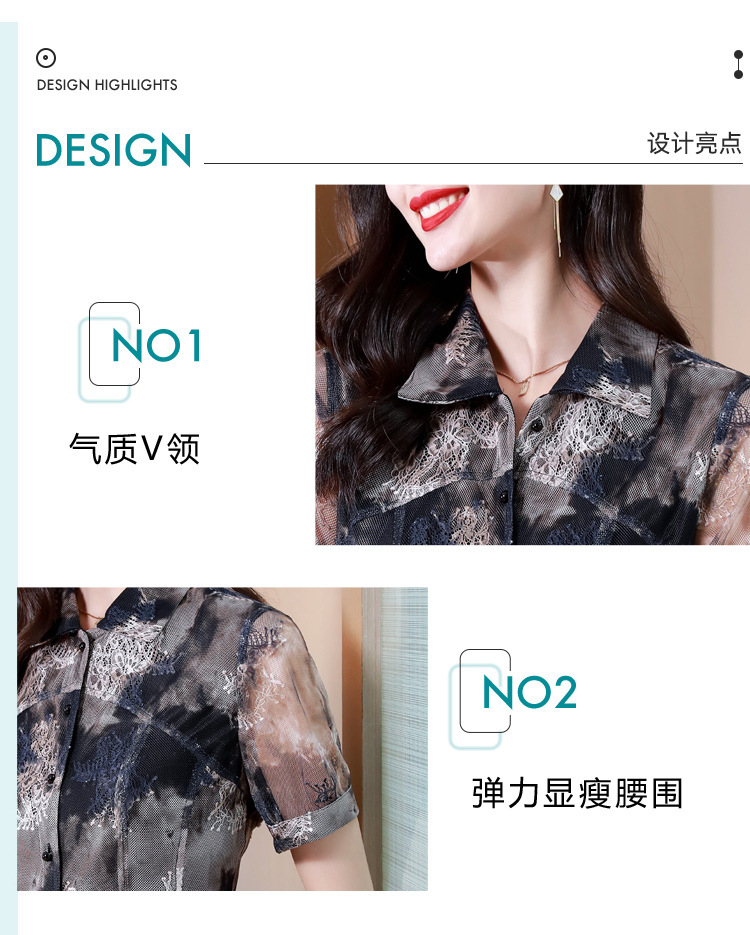 KQLB43N8352欧洲站2023夏季短袖蕾丝衫上衣女镂空网纱打底衫别致印花衬衫
