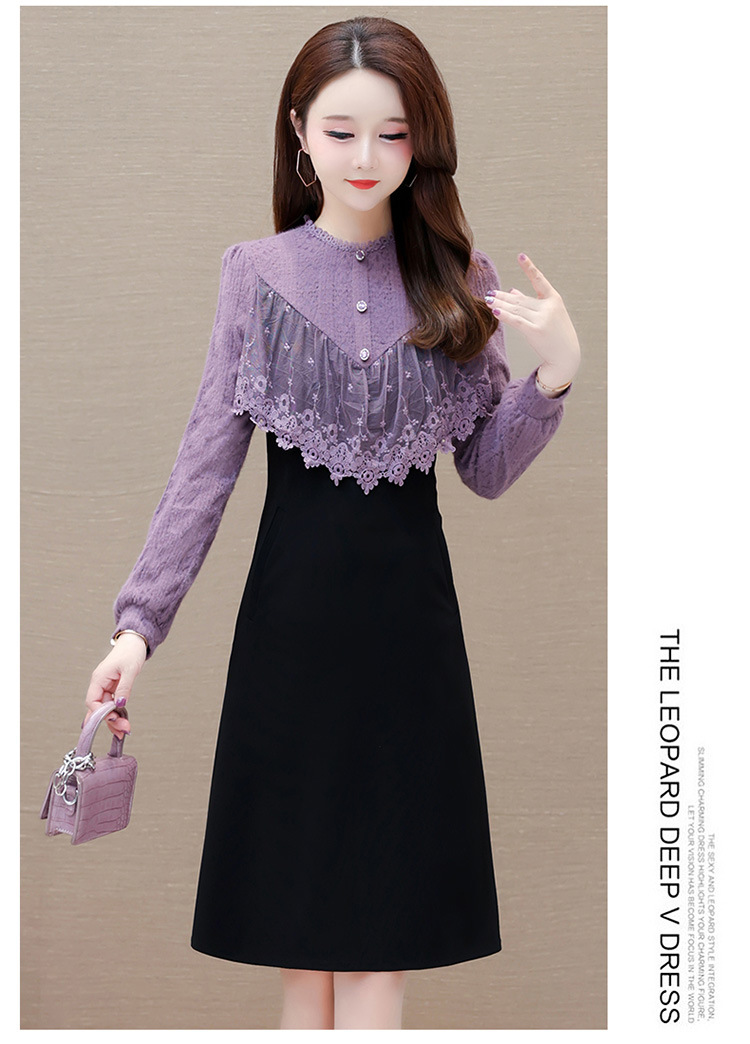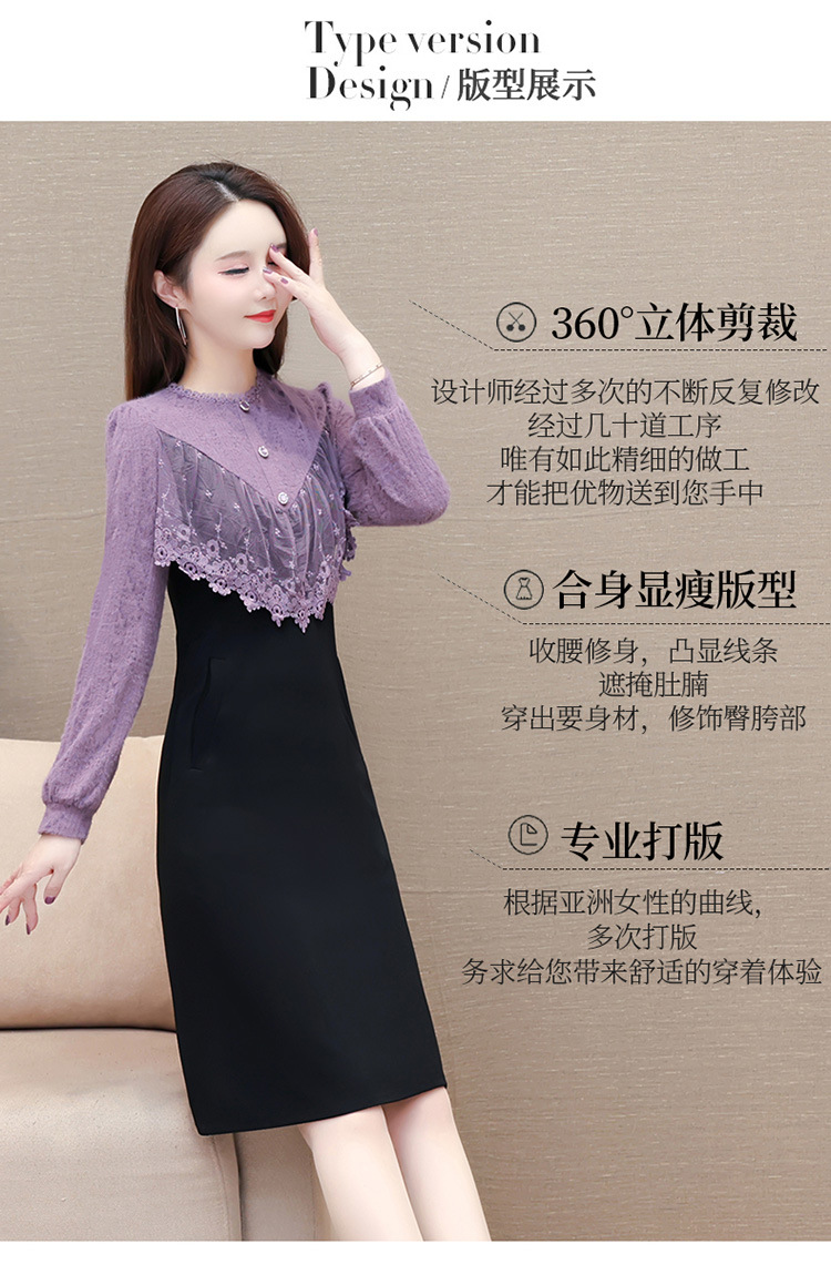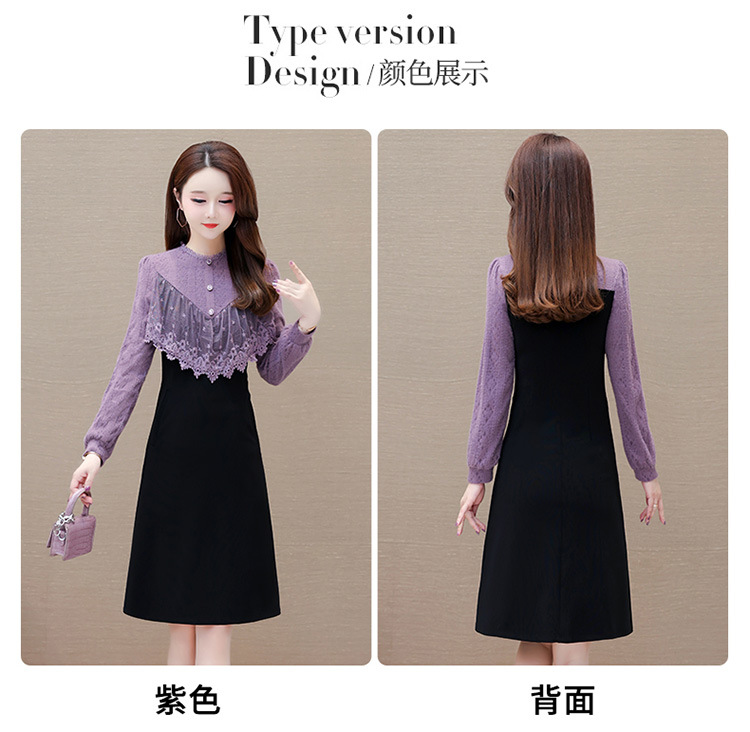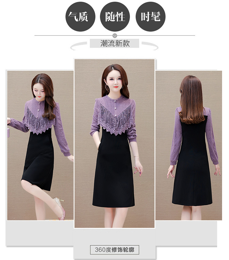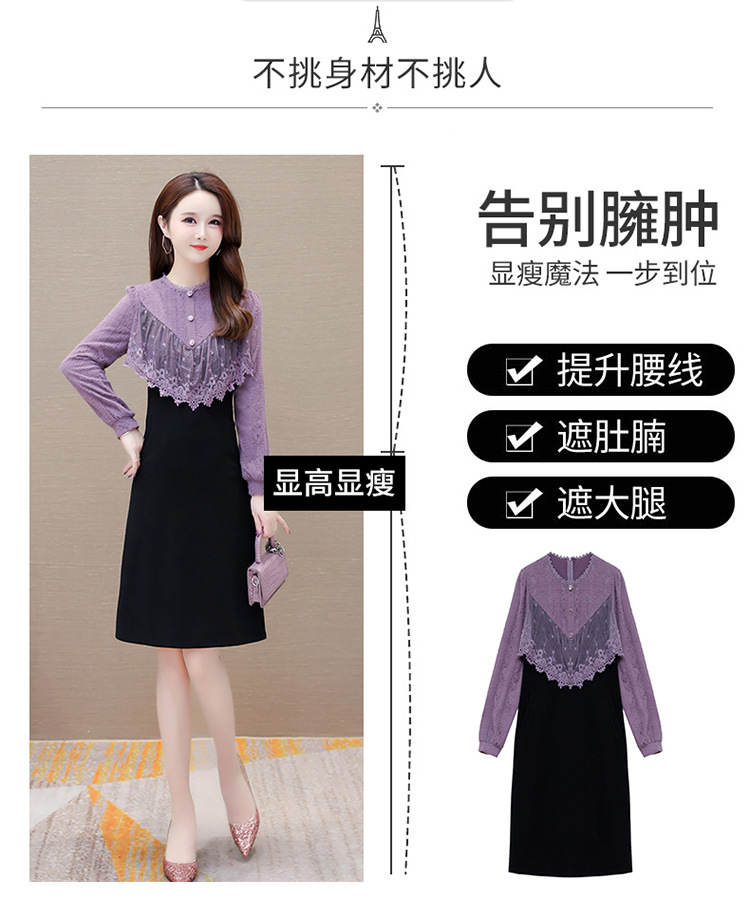 洋气修身,新款圆领长袖A字裙蕾丝拼接中长款假两件时尚连衣裙QYM-XQD-53B72-L