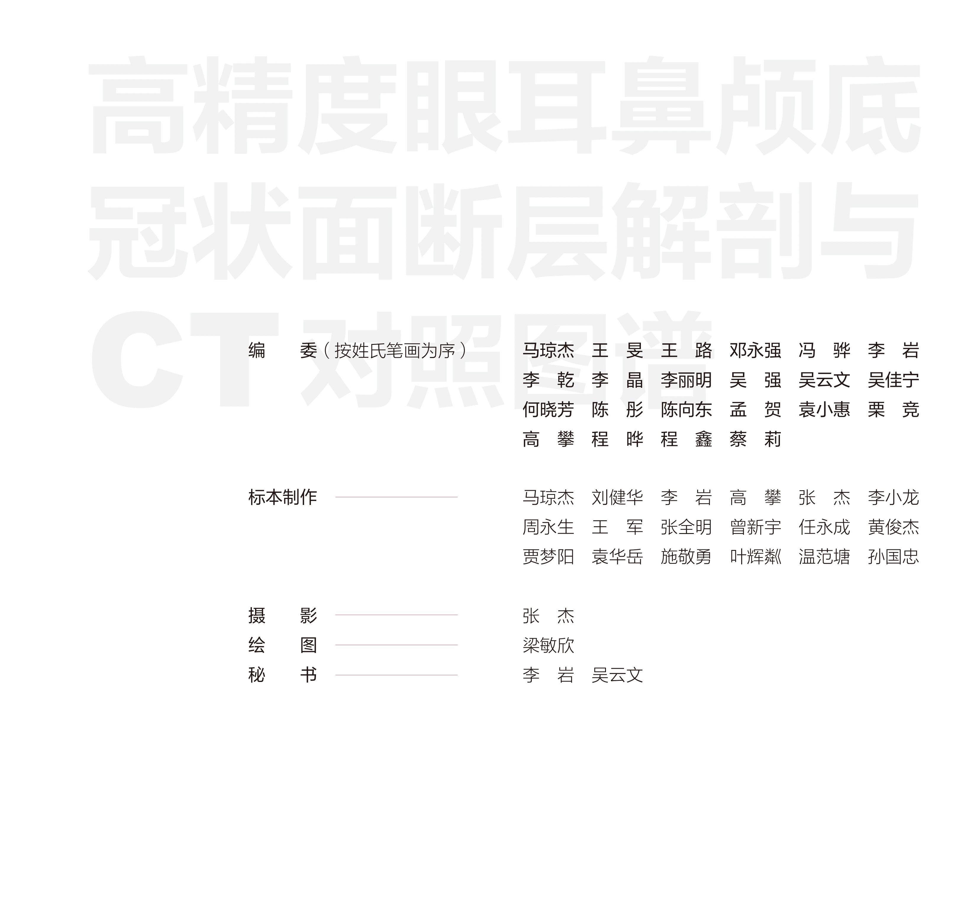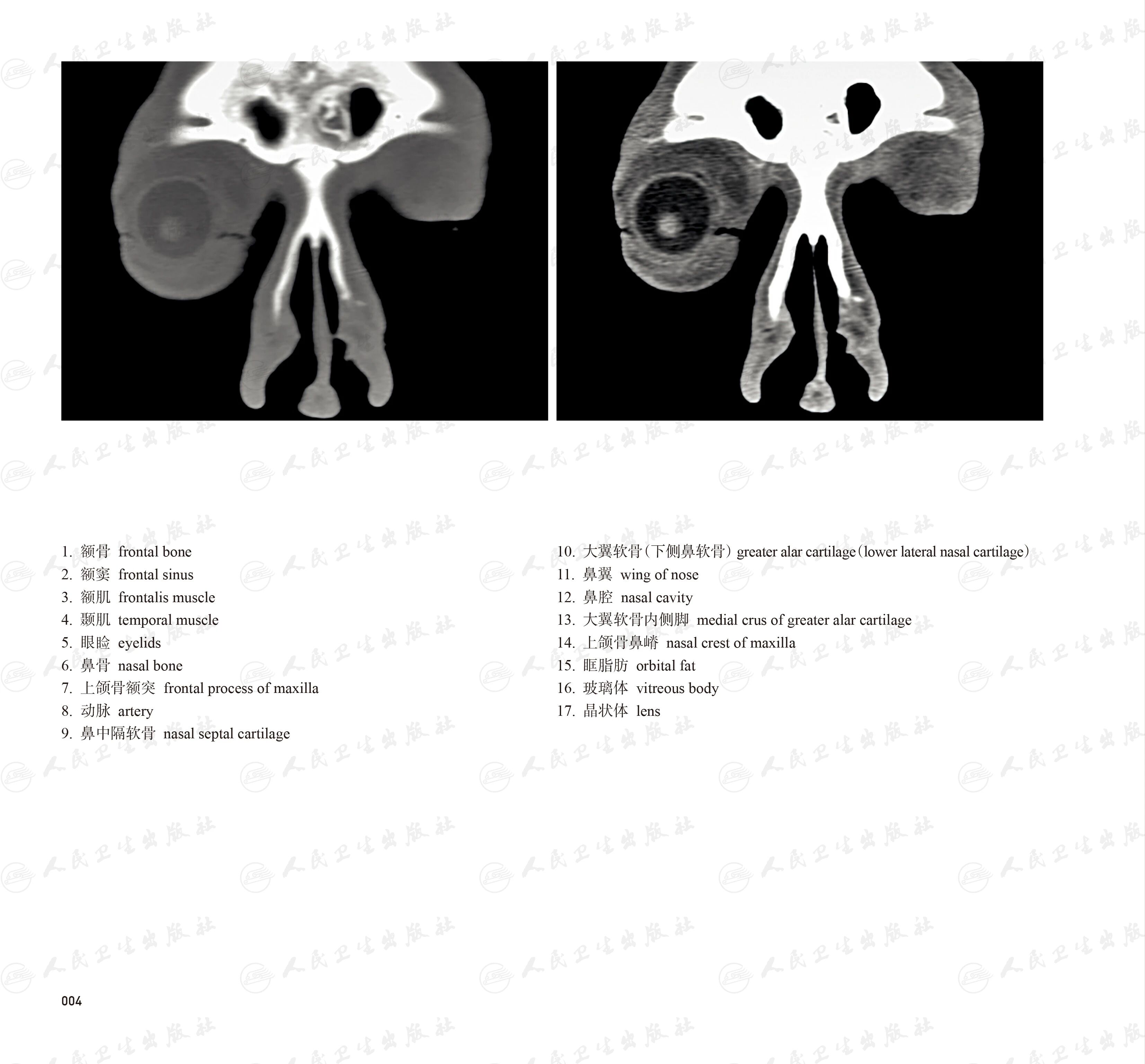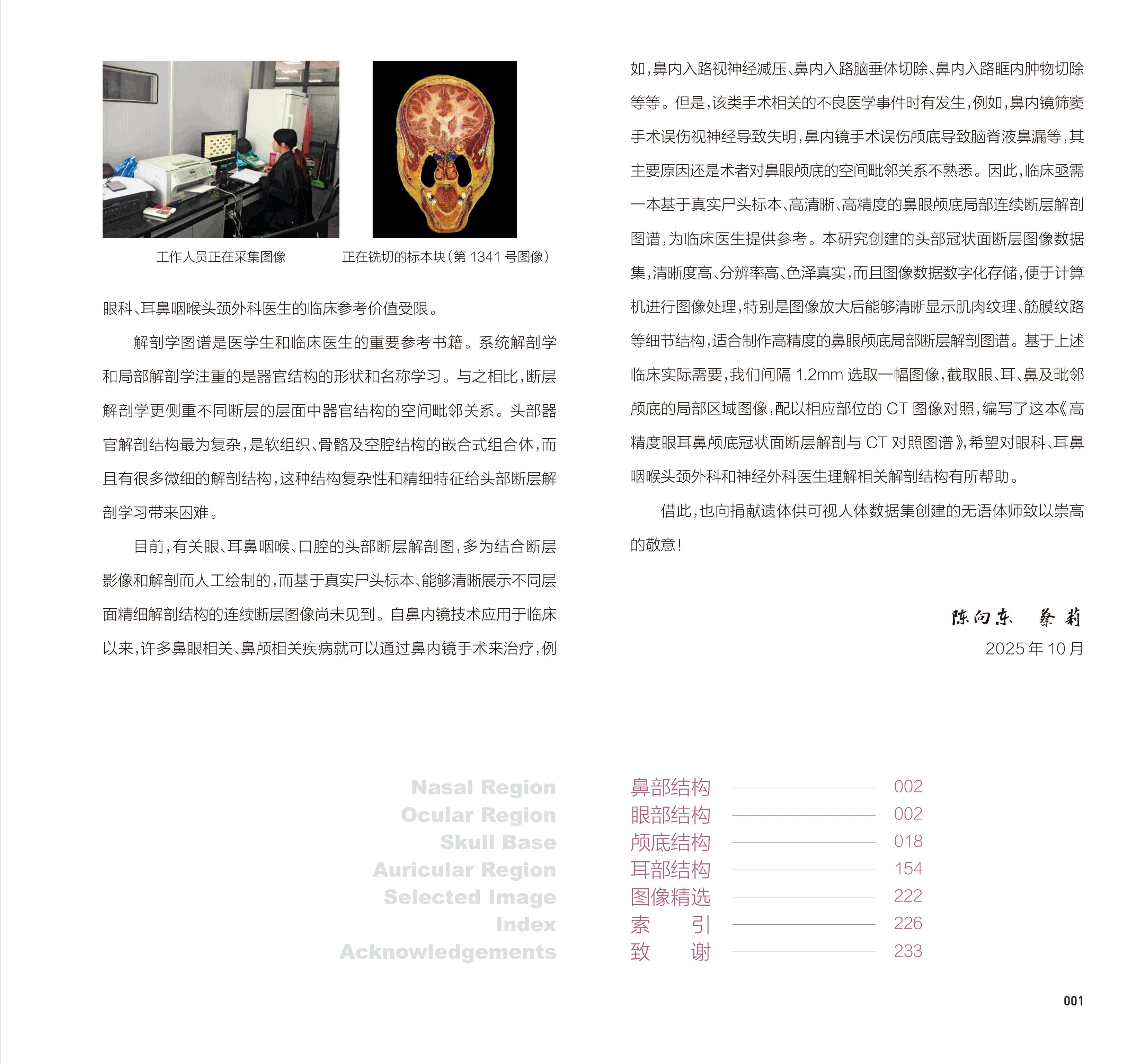 本书从数据集每隔1.2mm选取一幅图像,截取眼、耳、鼻及毗邻颅底的局部区域图像,共112幅图像。同时配以相应部位的CT图像对照。本书特色是断层解剖图利用数字图像处理技术优势,放大并清晰展示眼、耳、鼻及毗邻颅底断面的局部区域结构,组织色泽真实,甚至能够清晰显示肌肉纹理、筋膜纹路等细节结构,图像质量高于美国同类断层解剖彩色图的图像质量。对眼科、耳鼻咽喉科和神经内外科医生理解相关解剖结构有较大帮助。