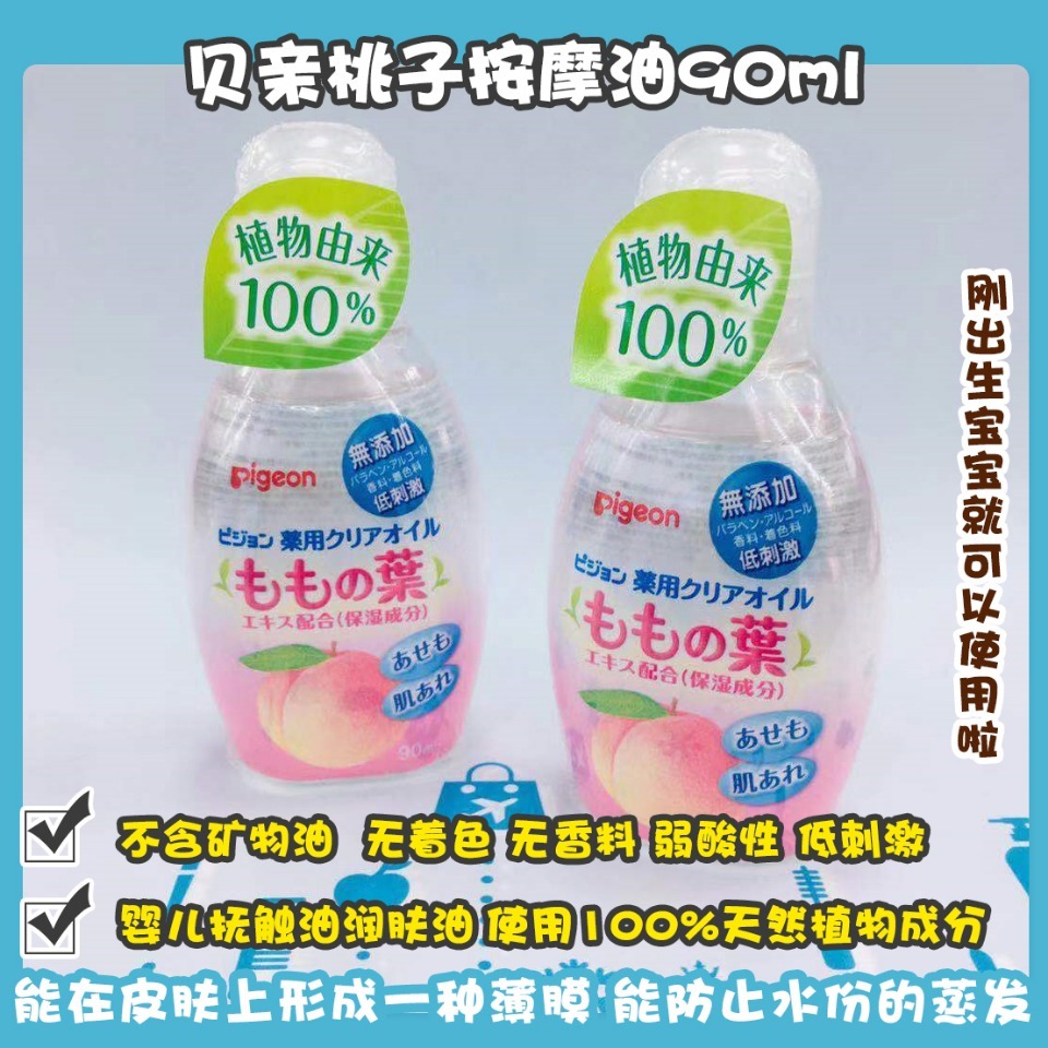 贝亲桃子按摩油90ml 👍婴儿抚触油润肤油💧,使用100%天然植物成分🌿,不含矿物油。🙅无着色,无香料,弱酸性,低刺激。特别添加保湿成分桃叶精华🍑,能在皮肤上形成一种薄膜✅,能防止水份的蒸发🌬,让角质细胞锁住水份😊,很保湿哦💦!还能防止皮肤养分流失,使宝宝皮肤柔嫩光滑✨。宝妈们大可放心😇,它是与婴儿皮肤相近的弱酸性,安全温和✅,刚出生宝宝就可以使用啦👶~