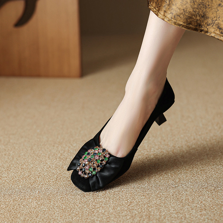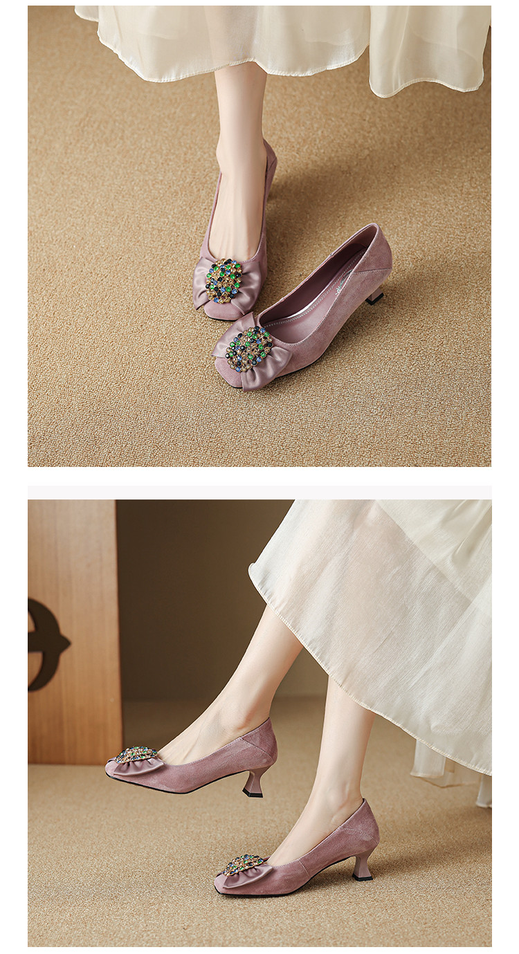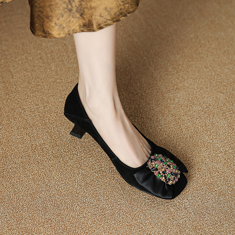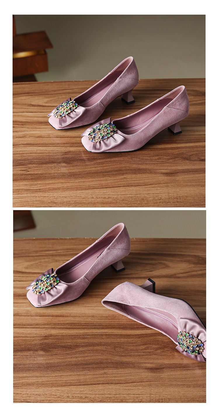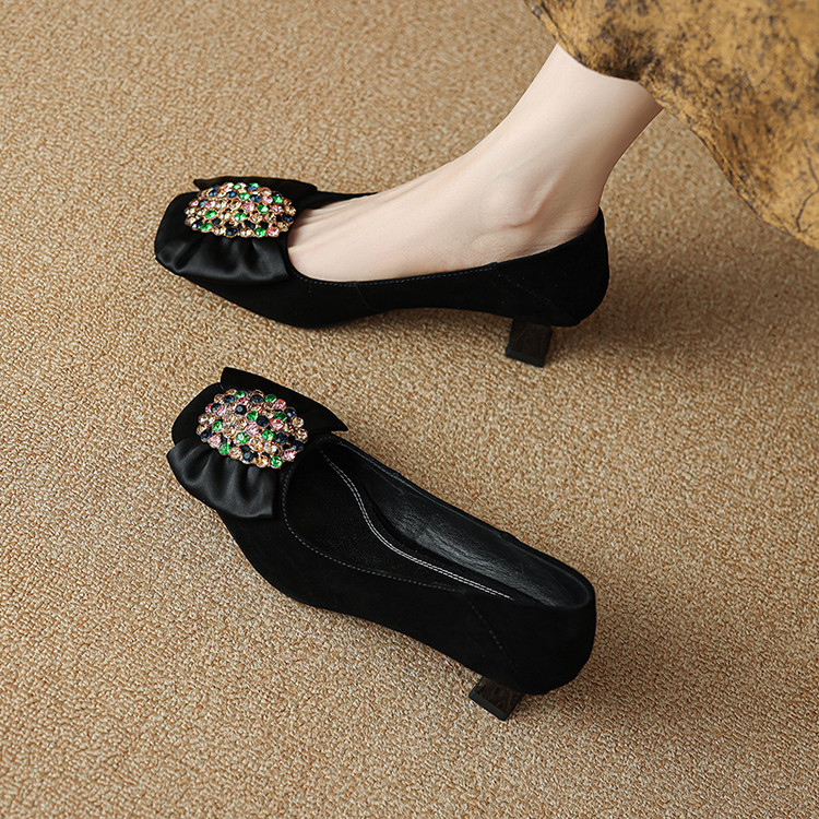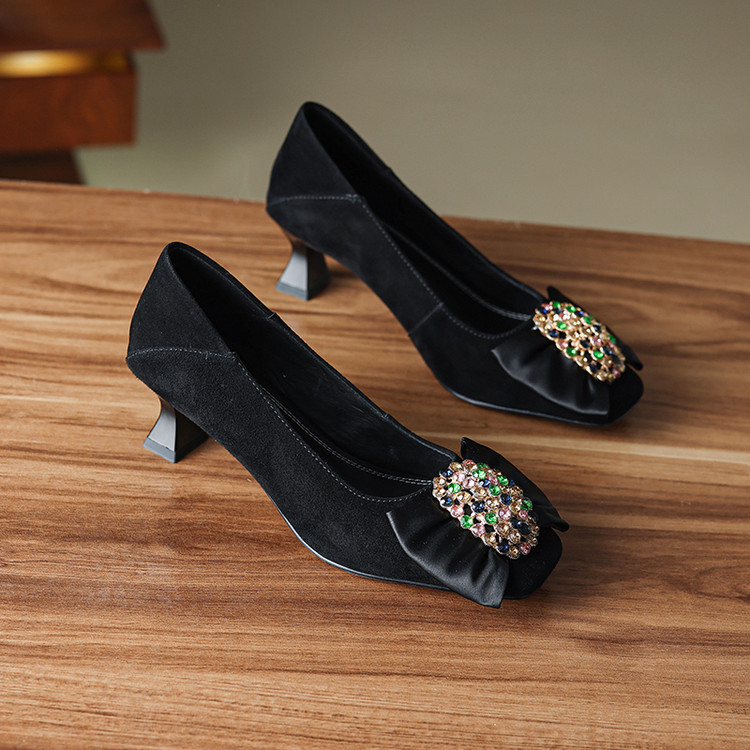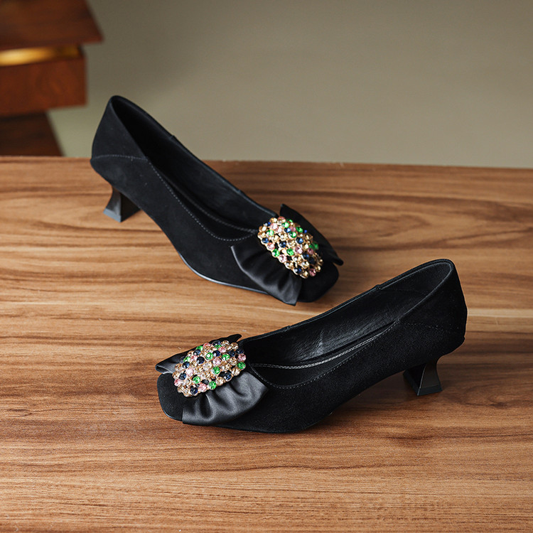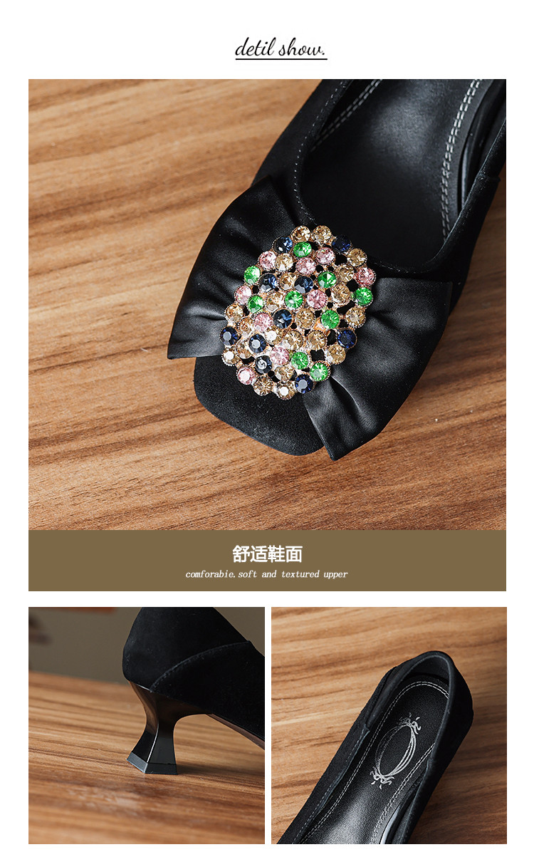 【预售5天】法式蝴蝶结水钻浅口气质单鞋方头女鞋软皮中跟高跟鞋HYT&MS-7429