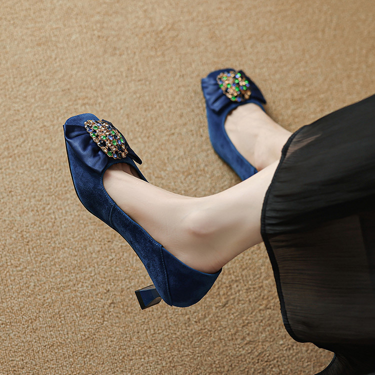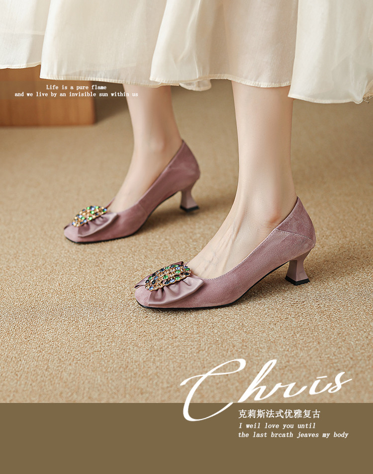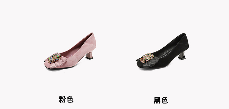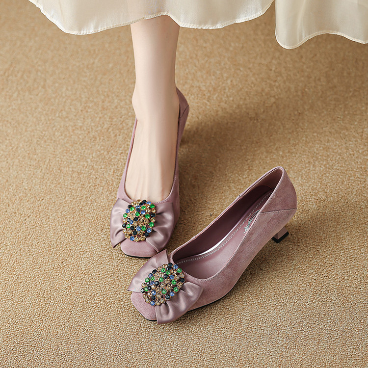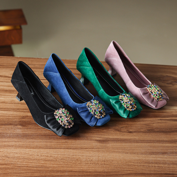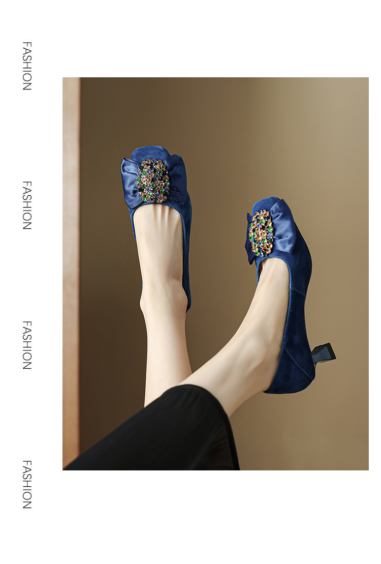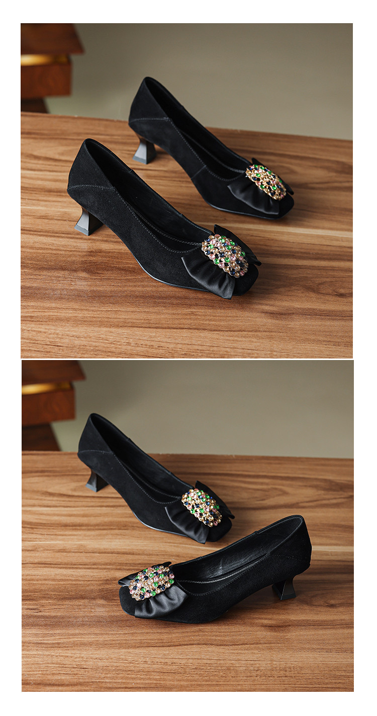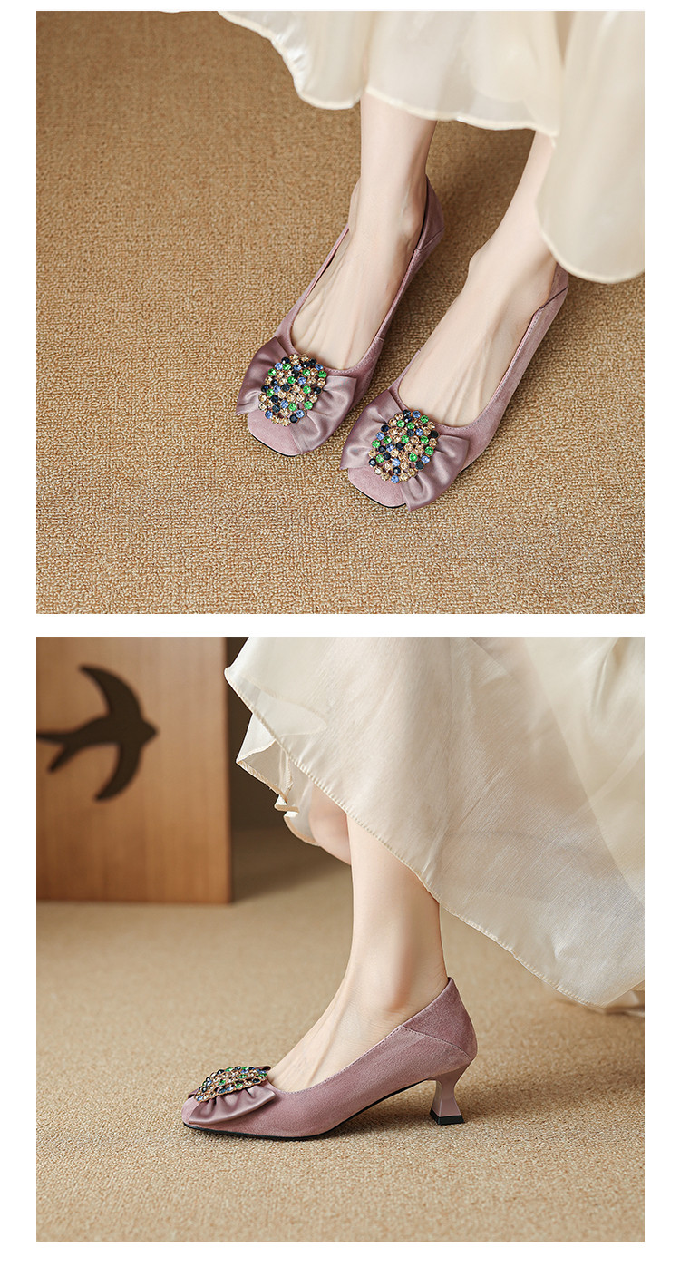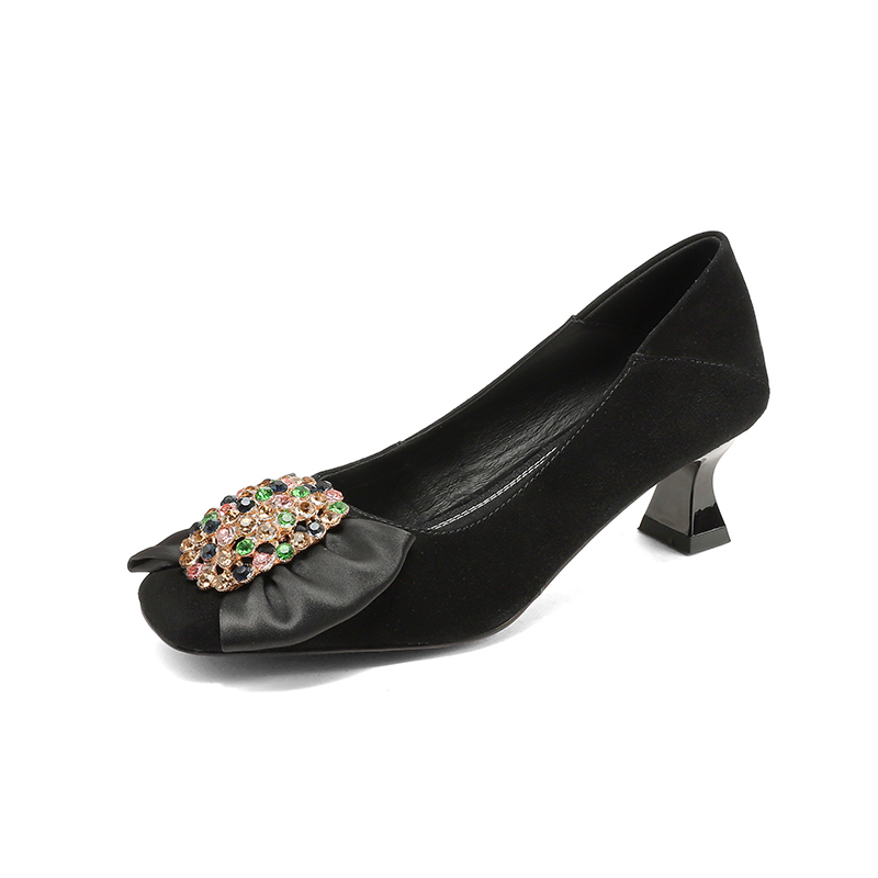 【预售5天】法式蝴蝶结水钻浅口气质单鞋方头女鞋软皮中跟高跟鞋HYT&MS-7429