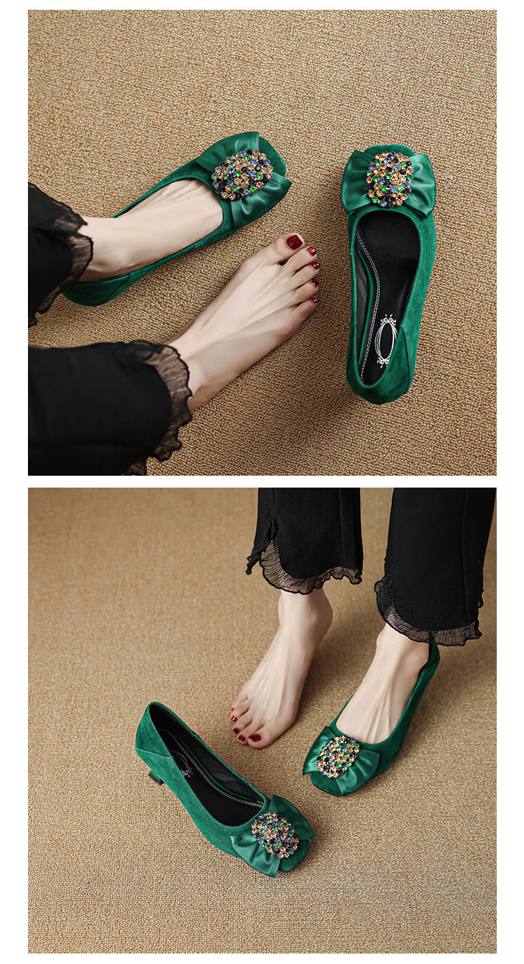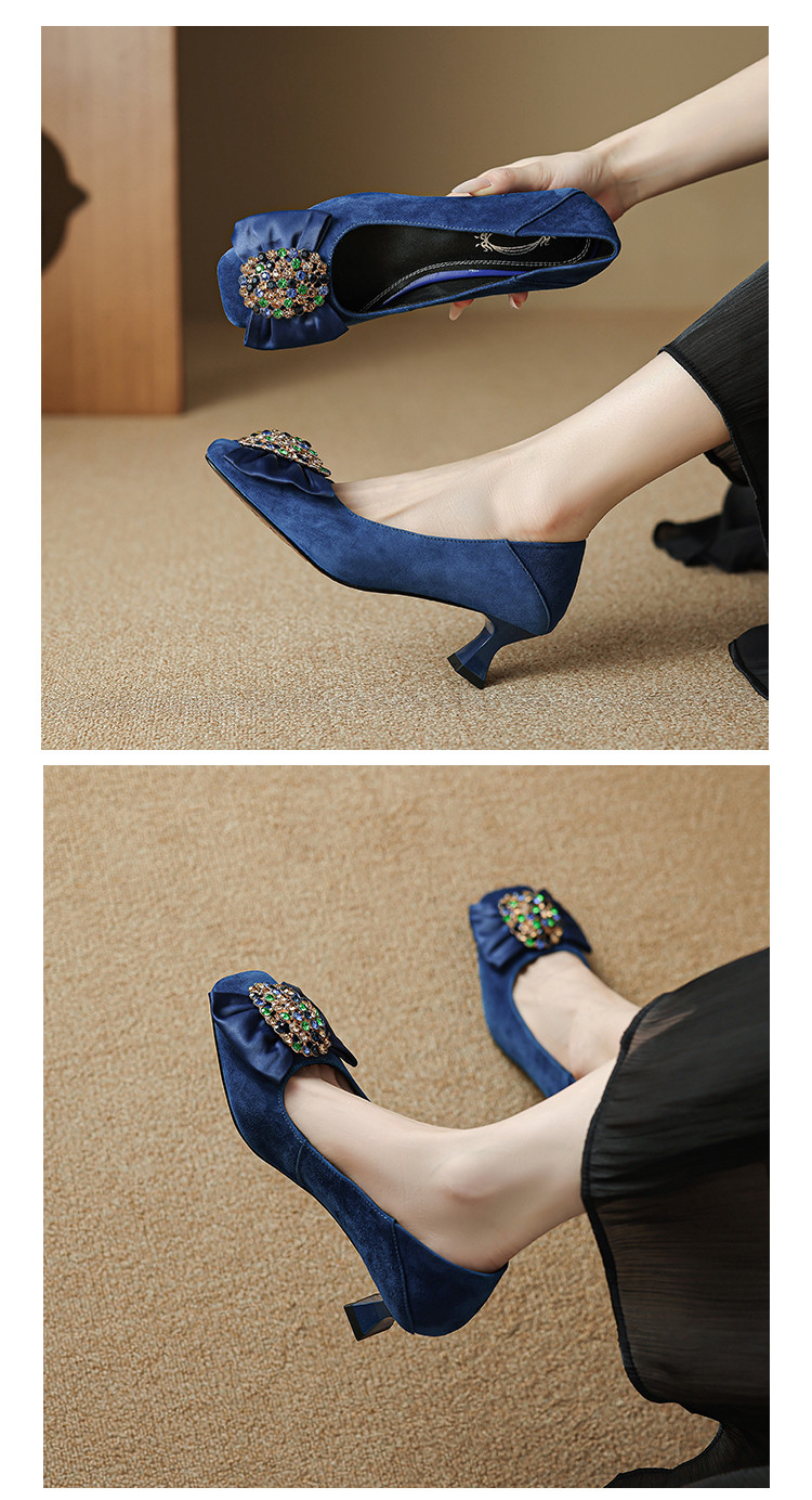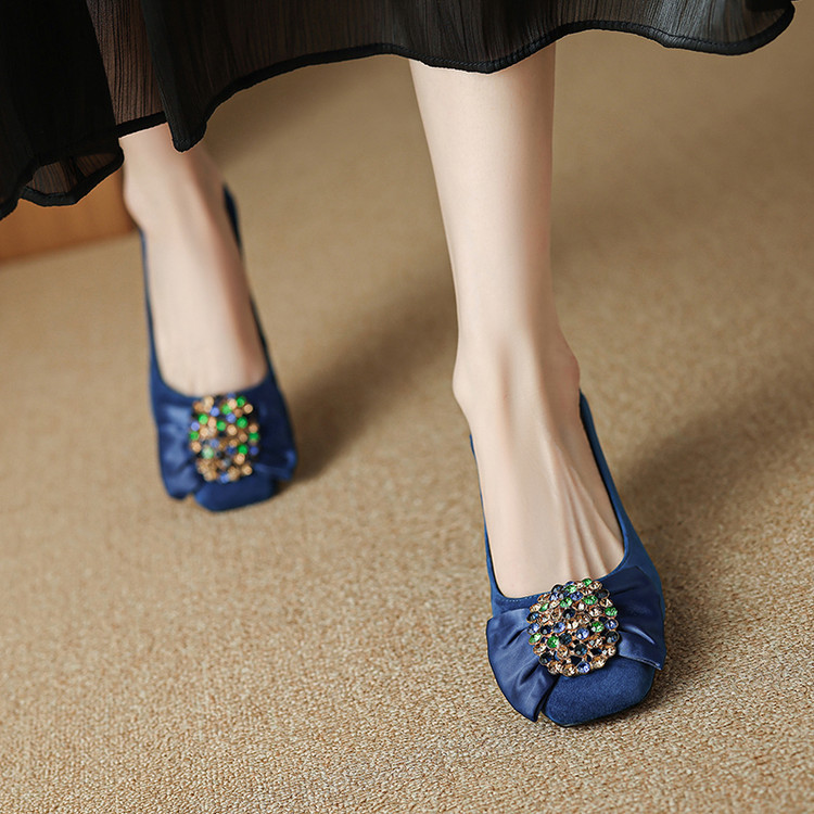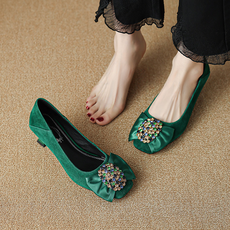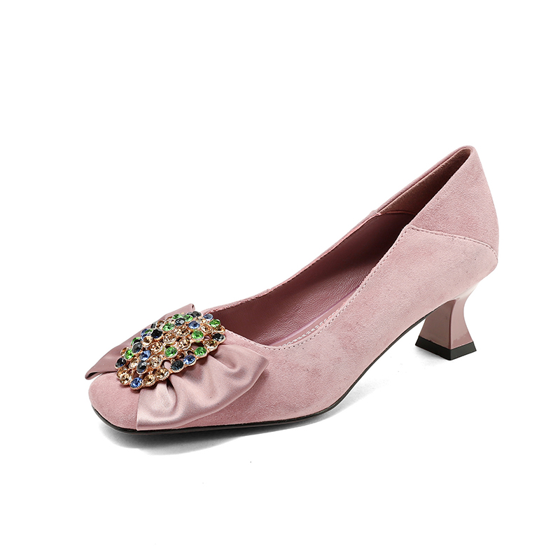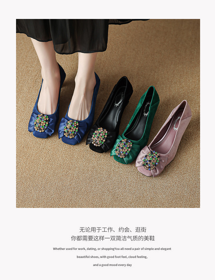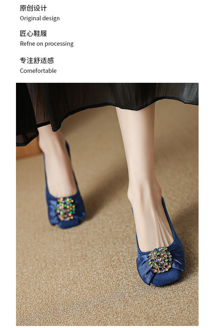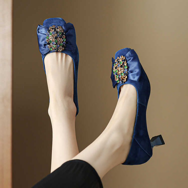 【预售5天】法式蝴蝶结水钻浅口气质单鞋方头女鞋软皮中跟高跟鞋HYT&MS-7429