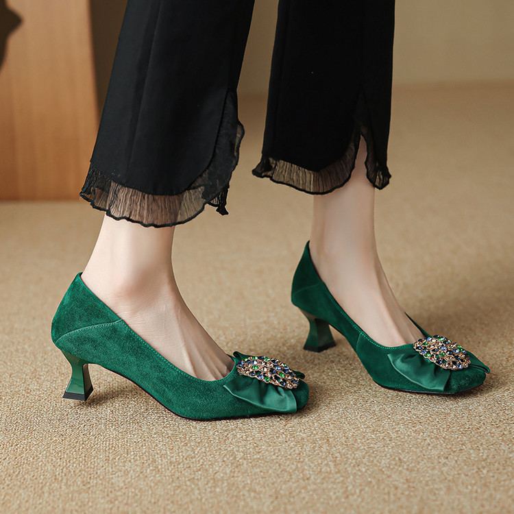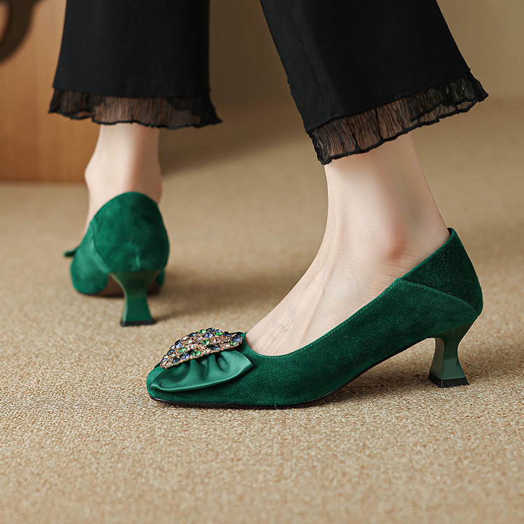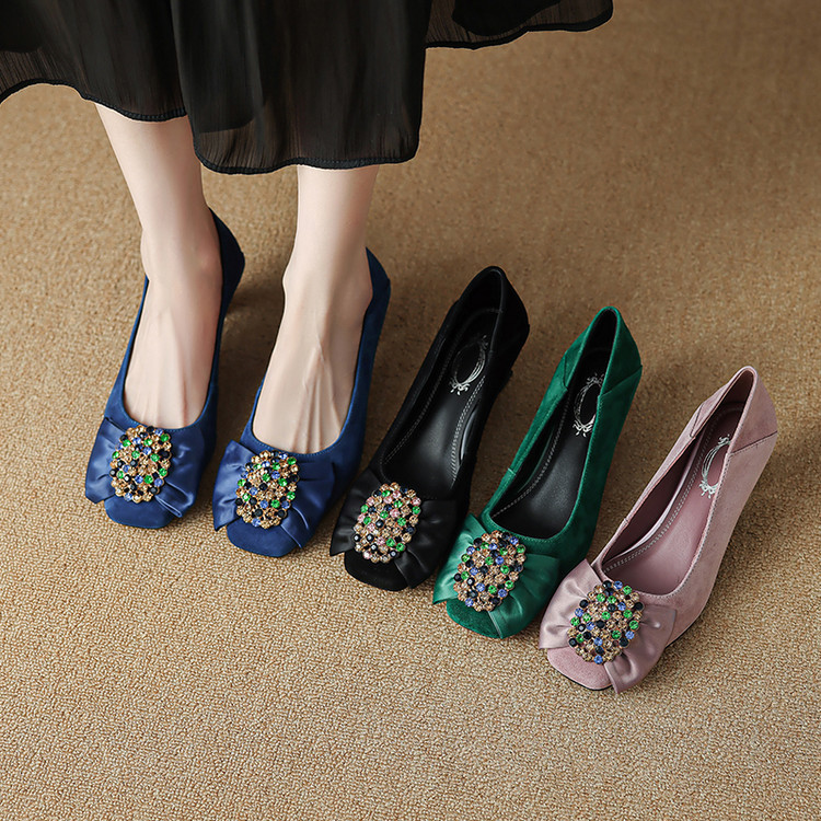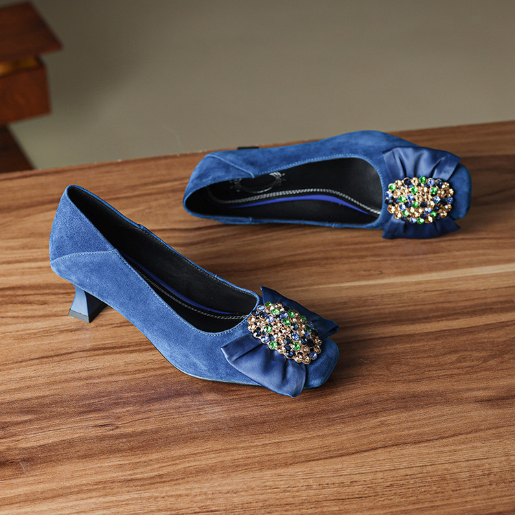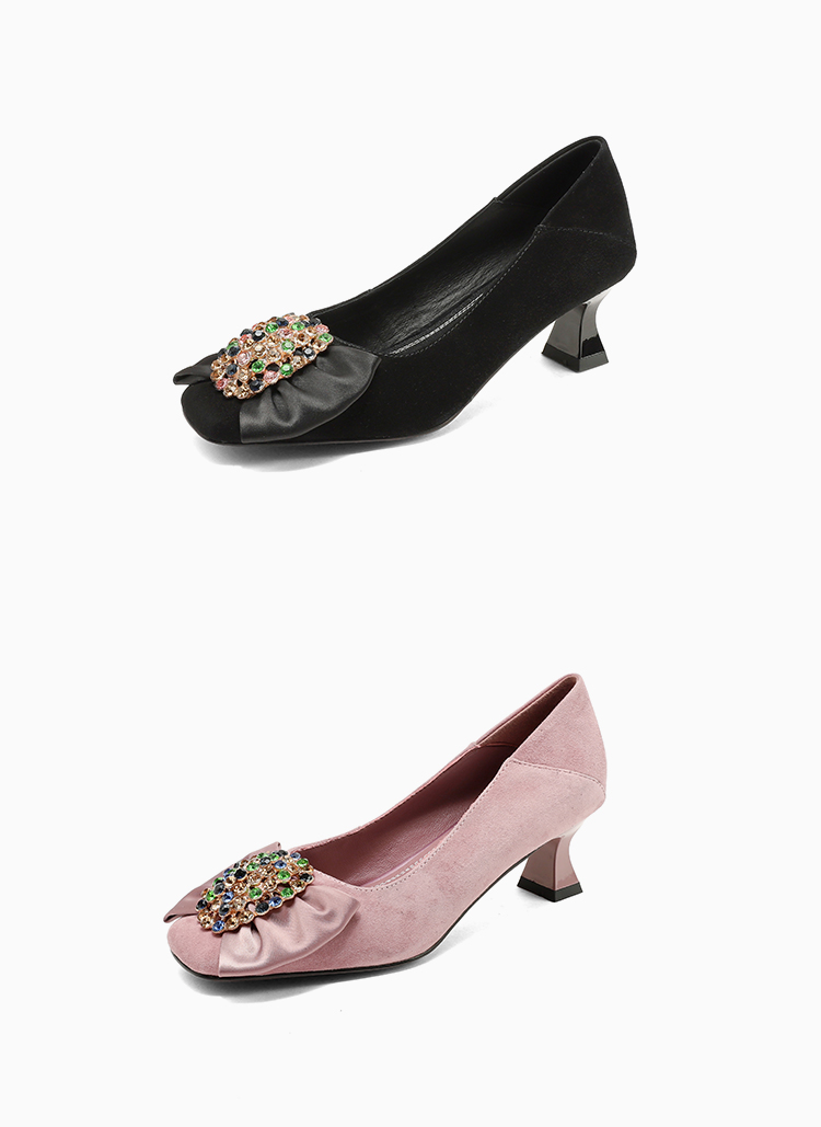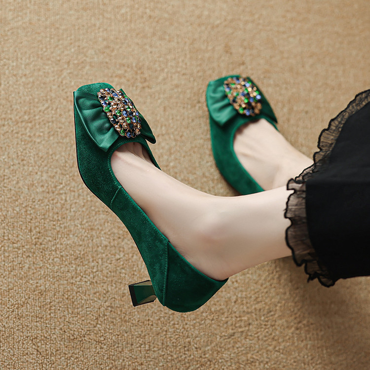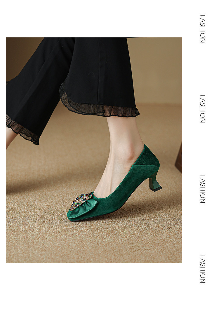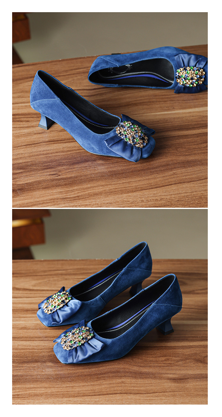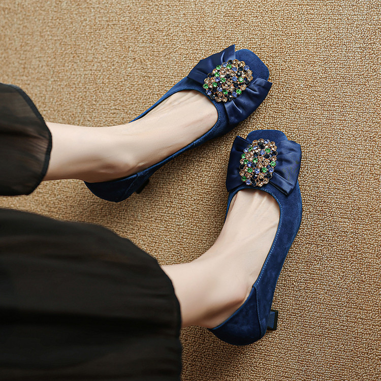 【预售5天】法式蝴蝶结水钻浅口气质单鞋方头女鞋软皮中跟高跟鞋HYT&MS-7429