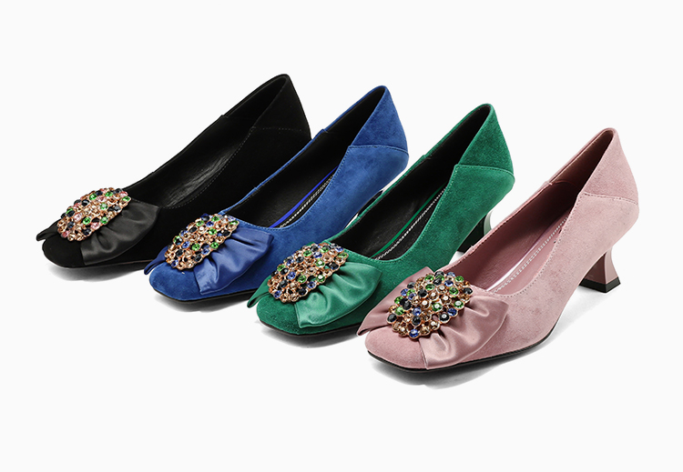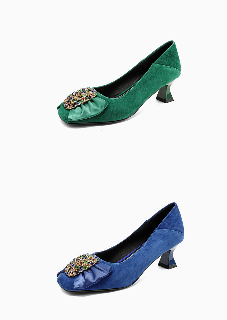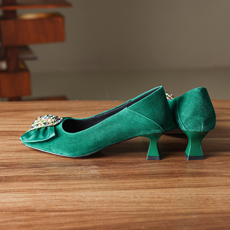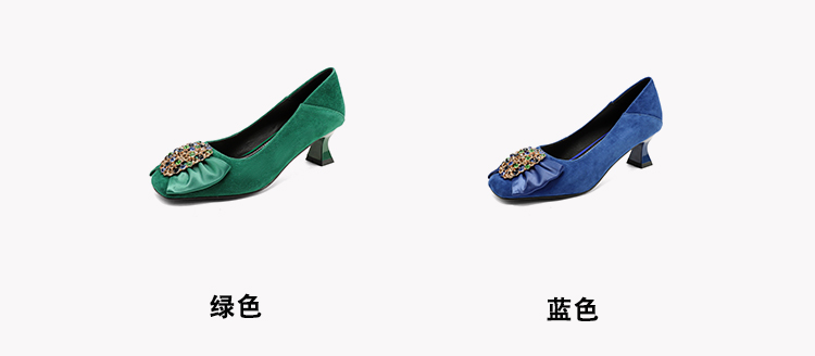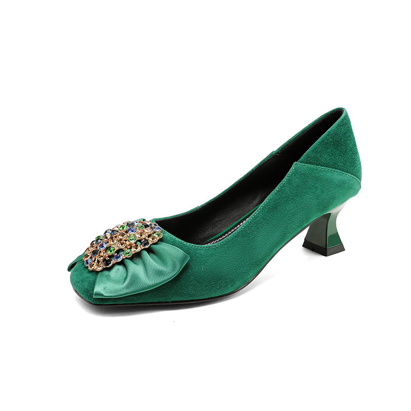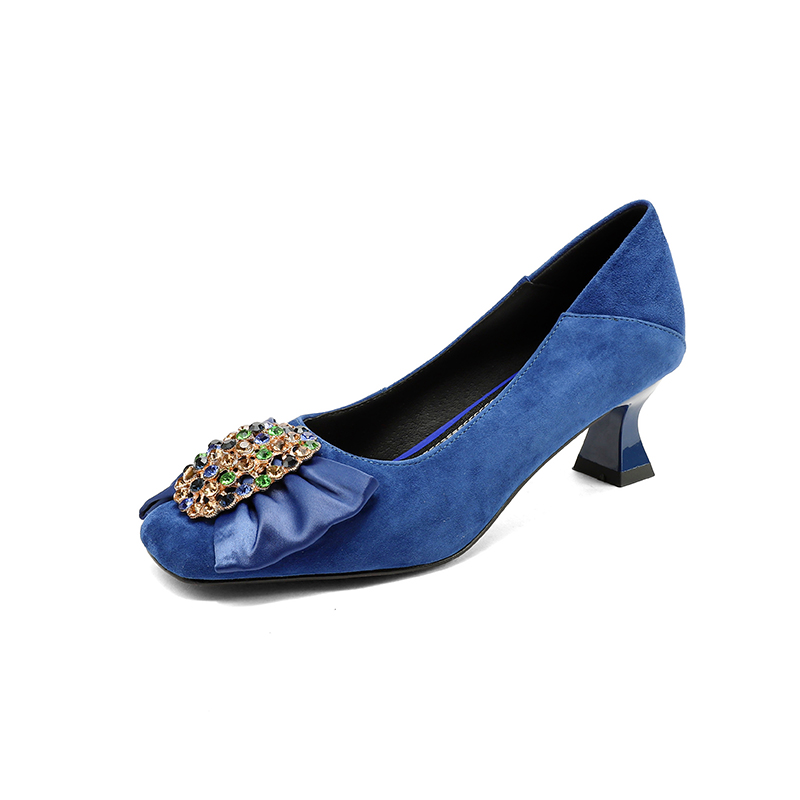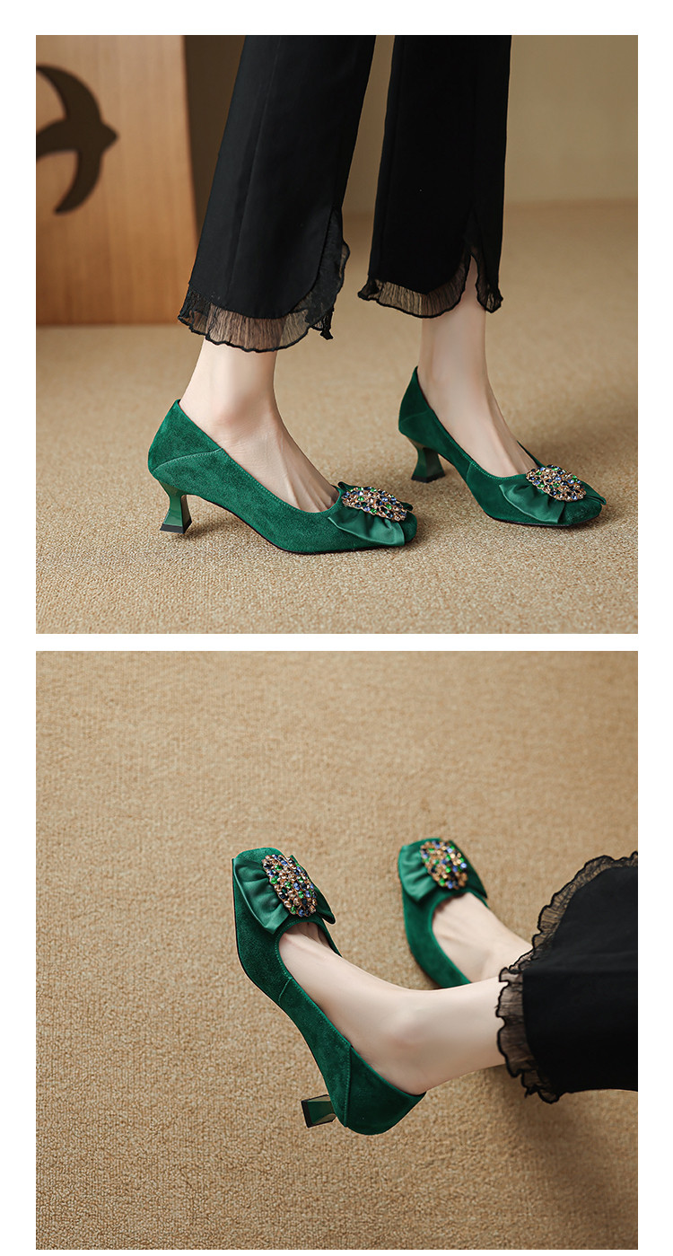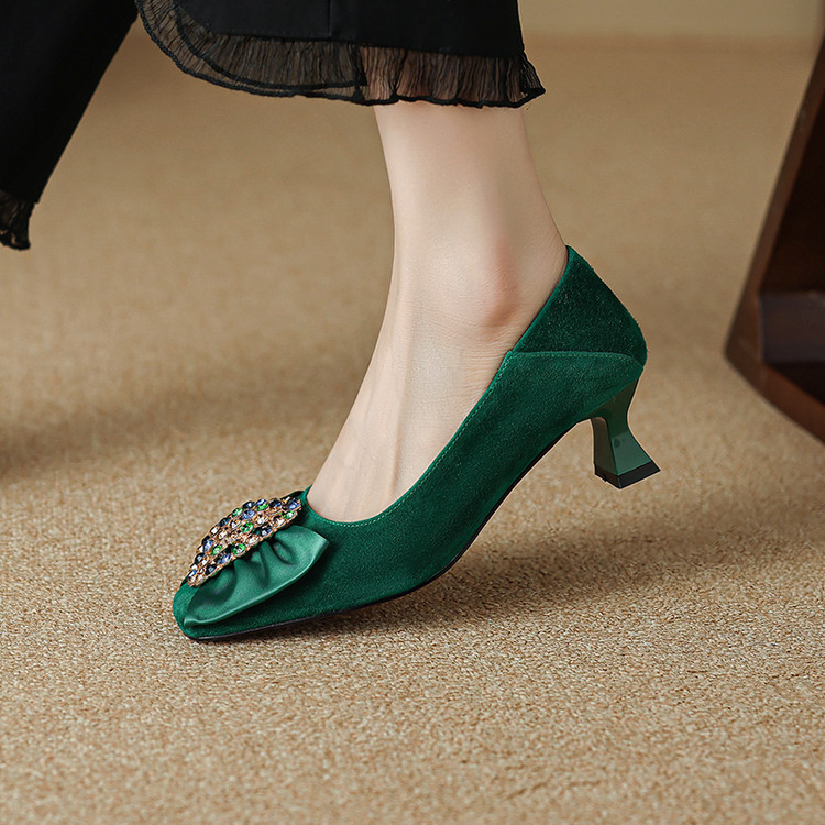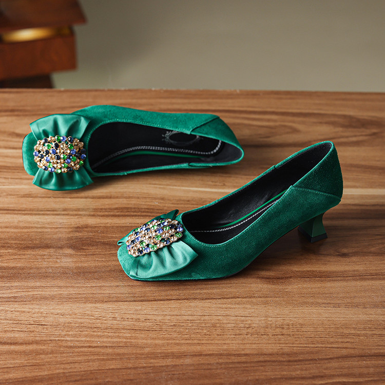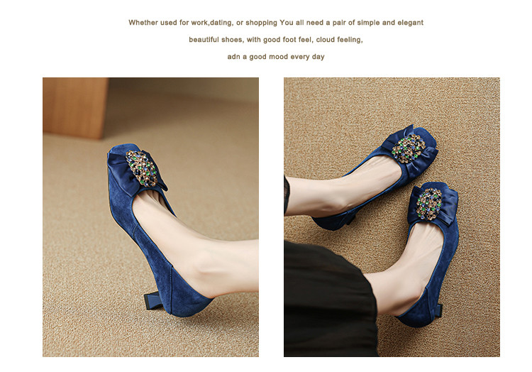 【预售5天】法式蝴蝶结水钻浅口气质单鞋方头女鞋软皮中跟高跟鞋HYT&MS-7429