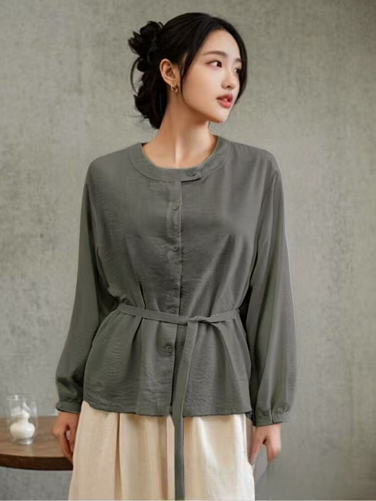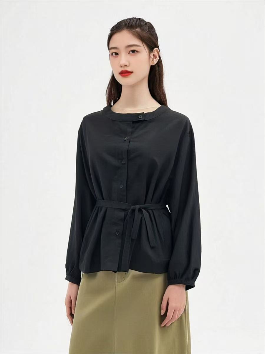 11.11直降到底!!【秋新品】古泥/亦文7765压皱面料系带长袖小衫-喜出