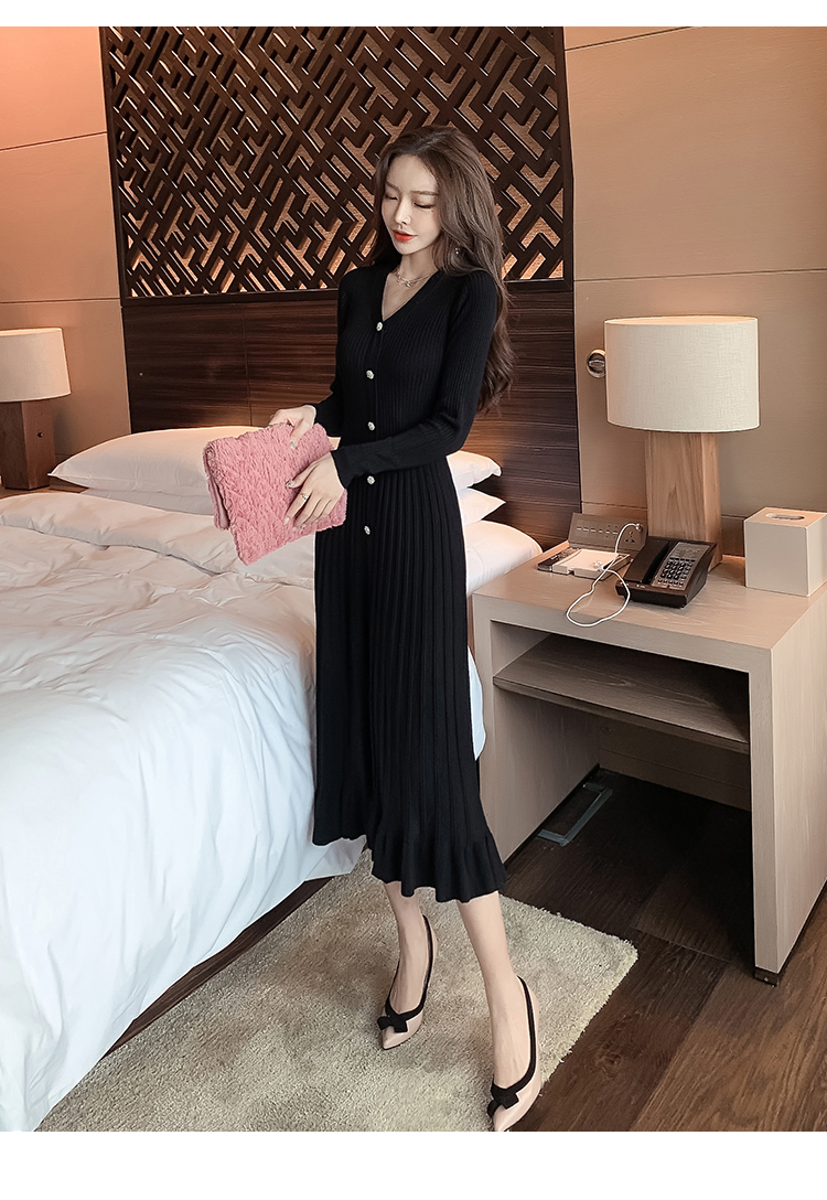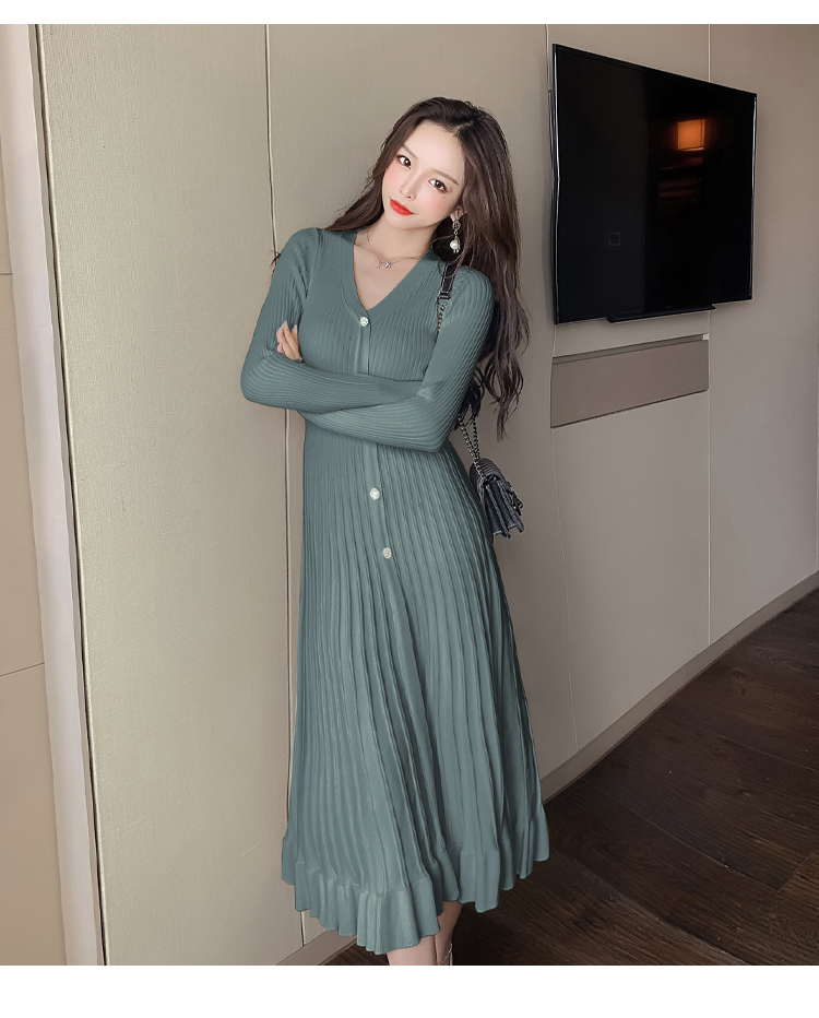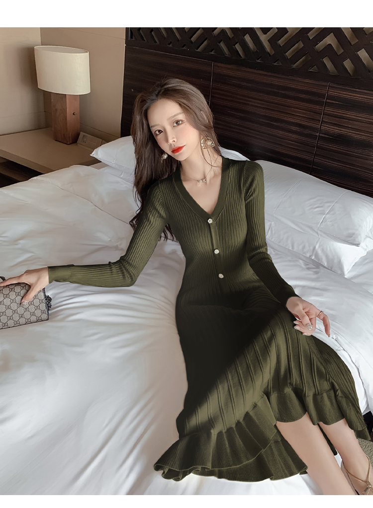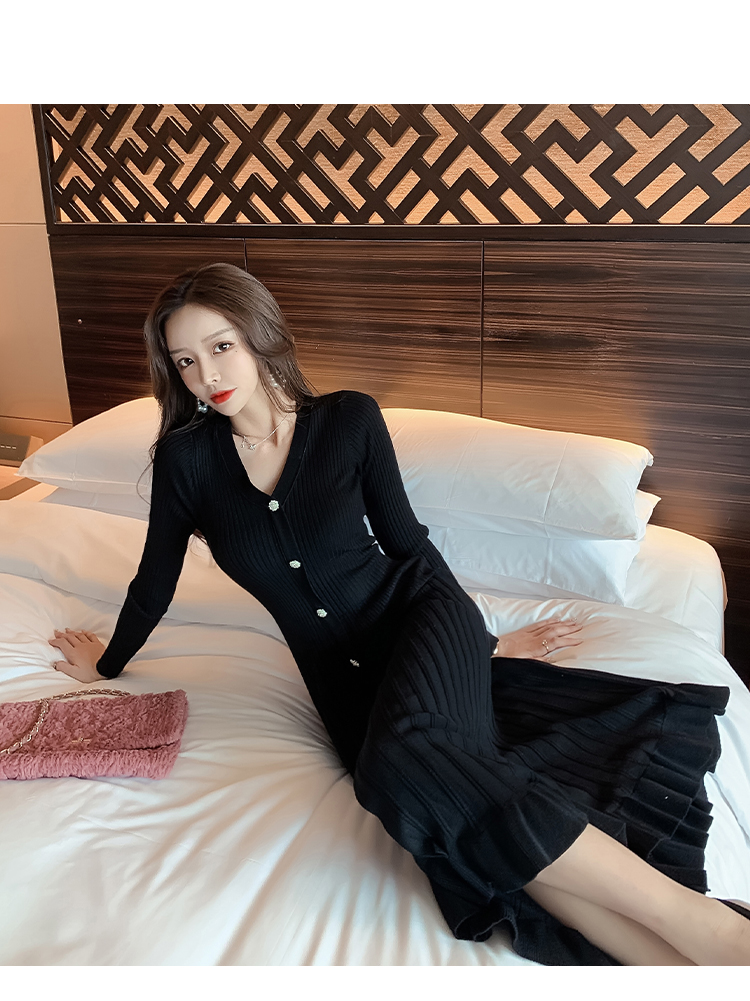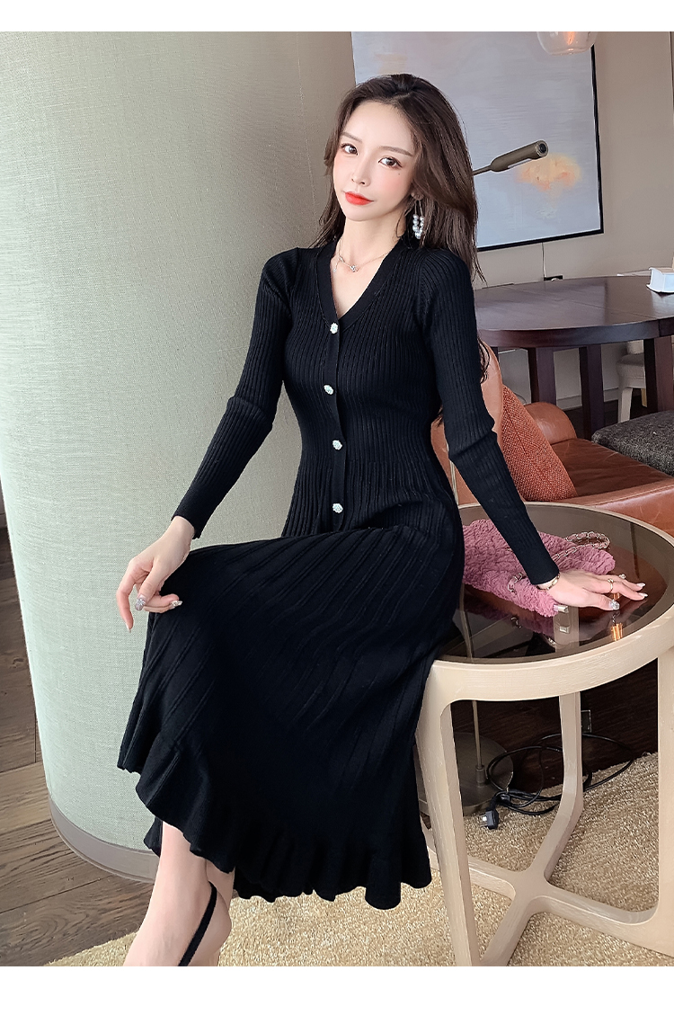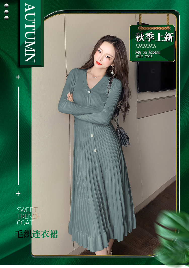 针织毛衣大v领长袖大摆形钻扣连衣裙女 NSM5211