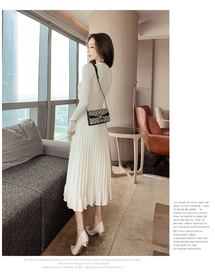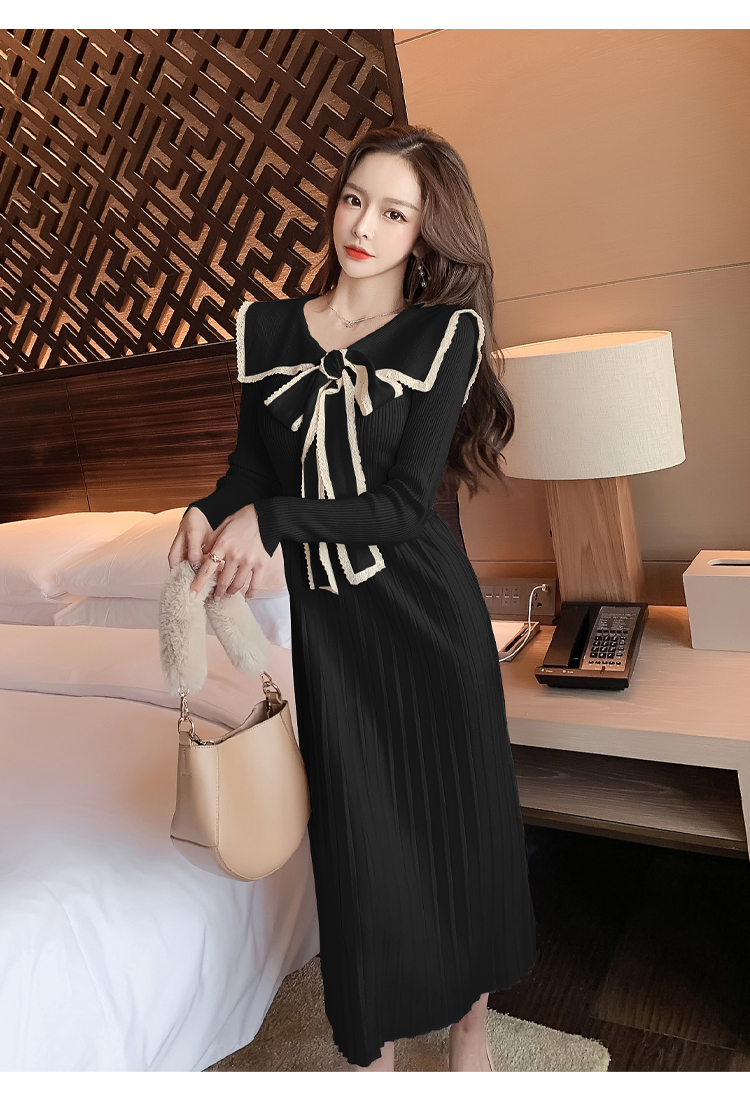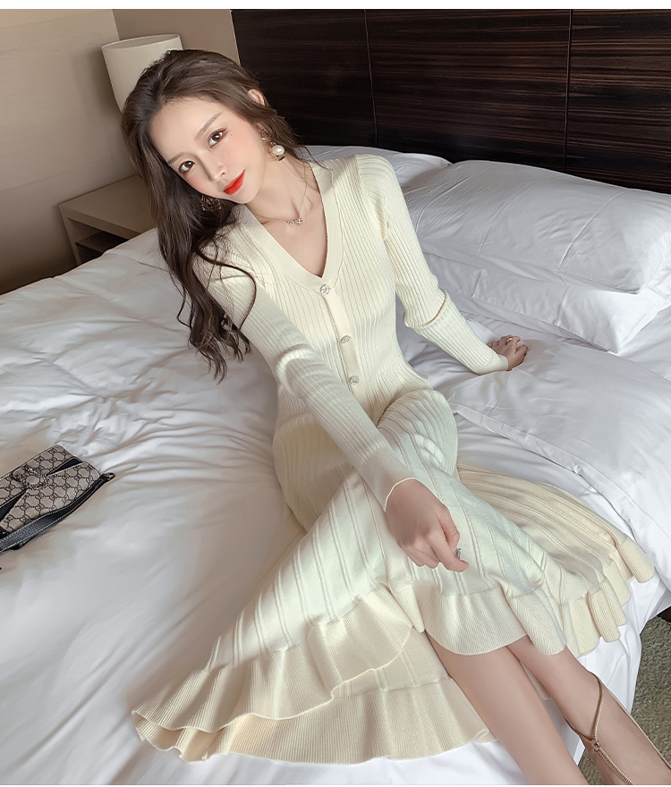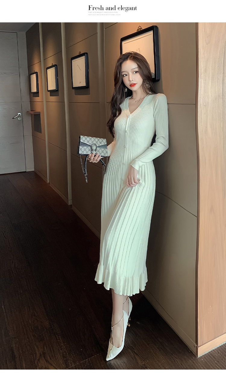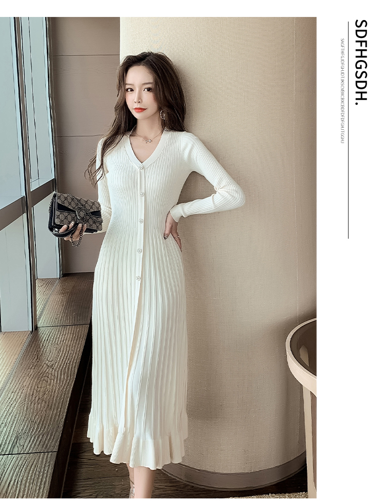 针织毛衣大v领长袖大摆形钻扣连衣裙女 NSM5211
