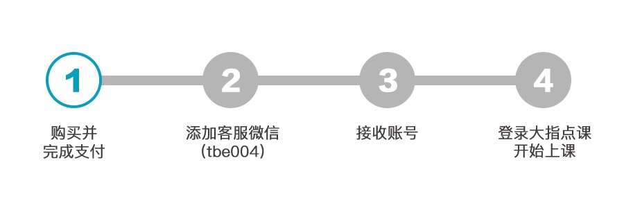2.购物流程:下单并完成支付后请添加外滩小助手微信(微信号tbe004),3个工作日内,外滩小助手会发送大指点课平台的账号密码到您购买时留的微信号,登录即可参与课程。