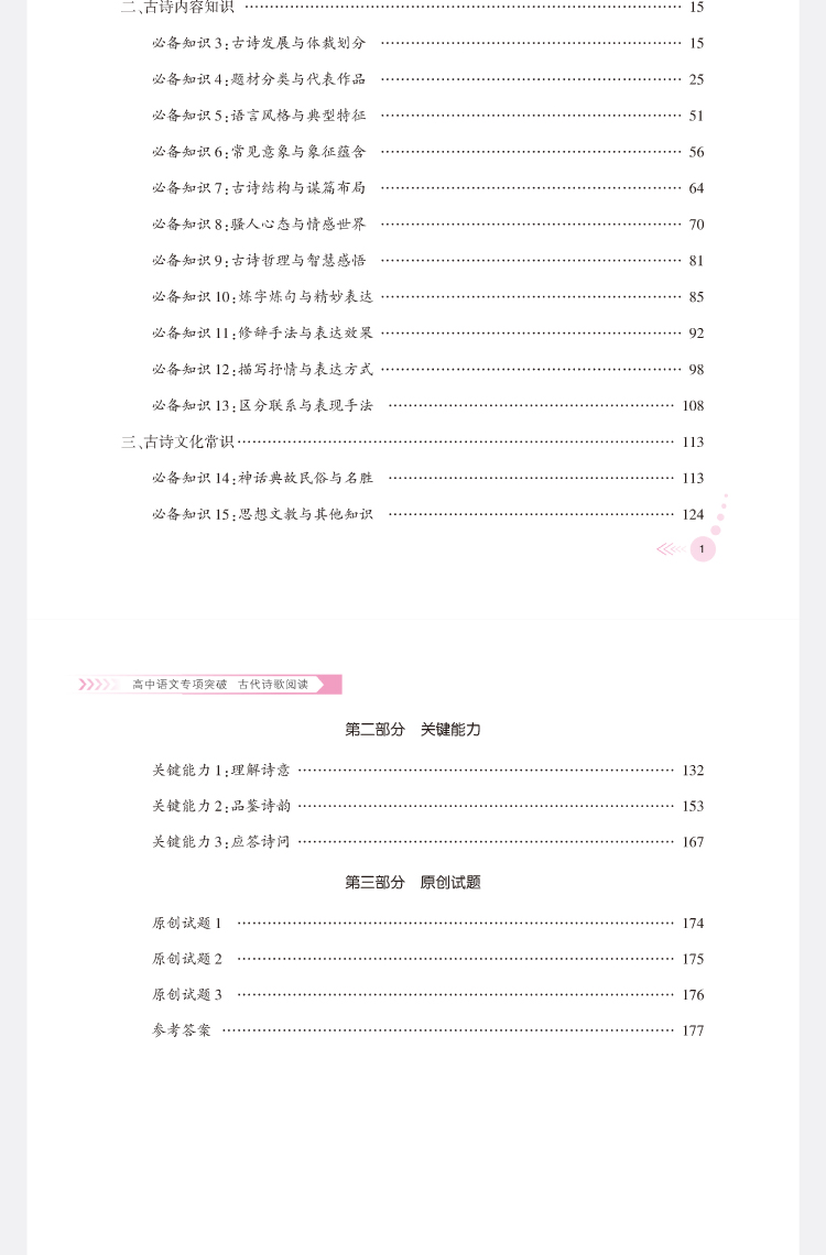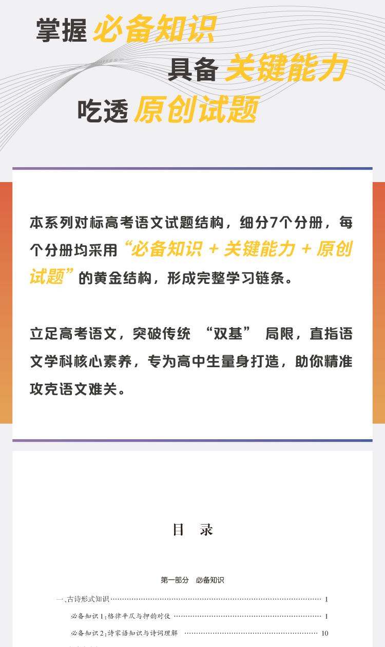按高考试题结构分为7个分册,分别为现代文阅读一、现代文阅读二、古文阅读、古诗阅读、名篇名句默写、语言文字运用、写作。