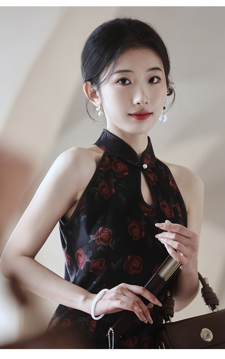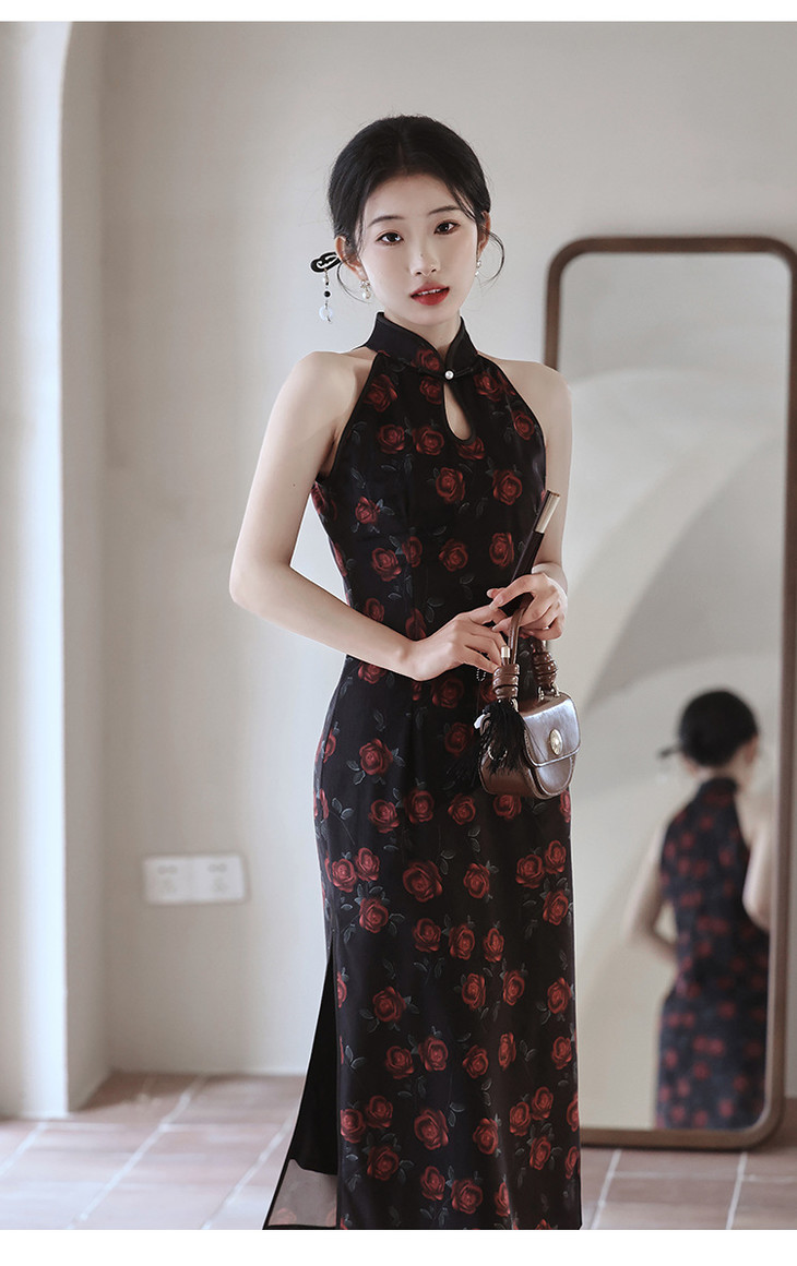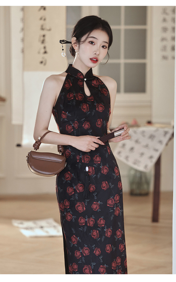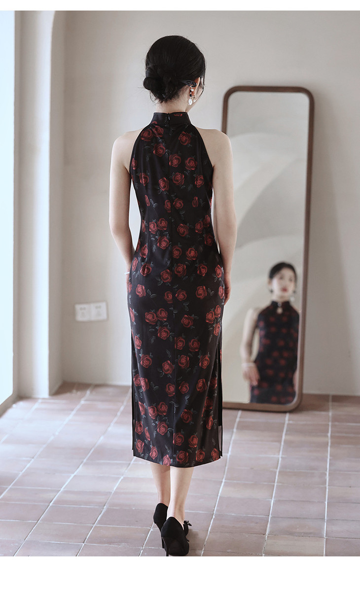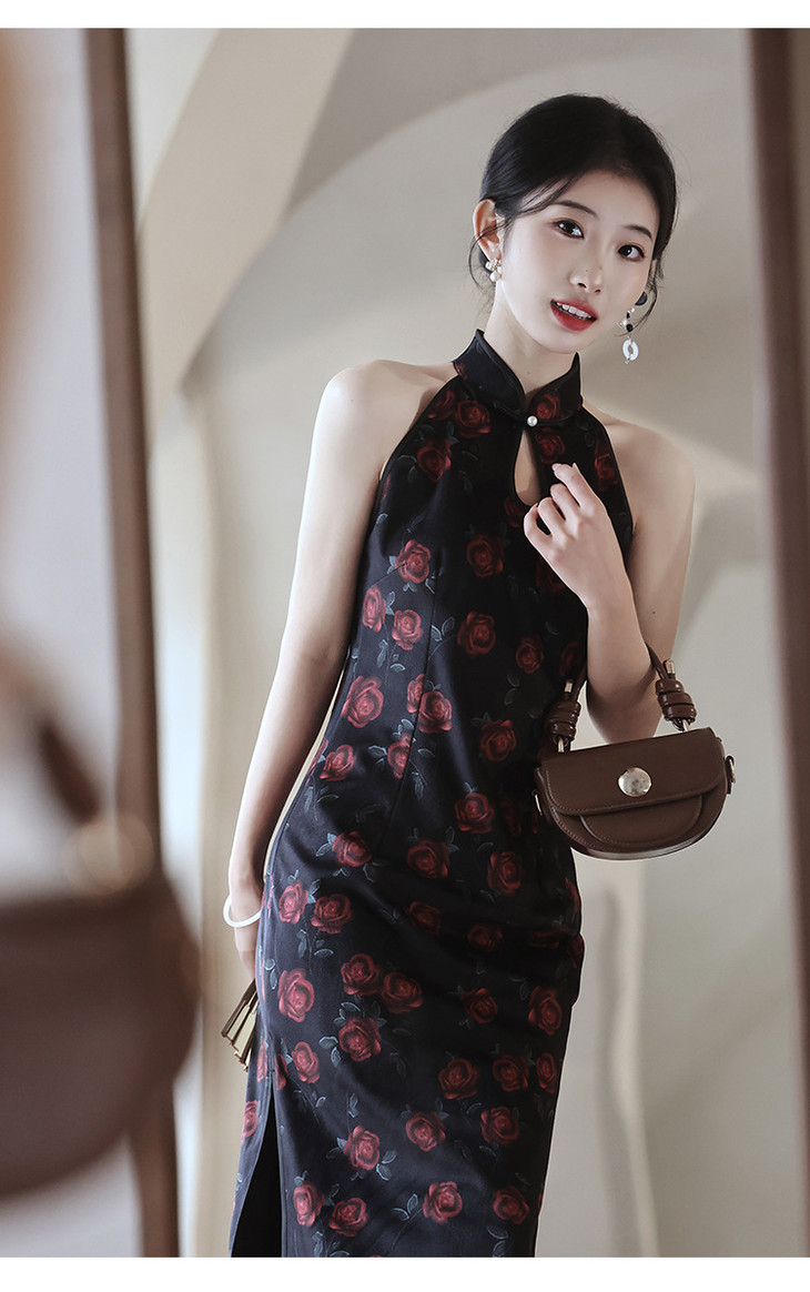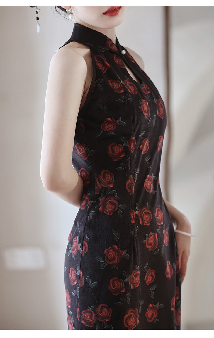 改良新中式,黑色无袖玫瑰旗袍LSB2918