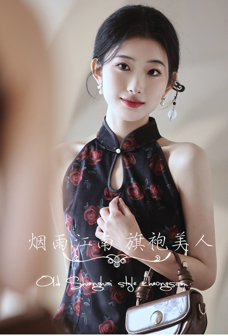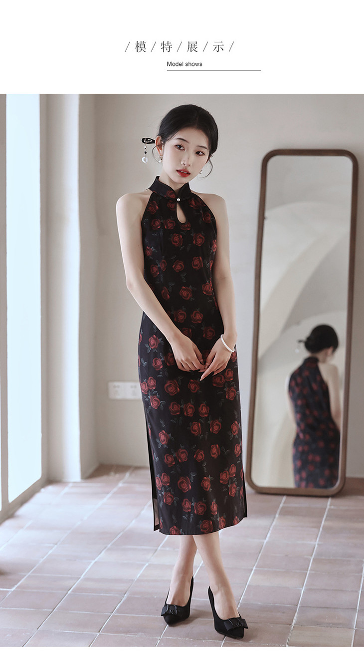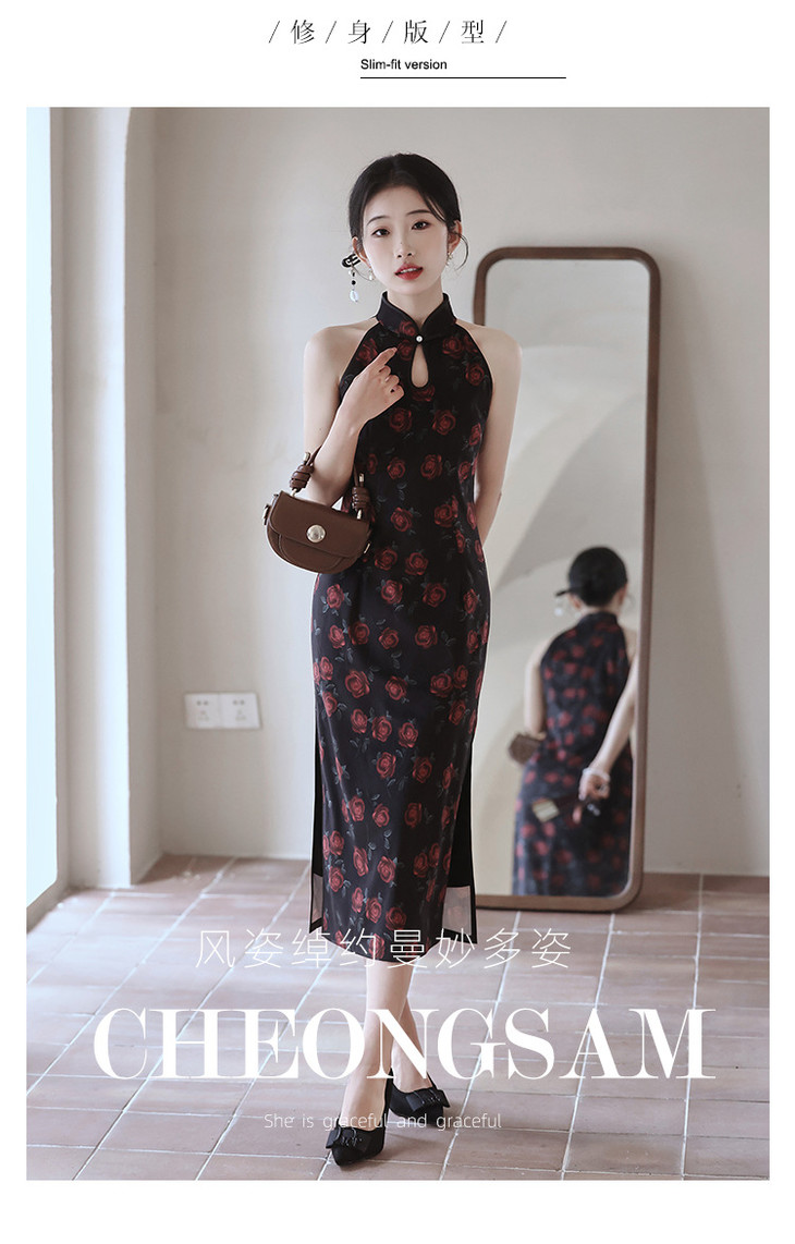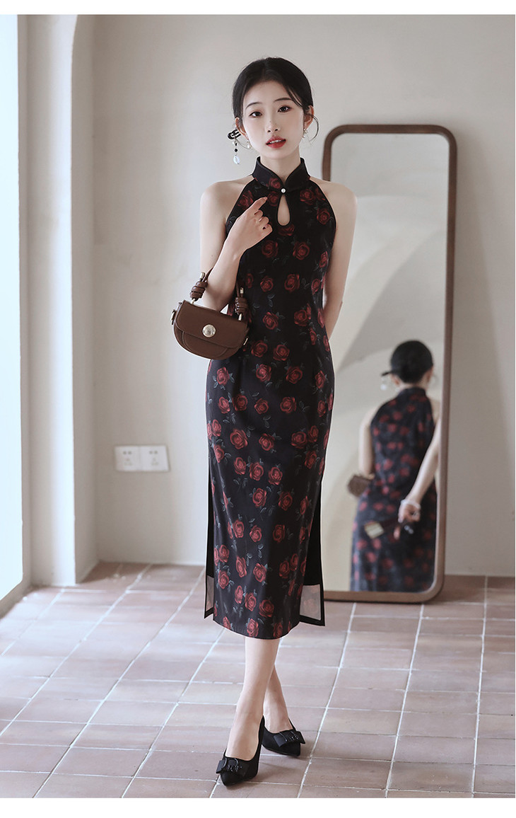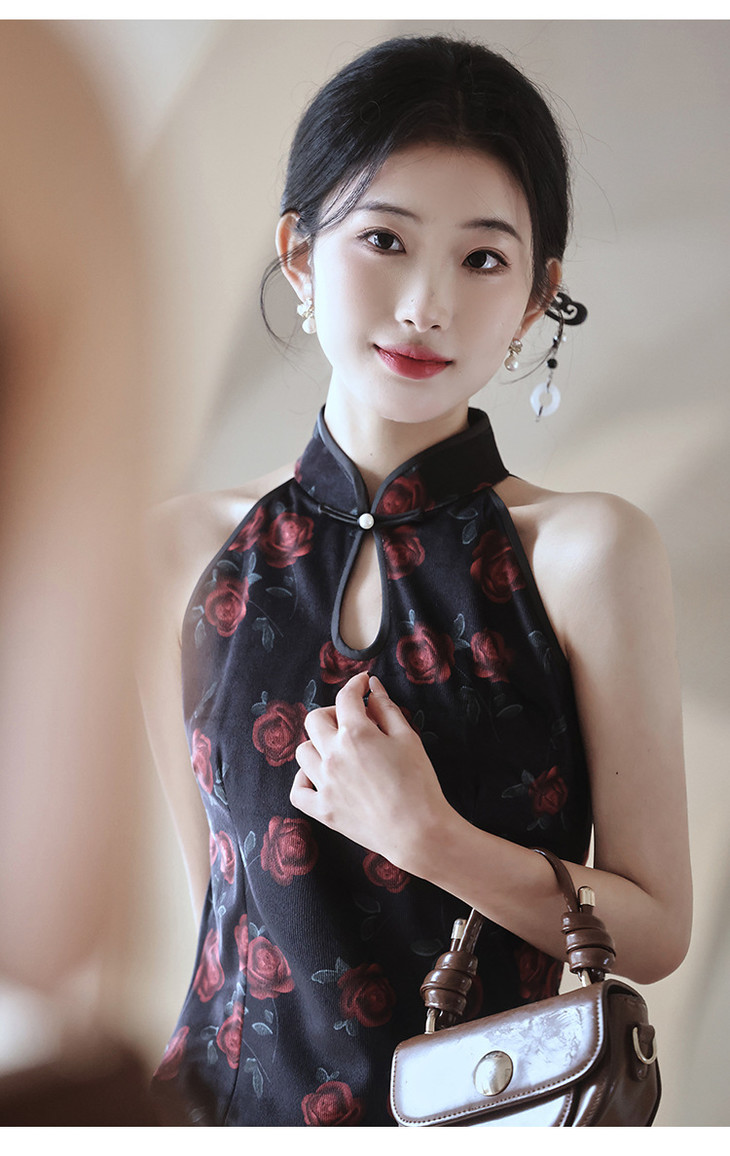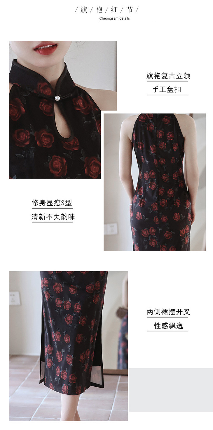 改良新中式,黑色无袖玫瑰旗袍LSB2918