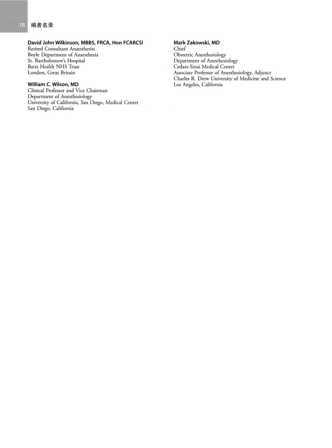 主译:左明章,教授、主任医师,北京医院麻醉科首席专家,北京大学医学部教授,中华医学会麻醉学分会委员、气道管理学组组长,历任中国医师协会麻醉学医师分会副会长、现任常委,中国医促会区域麻醉学会副主任委员,北京医师协会麻醉专科医师分会会长,北京医学会麻醉分会副主任委员和气道管理学组组长。《中华麻醉学杂志》和《临床麻醉学杂志》常务编委。
