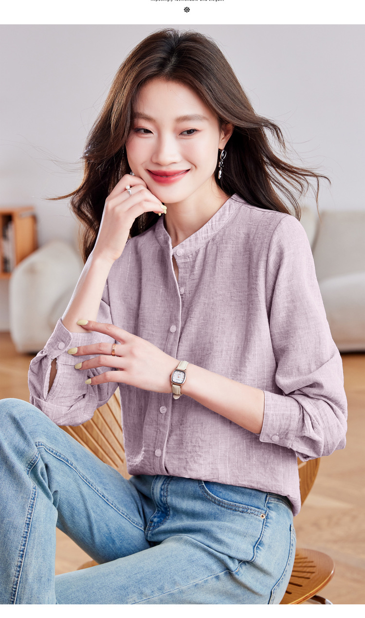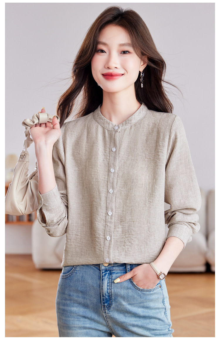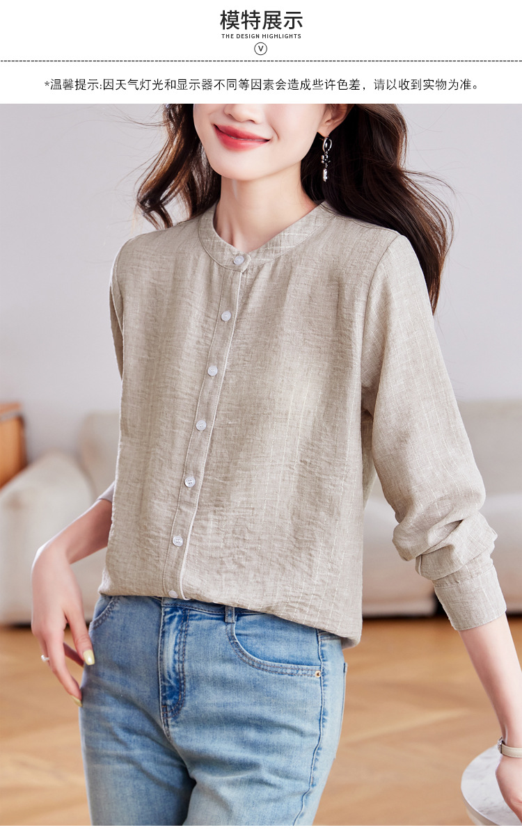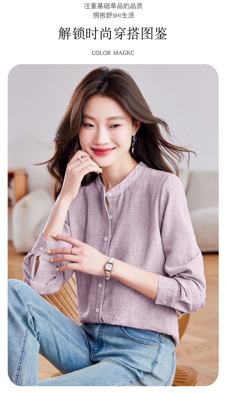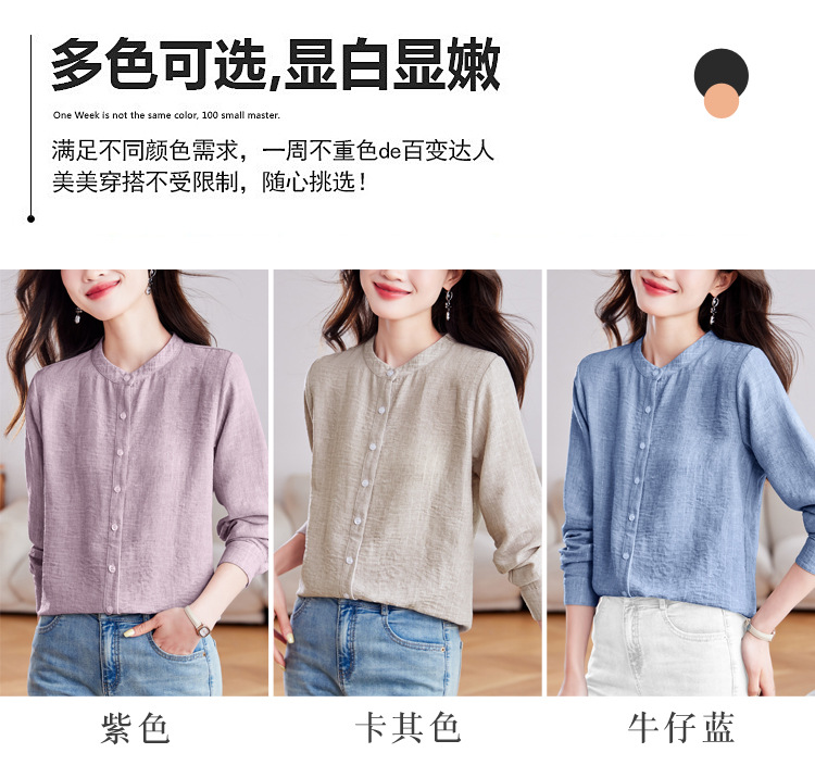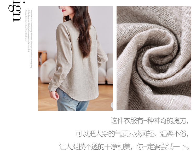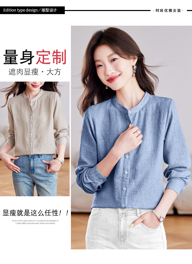 KQL2025春秋高端银丝仿麻长袖单排扣立领宽松显瘦纯色女装衬衫上衣