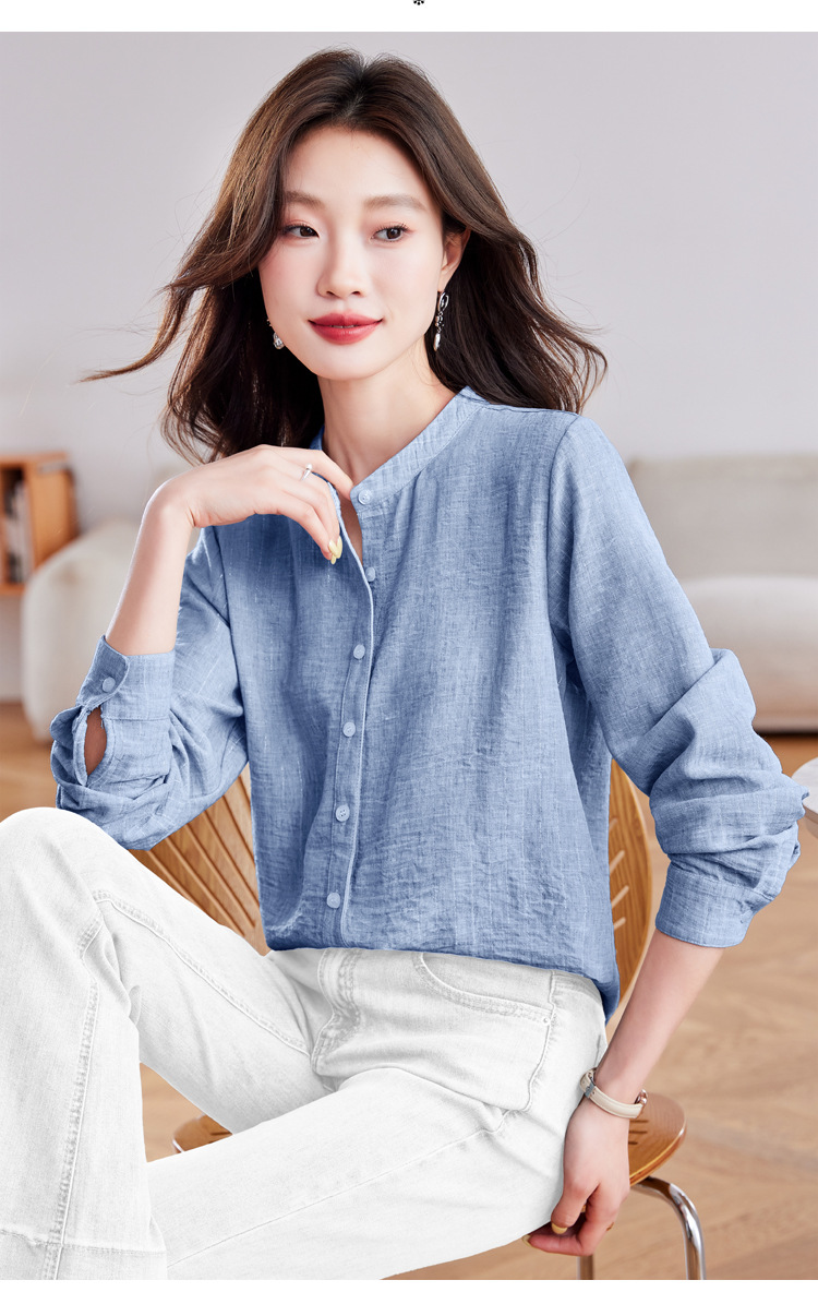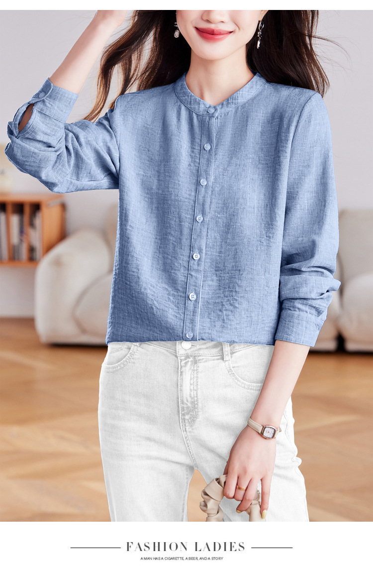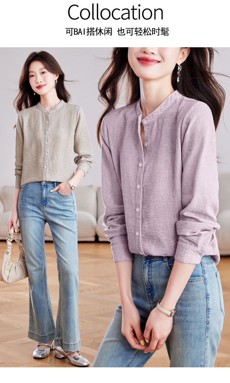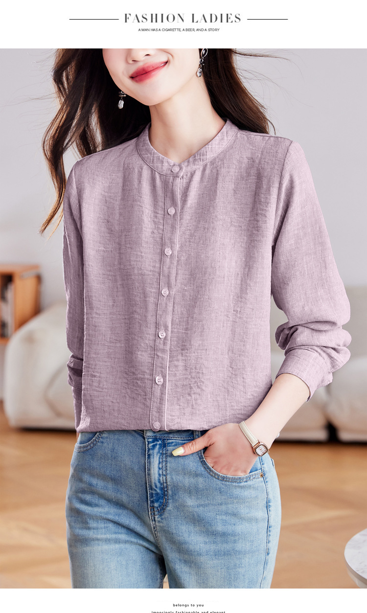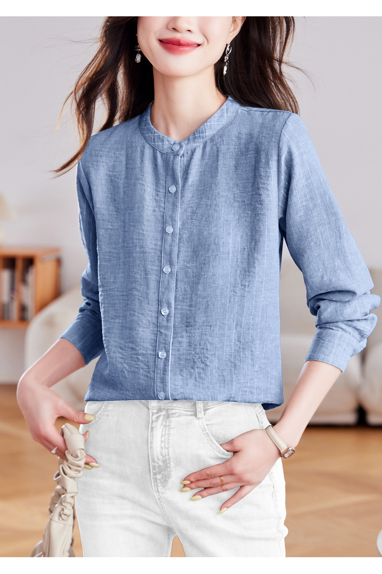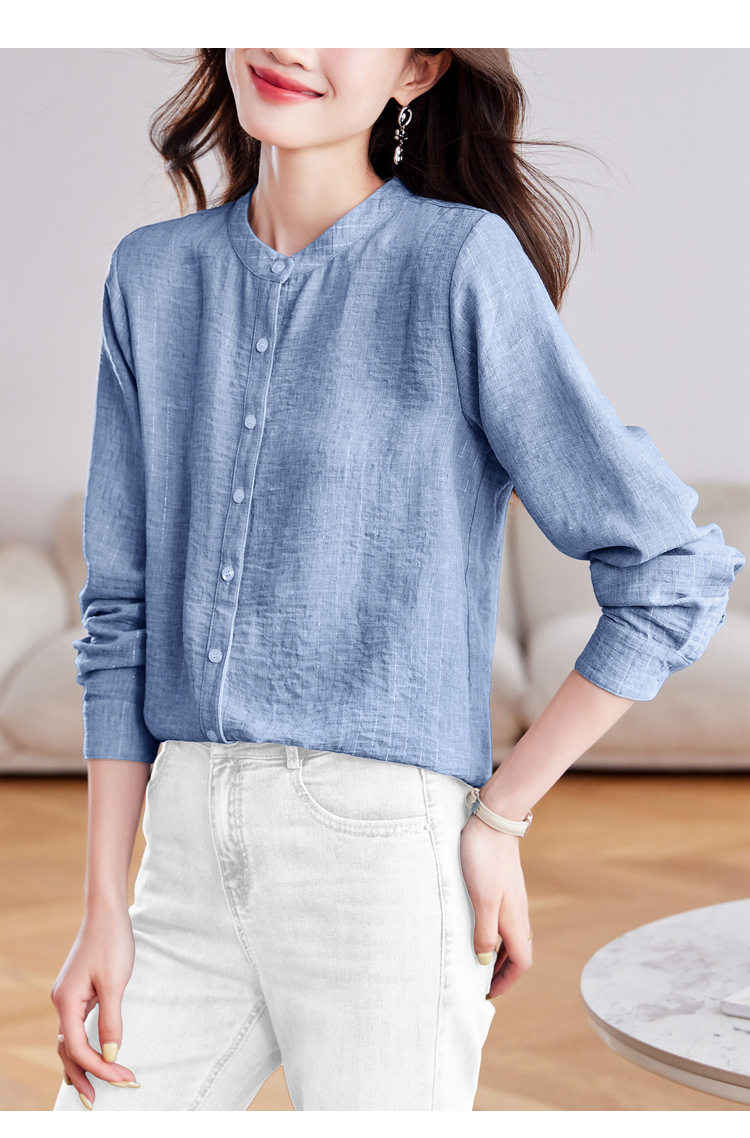 KQL2025春秋高端银丝仿麻长袖单排扣立领宽松显瘦纯色女装衬衫上衣
